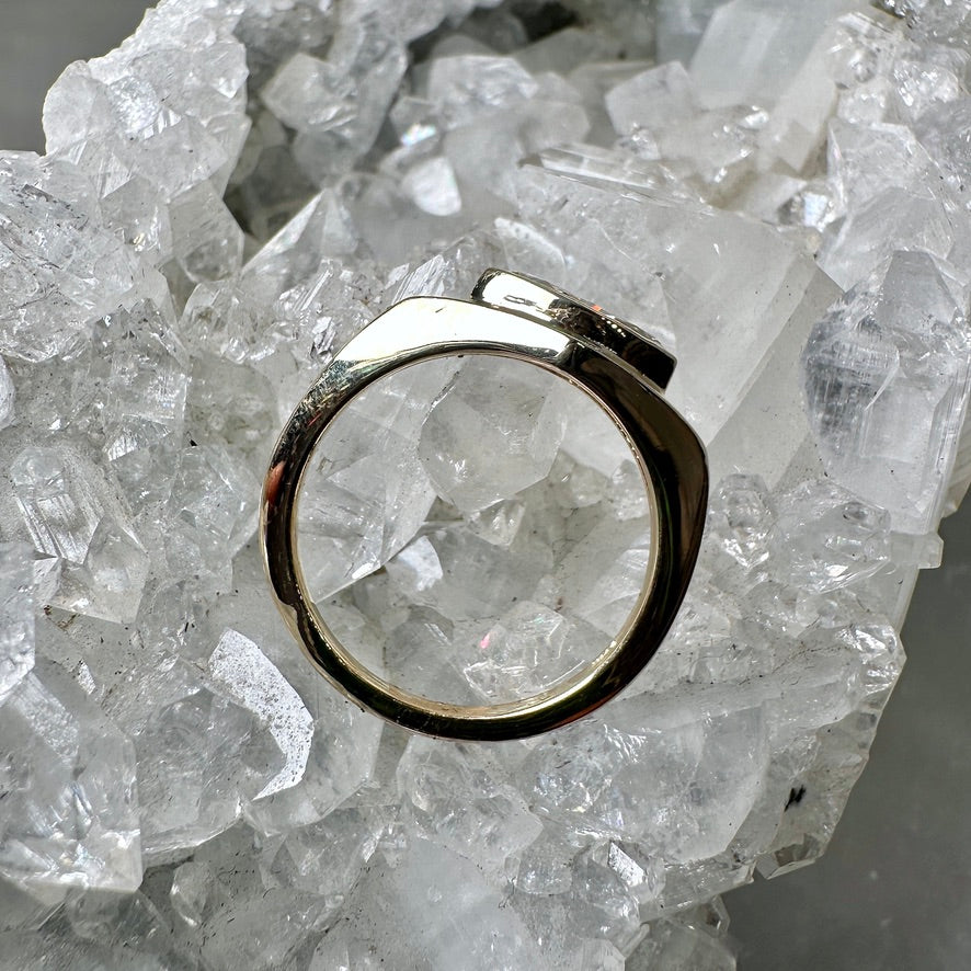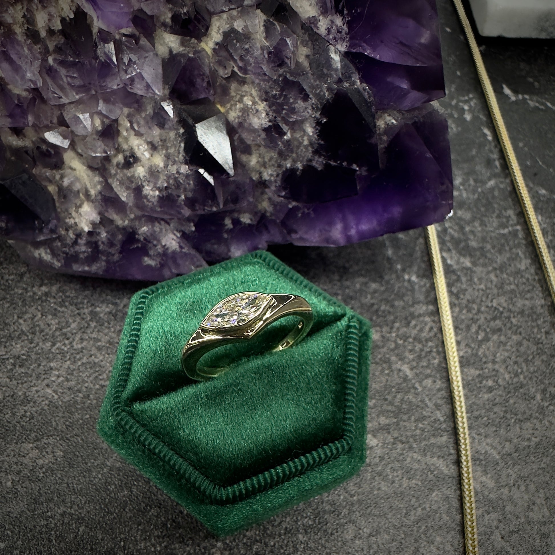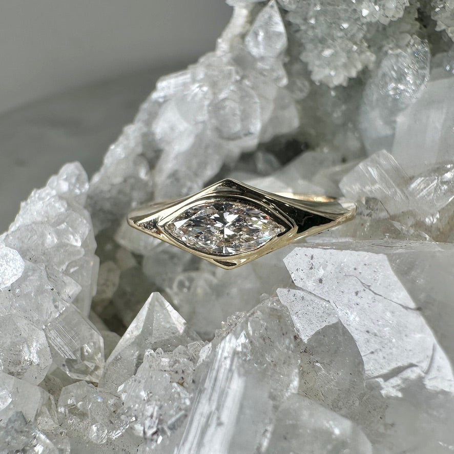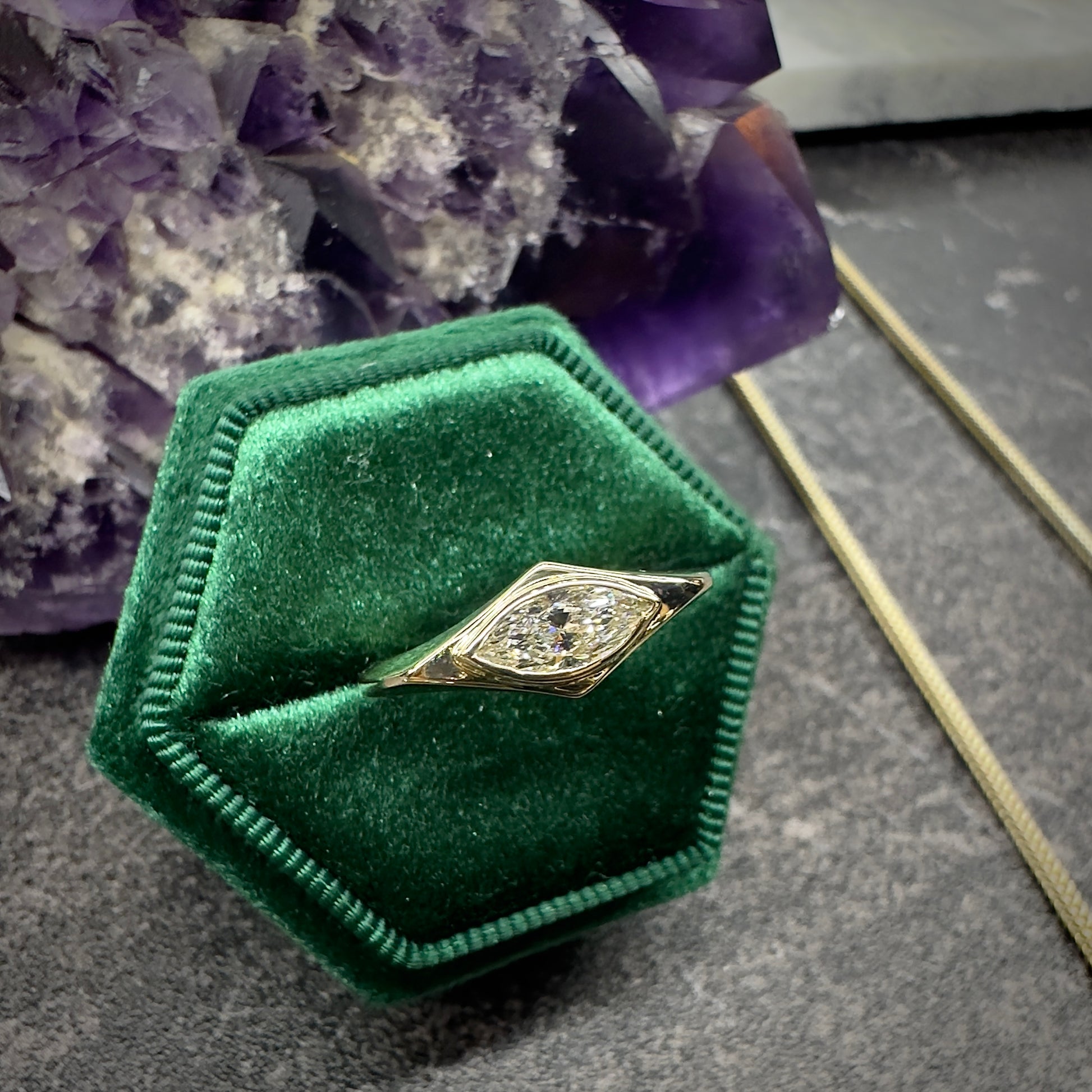 Indulge in the irresistible beauty of this exquisite ring, featuring a stunning .60 carat Lab Grown diamond in the classic Marquise shape. With a pristine F color and VS2 clarity, this ring is a true showstopper. Crafted from 100% recycled 14k yellow gold, this piece radiates both luxury and eco-friendliness. The timeless signet style design, featuring a sleek geometric design, exudes sophistication. Whether for an engagement, commitment, or everyday wear, this ring is the perfect choice. The bezel setting ensures maximum security while maintaining a chic minimalist look. Currently a size 7, this ring can be resized upon purchase for a perfect fit.