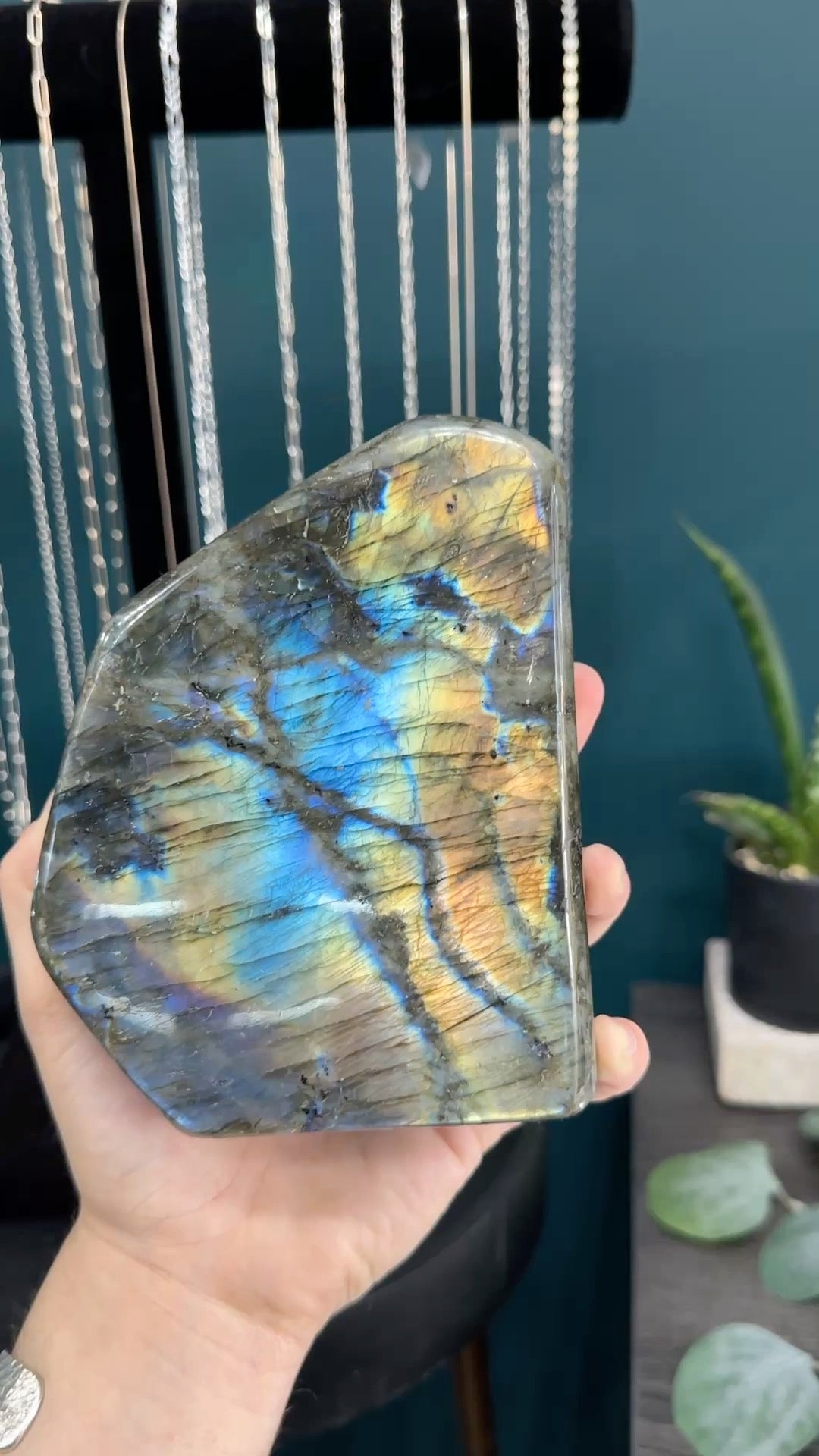 This stunning rainbow labradorite captivates with its shimmering beauty! A vivid streak of lavender purple blends with yellow, orange, and blue hues as light dances across its surface. Sourced from Madagascar, this stone perfectly showcases the enchanting qualities that make labradorite so cherished.