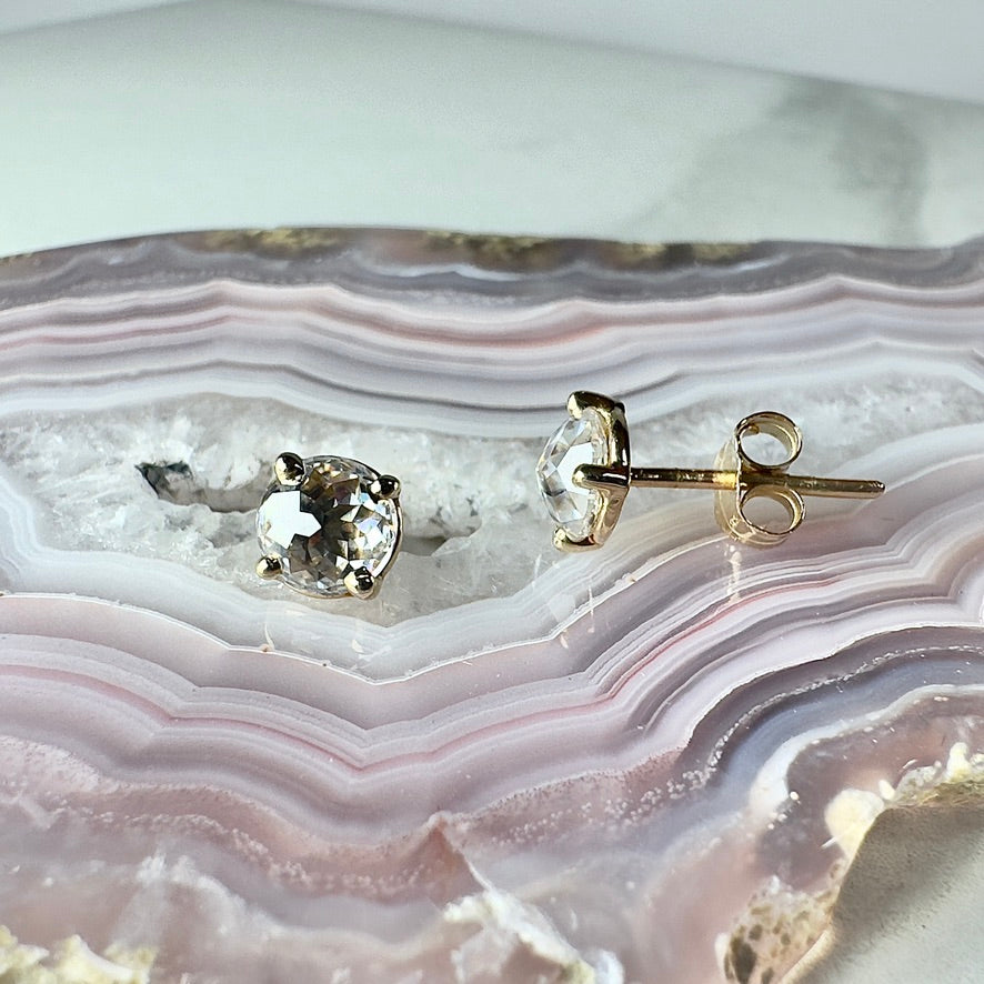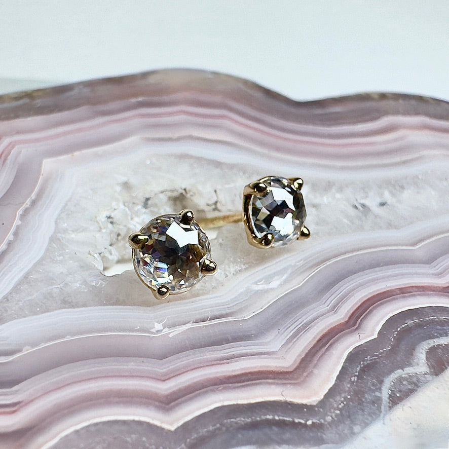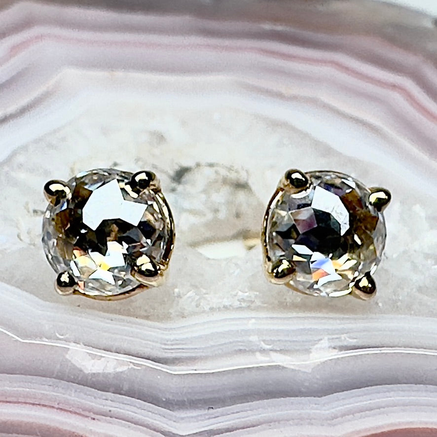 Since naturally occurring Moissanite is exceedingly rare, nearly all of the stones on the market are lab grown. Because of this, it is much more affordable compared to both natural and lab grown diamonds. It has a high refractive index, meaning it reflects a lot of light out of the stone, making it very sparkly even in dim light. It has an additional benefit of being a very hard gemstone, clocking in a 9.25 out of 10 on the Mohs hardness scale. The rose cut Moissanites in these stud earrings are no exception!