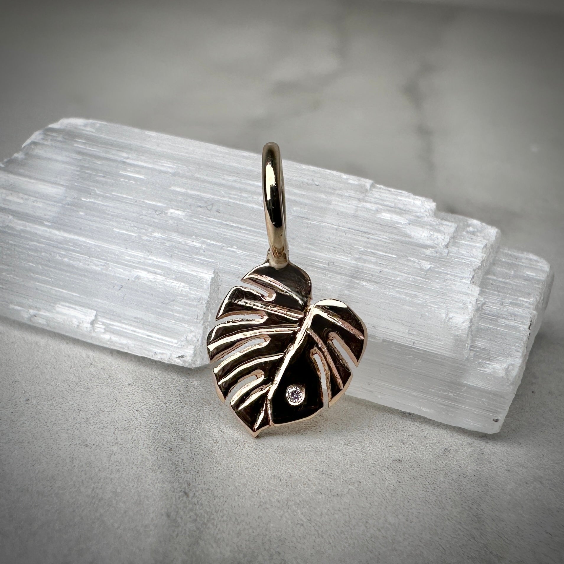 Monstera Leaf Charm with a Diamond | 14k Yellow Gold