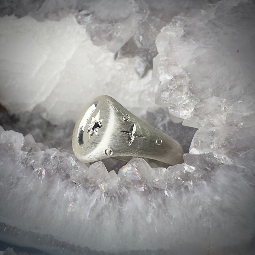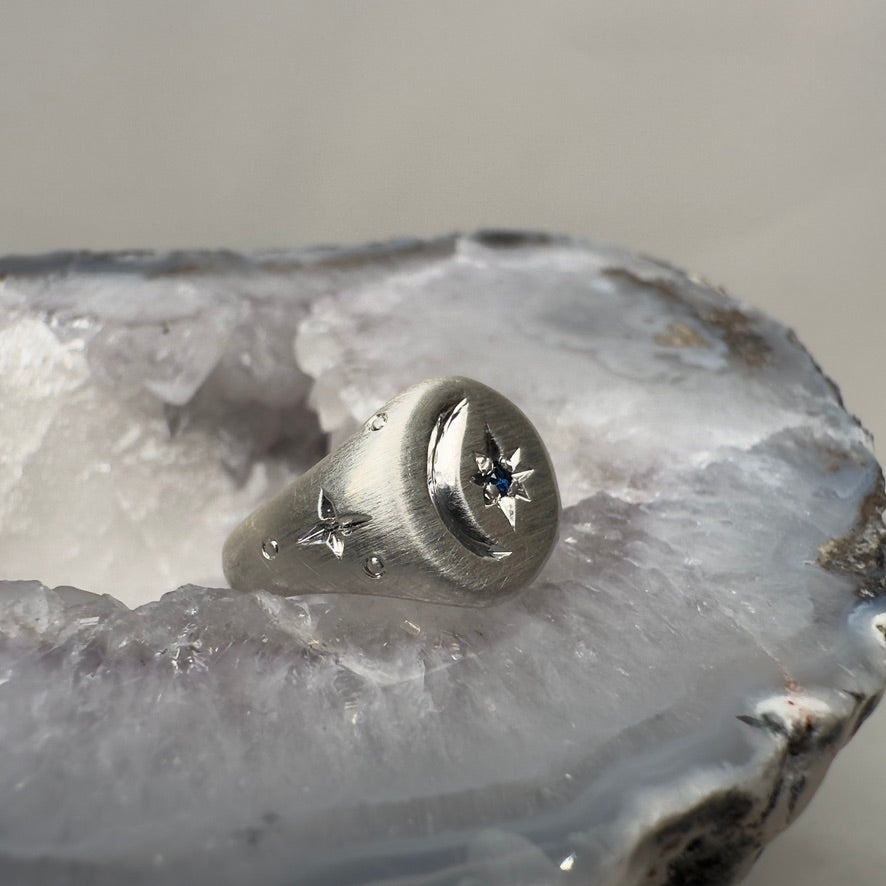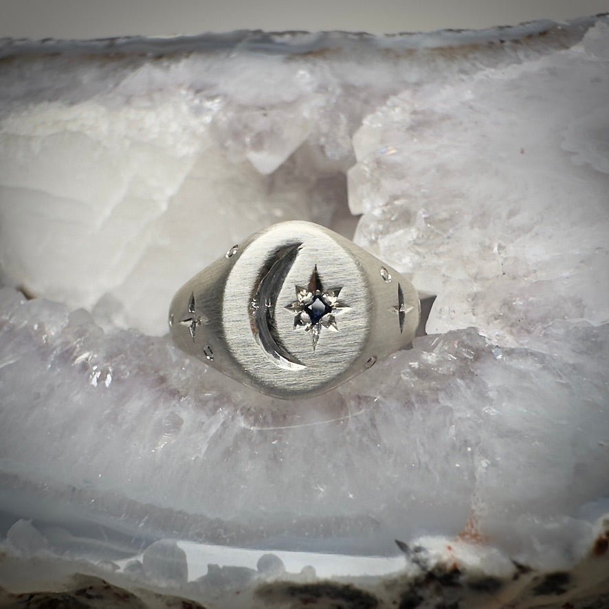Embrace your love for all things celestial with this elegant and simple signet ring! It features a star-set blue sapphire, and is surrounded by a hand engraved crescent moon and stars. It is currently a ring size 6 and ready to be resized upon purchase if necessary. This ring, as with all of our pieces, is made with 100% recycled precious metals.