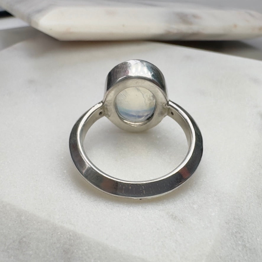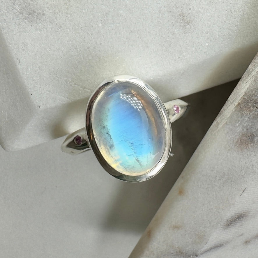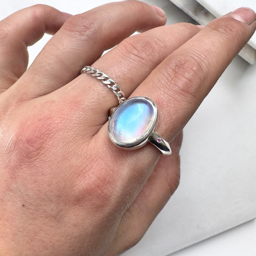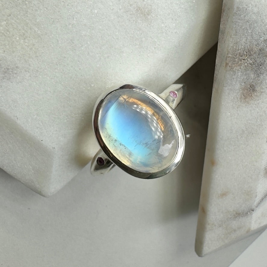 This stunning blue Moonstone is truly one of our favorite stones that has come through the shop. It weighs 10.40 carats, and has a vivid blue sheen that illuminates in many different kinds of light. Two small pink sapphires accent it on either side. They were flush set into the band, and add the smallest pinprick of contrasting color. The silver was brush finished, and kept bright to allow the stones to shine as bright as they wish.