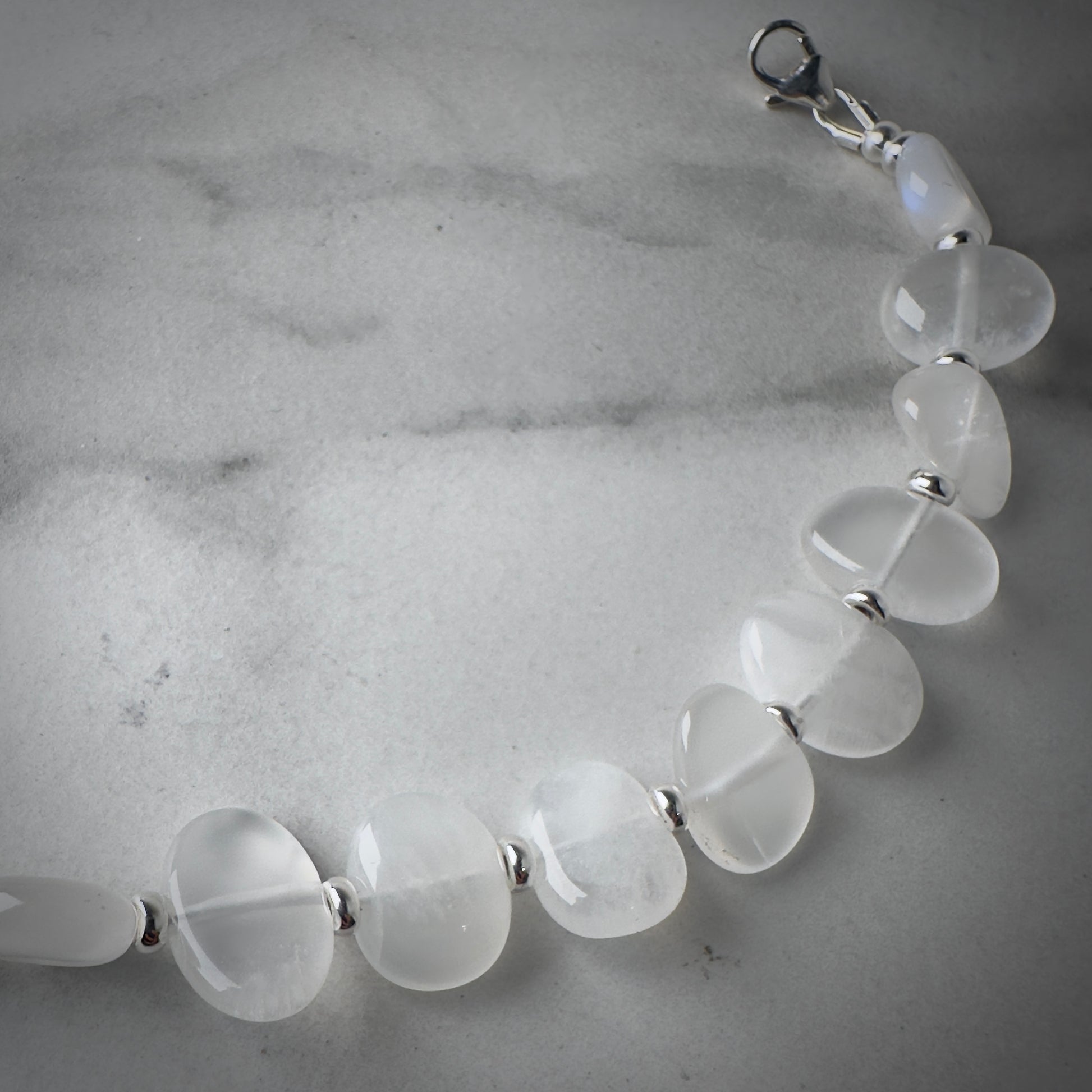 This bracelet features pebble shaped moonstone beads interspaced with sterling silver round beads. The beads are strung on a stainless steel cable, making it extra strong and able to withstand daily wear. This beaded bracelet it perfect for mixing and matching with our other bracelets for a fun day time or night time look.