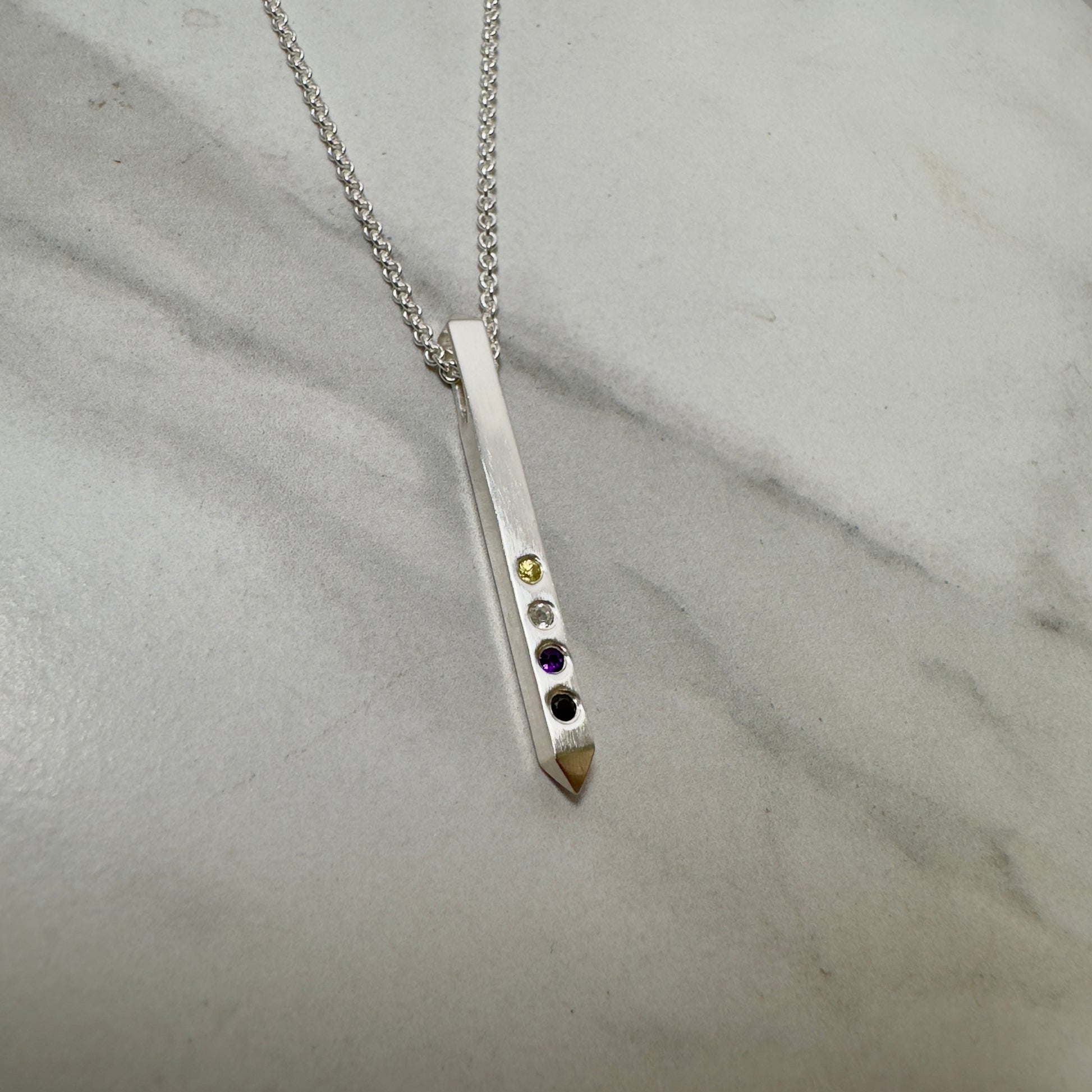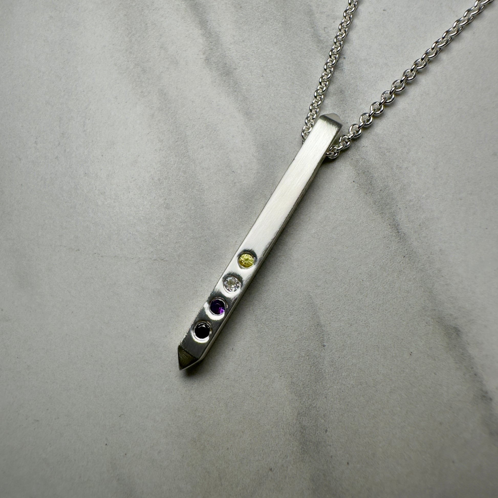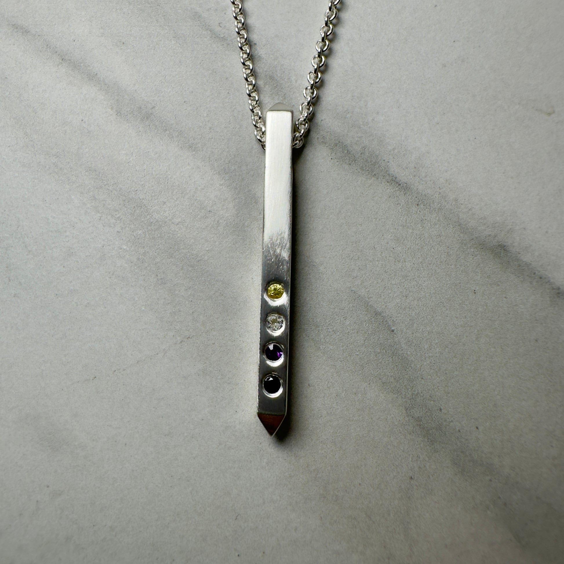 This pendant Features four flush-set gemstones, which correspond to a stripe in the Nonbinary pride flag. The natural gemstones in this pendant are as follows: yellow sapphire, white sapphire, purple amethyst and a black spinel.