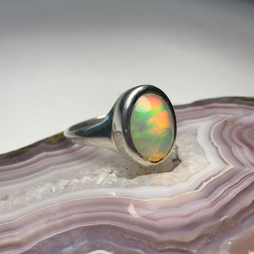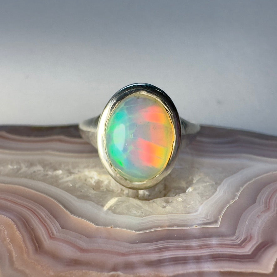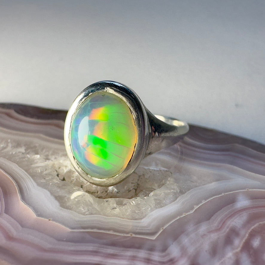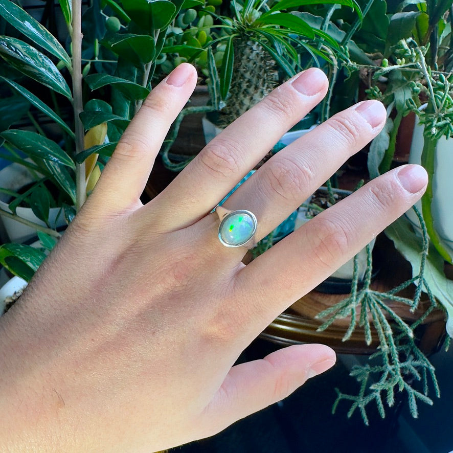 This ring features a shimmering oval shaped Opal cabochon, which has been integrated into the ring using a secure bezel setting. Ethiopian Opals are world-renowned for their intense sparkle and play of color, and the gemstone featured in this ring is no exception!