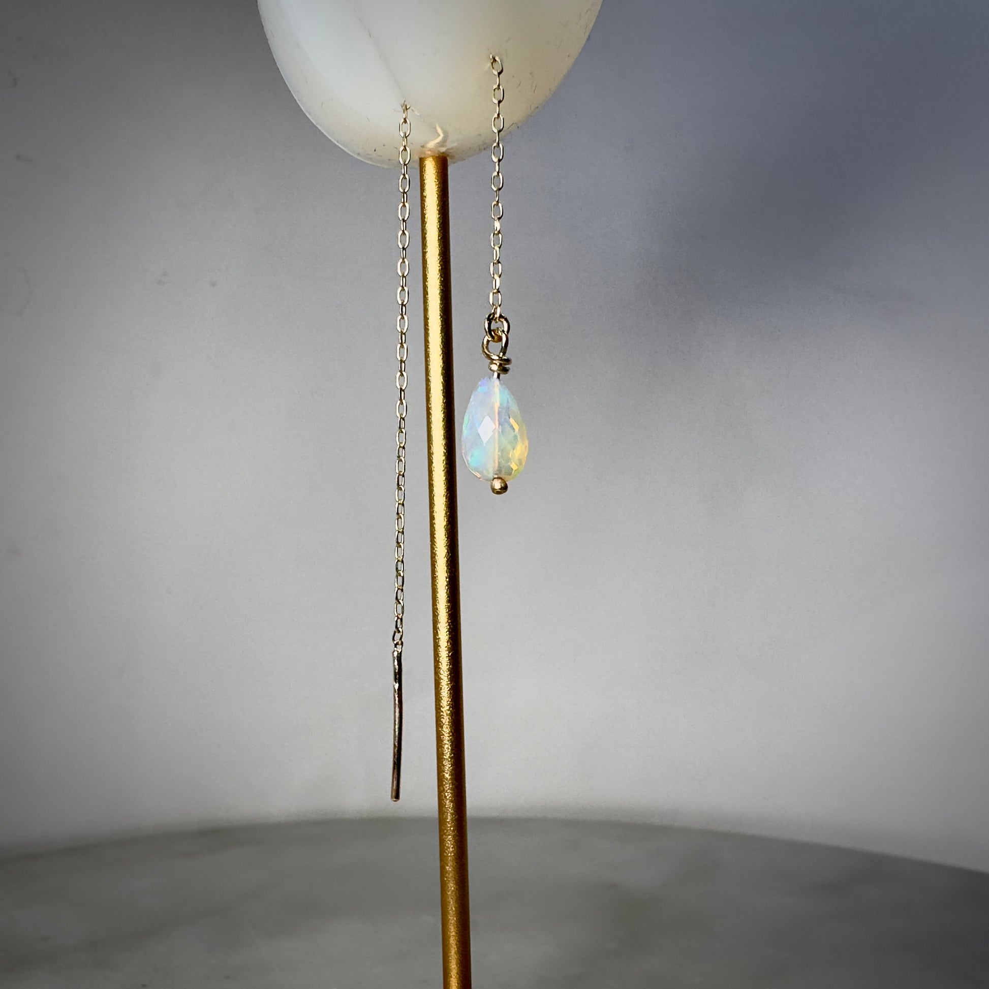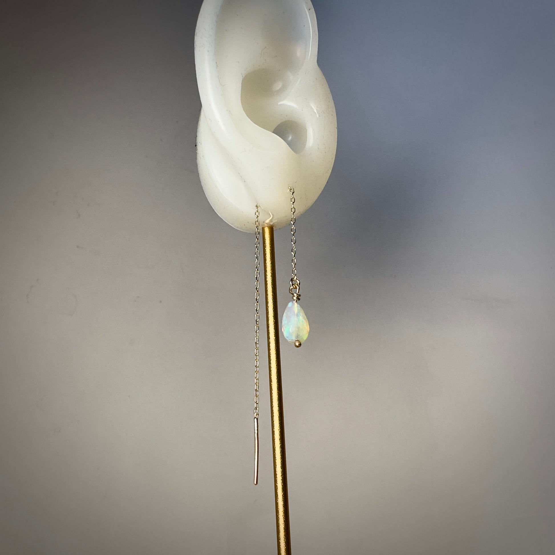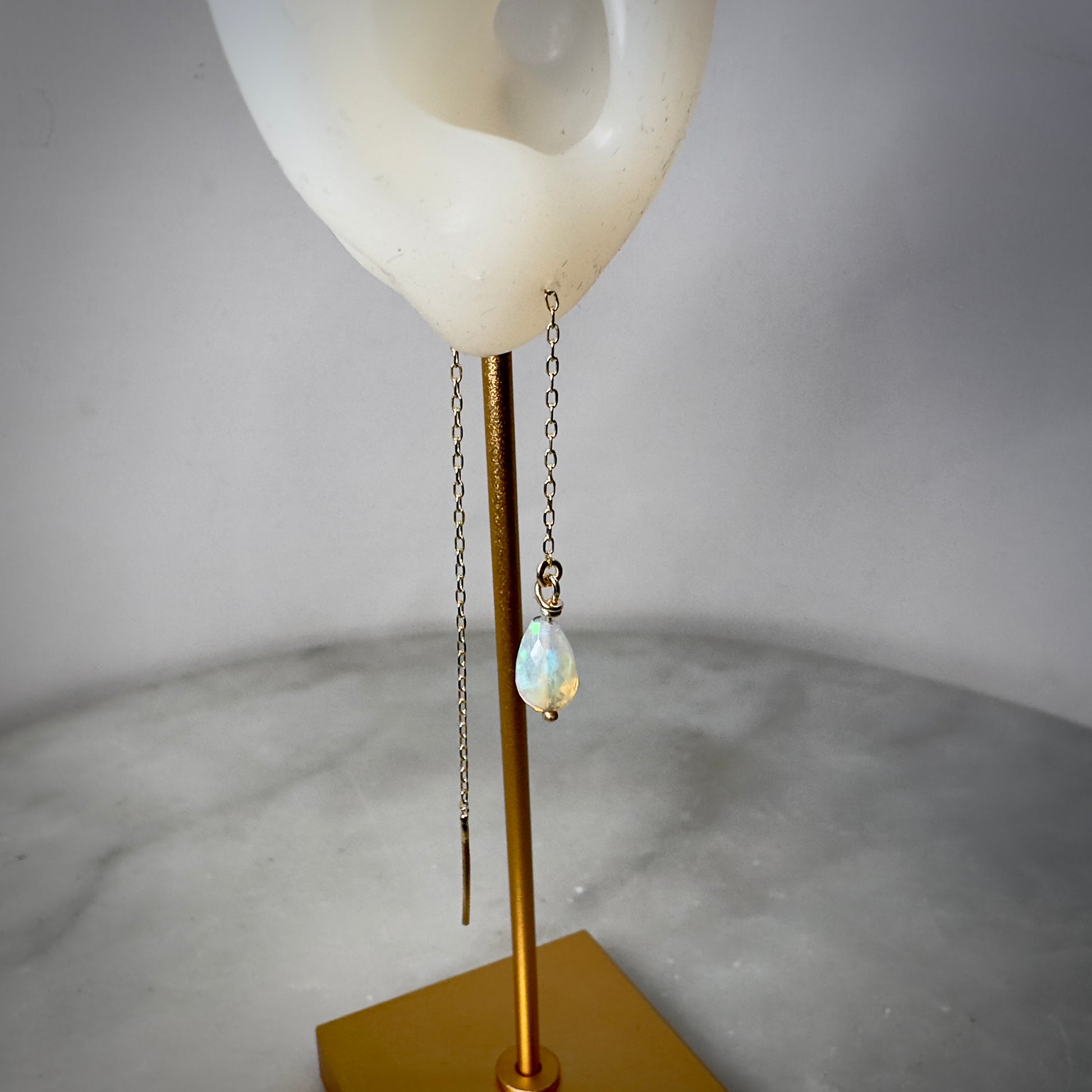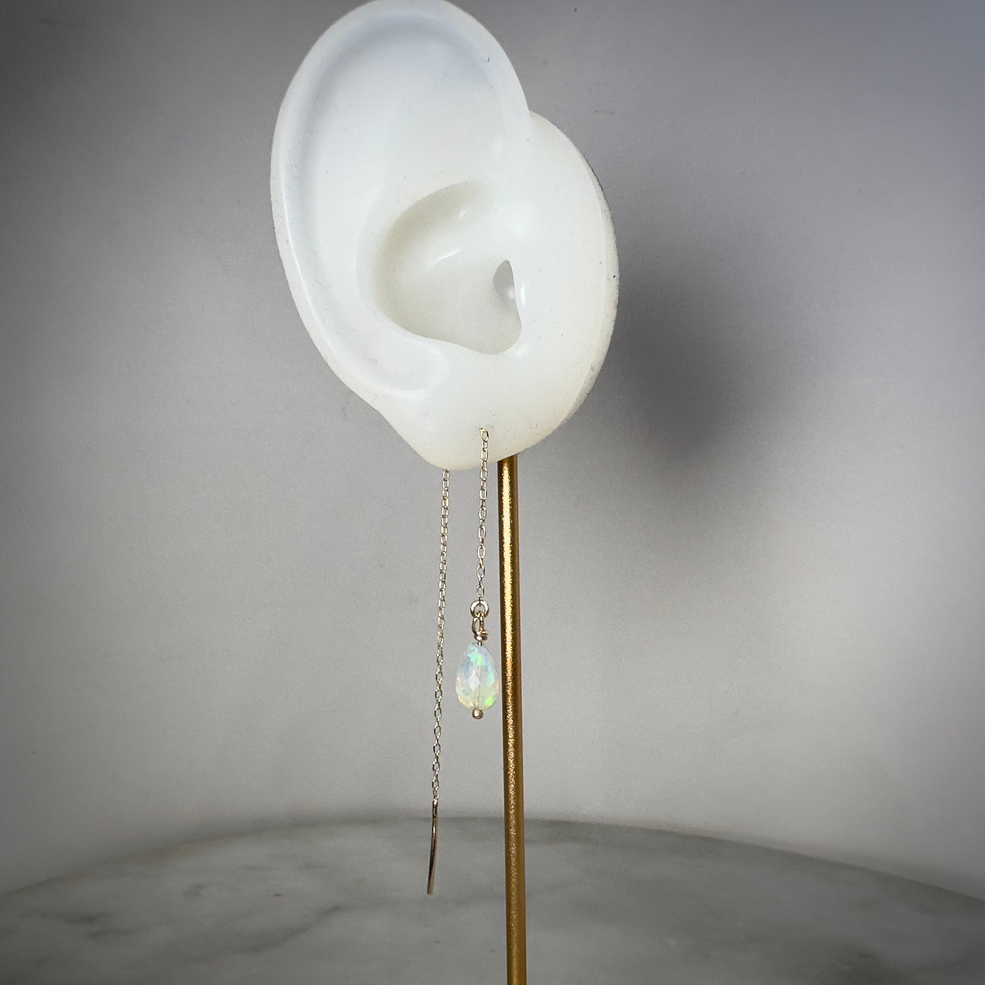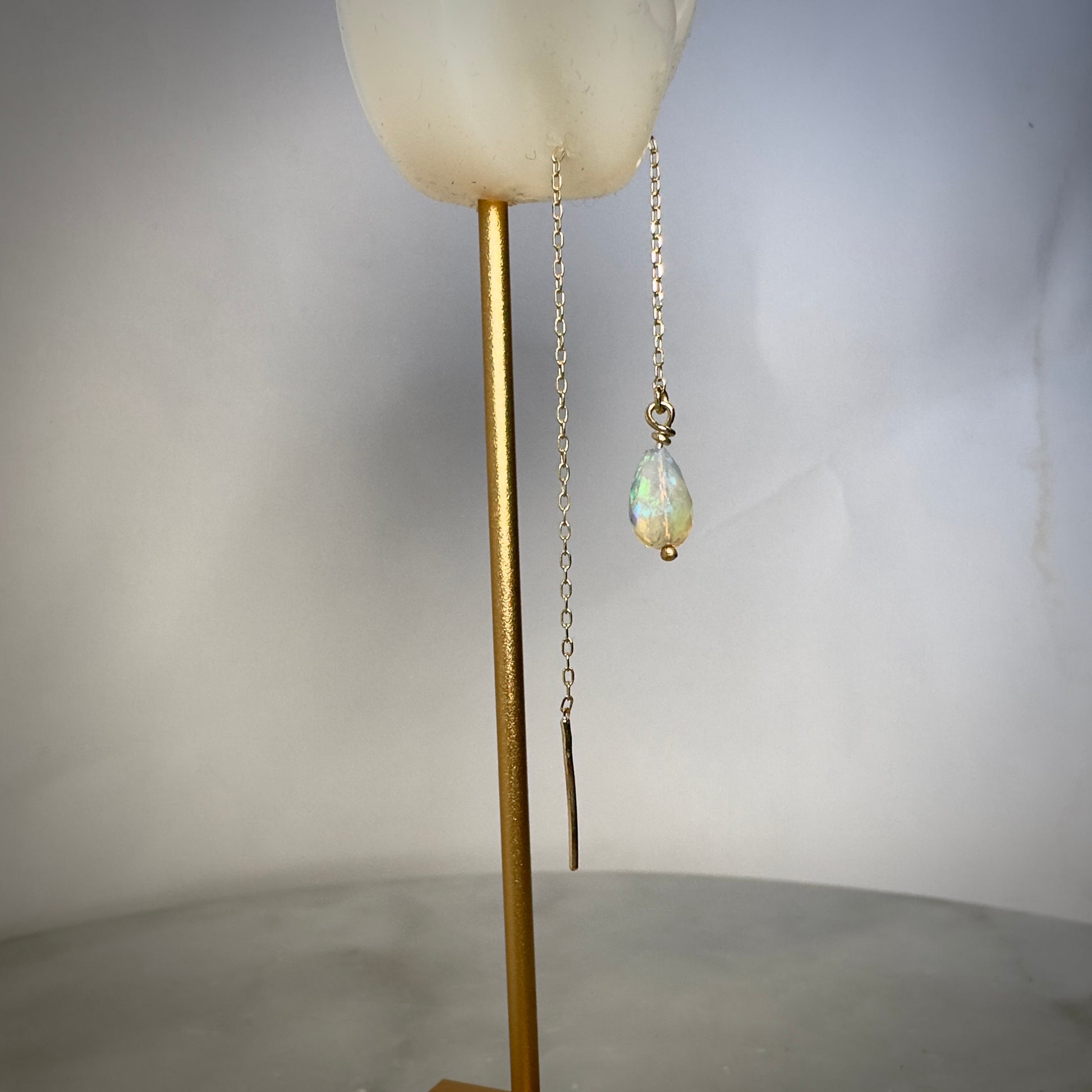 This threader style earring features a faceted opal bead, and is suspended from 14k yellow gold. The opal is very sparkly and catches the light from so many different angles! It is from Ethiopia, which is known around the world for its amazing Opals and Emeralds. The chain threads through a hand-drilled hole in the stone, and through your ear to secure it to you comfortably. It would pair beautifully with a pair of 14k yellow gold stud earrings, with or without another gemstone.
