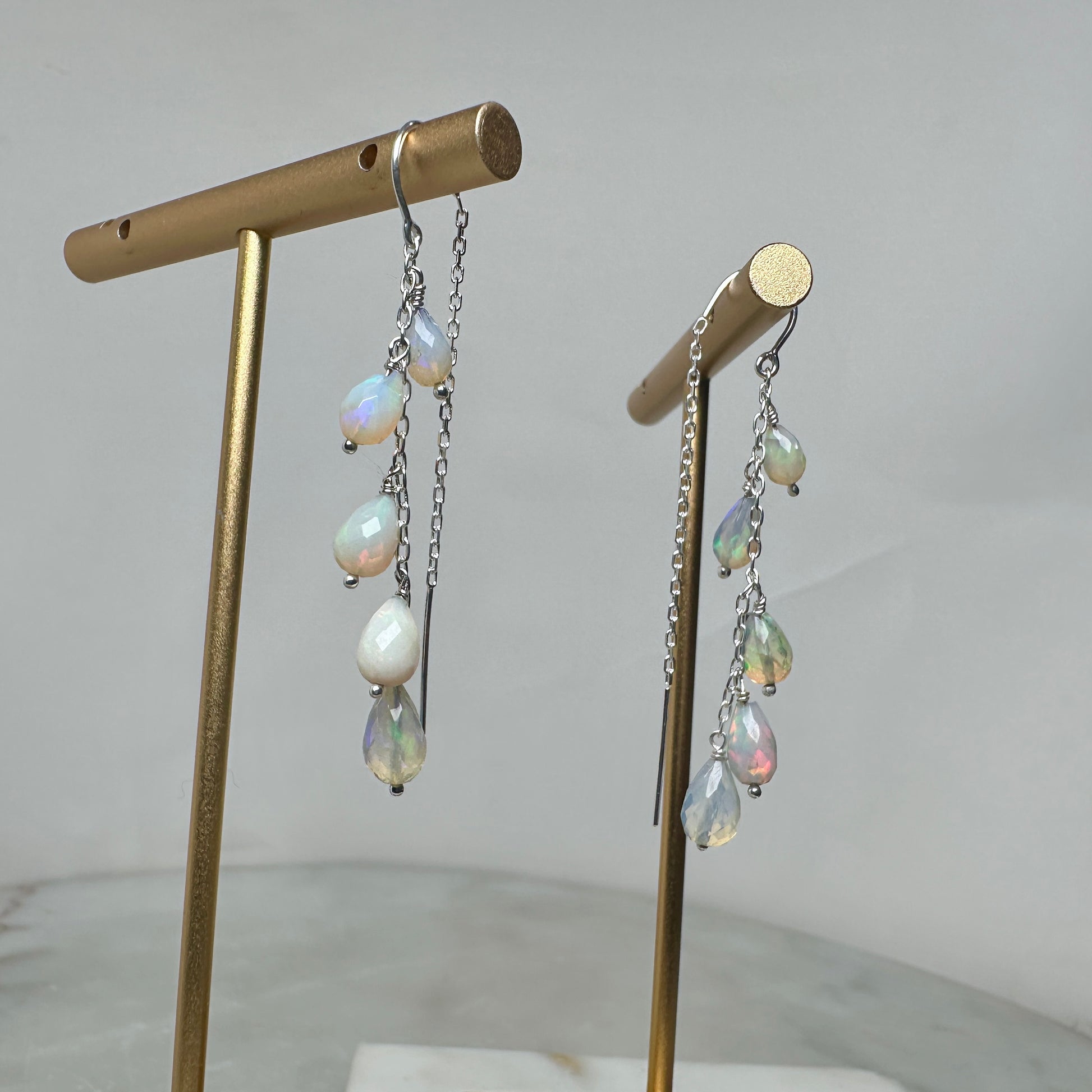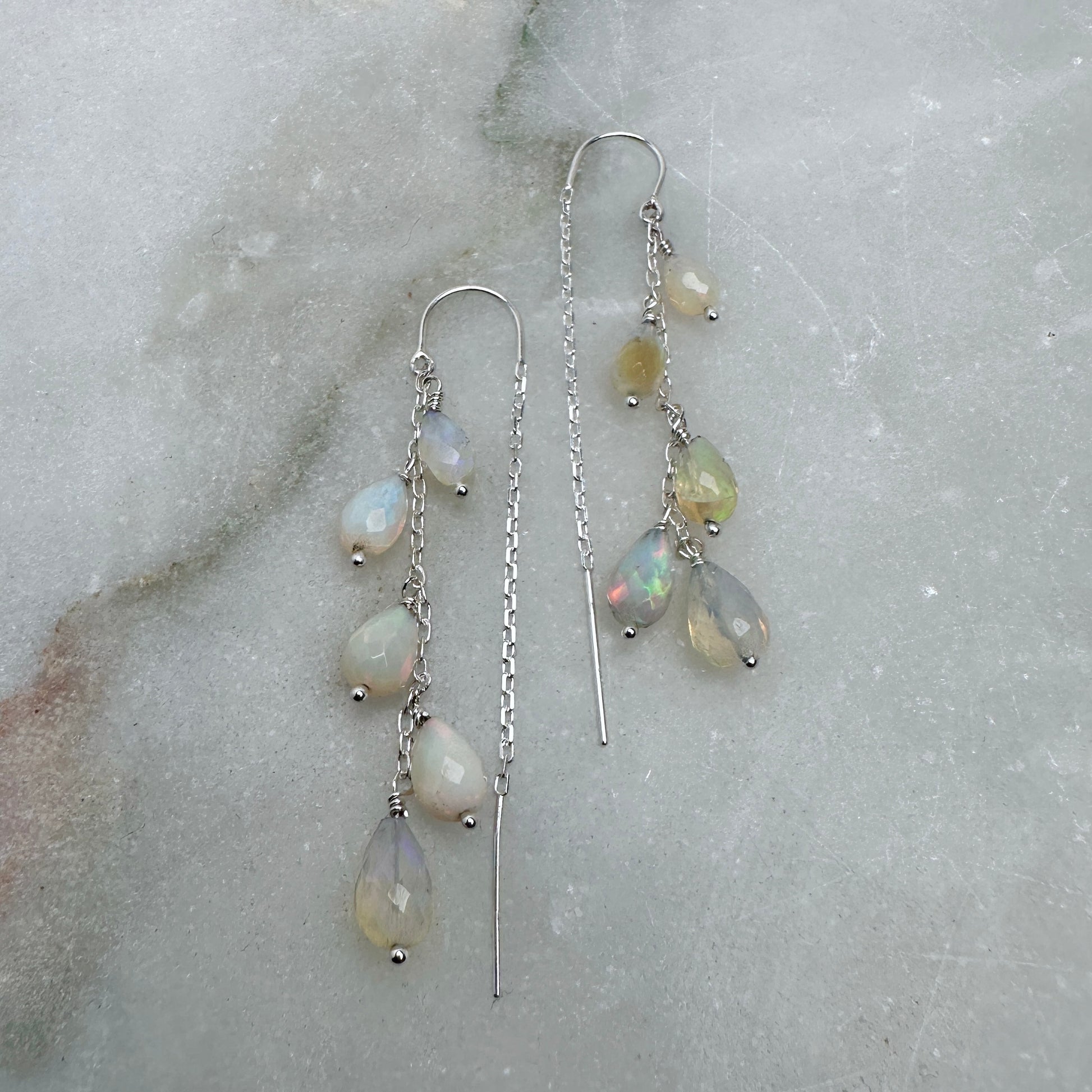 Crafted with five faceted Ethiopian opal teardrops per earring, these threader-style pieces combine timeless elegance with modern comfort. Each opal is individually unique, displaying its own luminous play of color as it catches the light. Set in sterling silver and suspended from a refined cable chain, they're designed to be worn effortlessly—lightweight enough for daily wear yet striking enough to elevate any look.