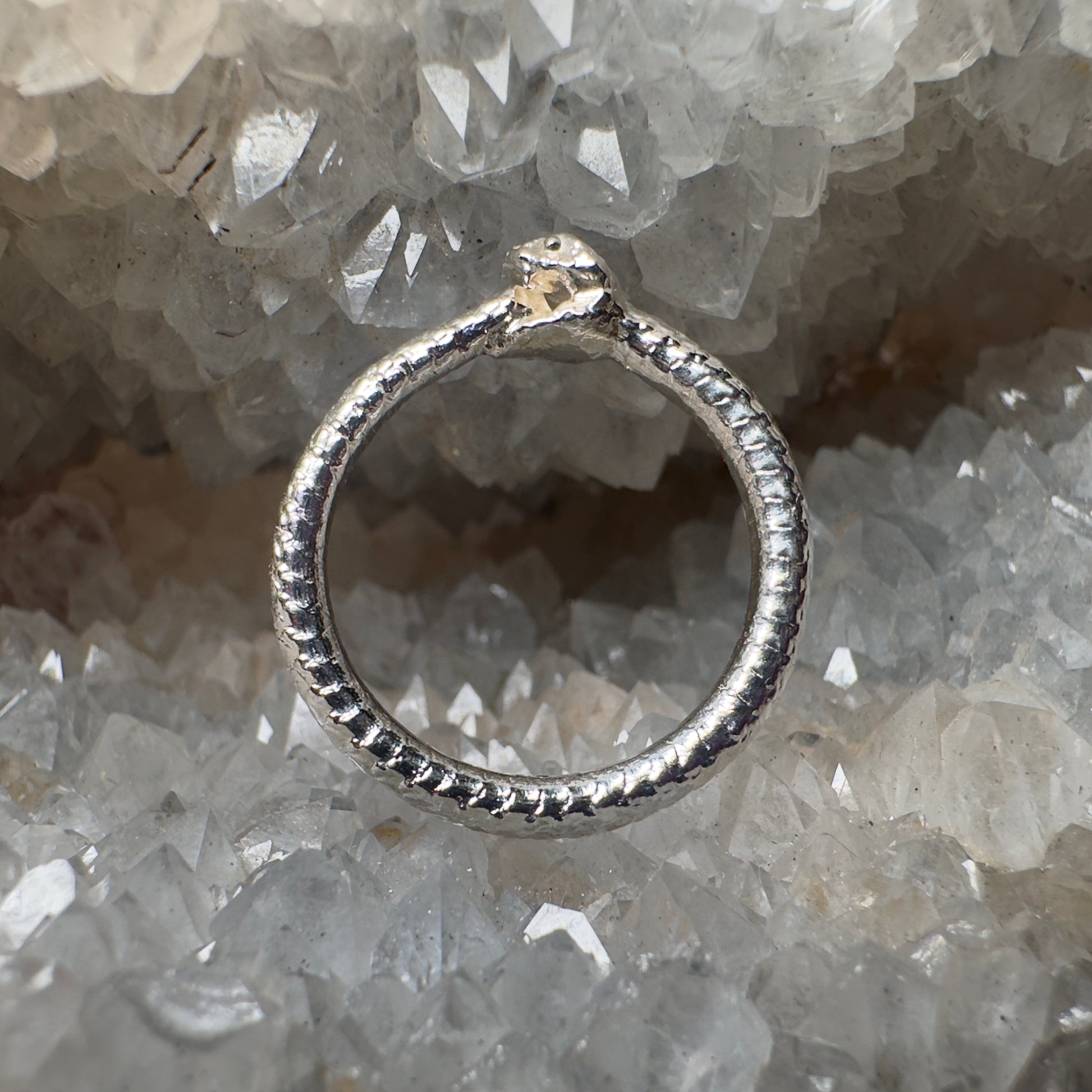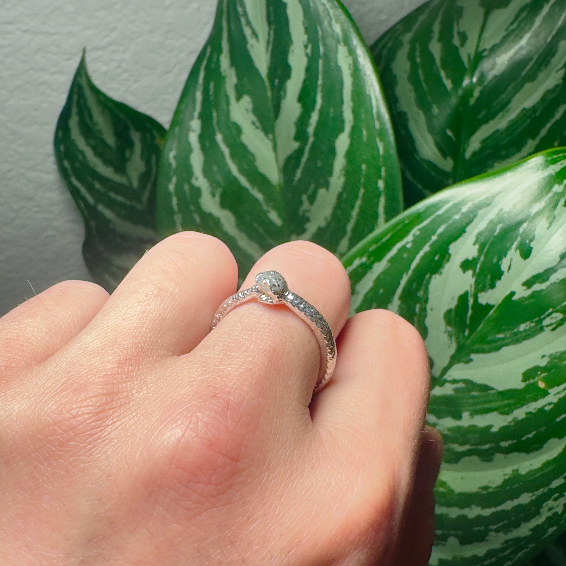 This ring is made with 100% recycled sterling silver, which was brightly finished to best emphasize the texture of the serpent’s scales.
