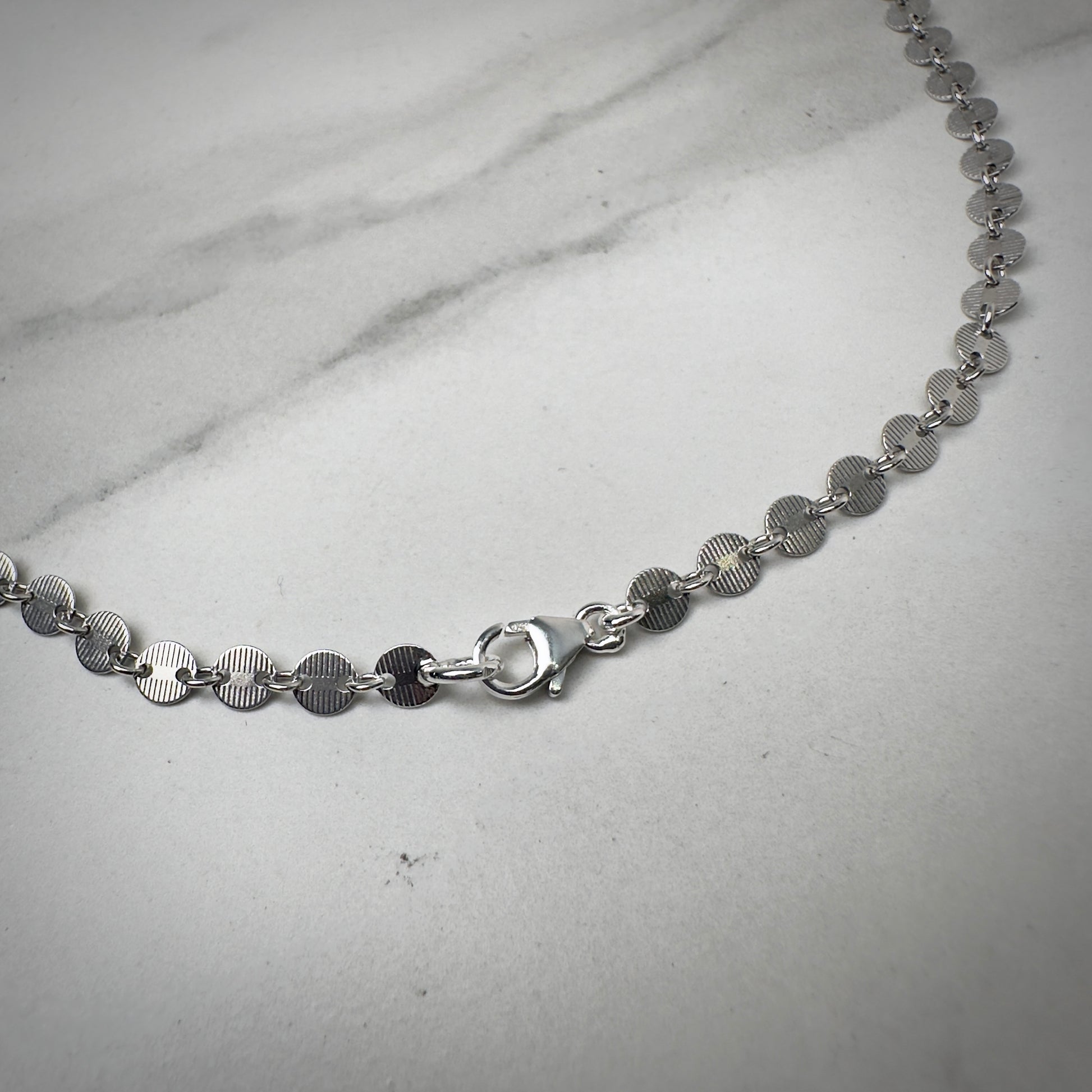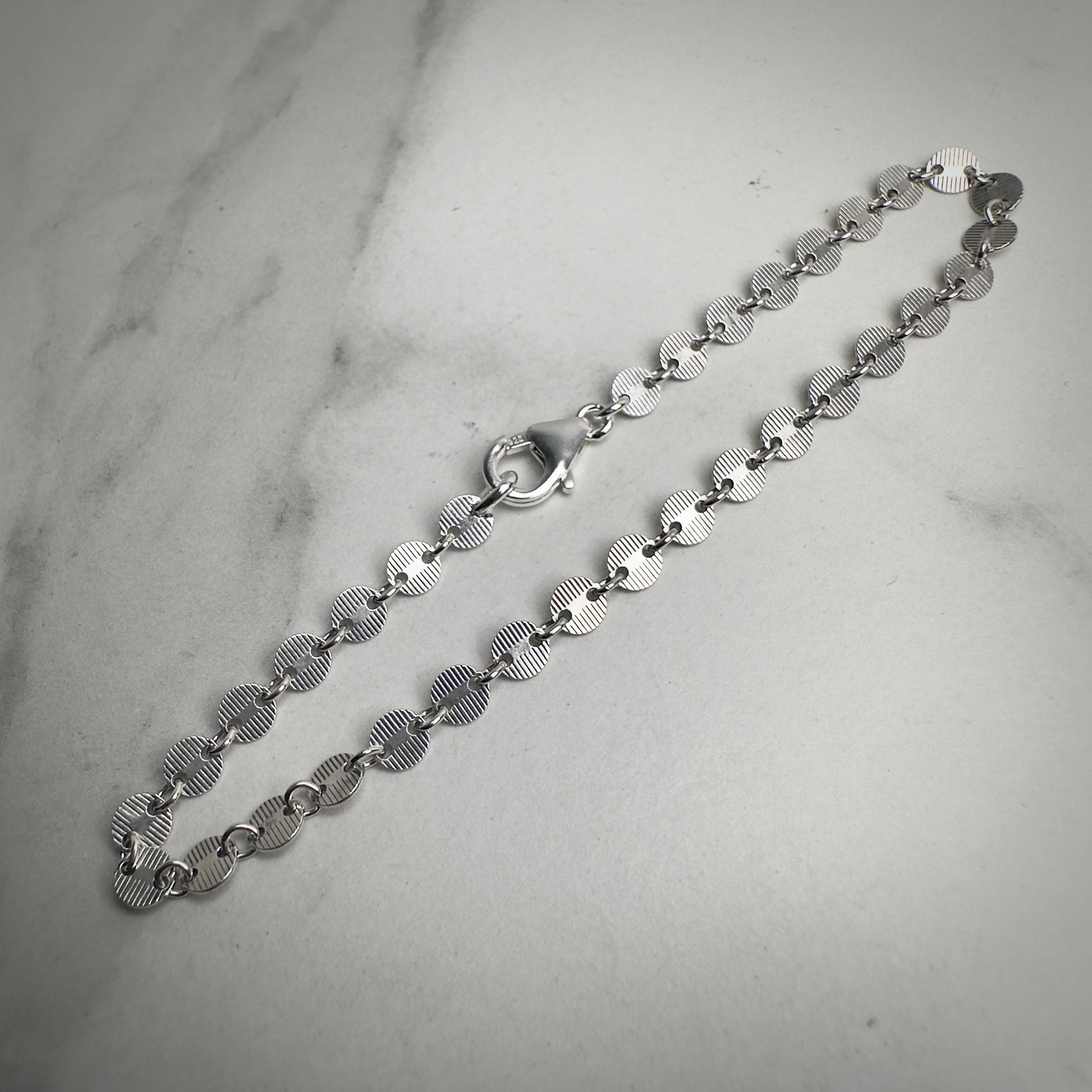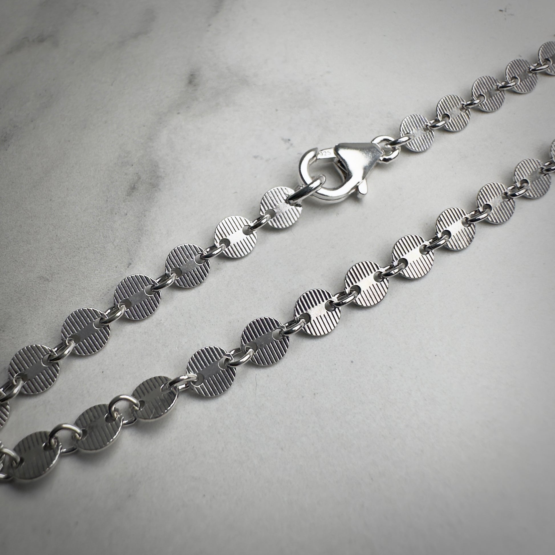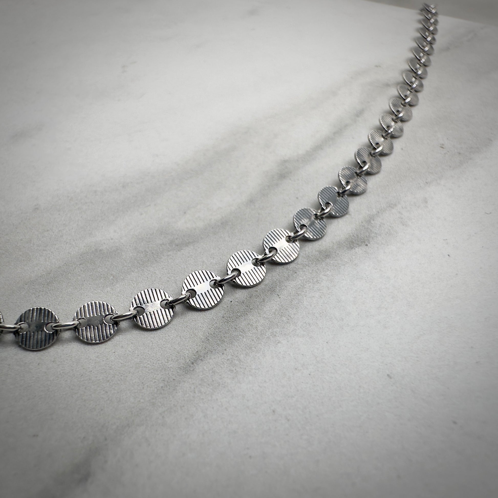 This sterling silver chain alternates between flat patterned links and smooth round cable links. This chain is great to layer with other chains, and wears nicely both as a necklace and a bracelet.