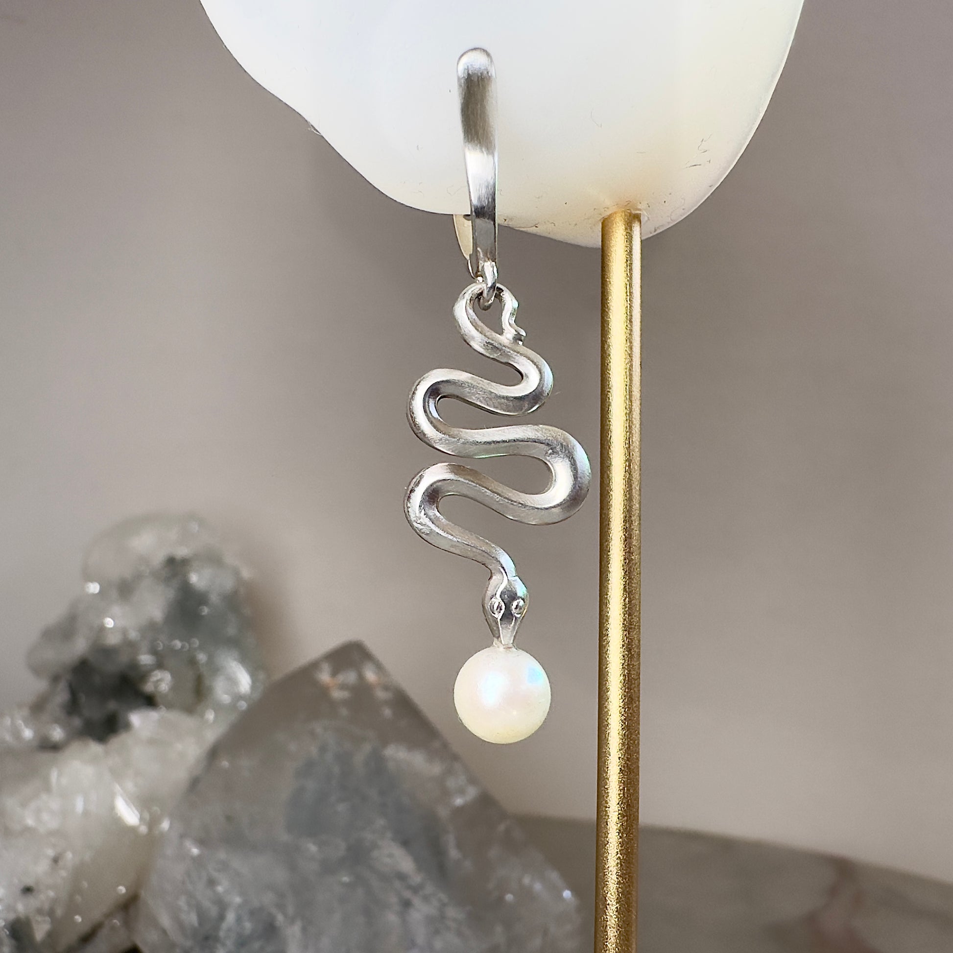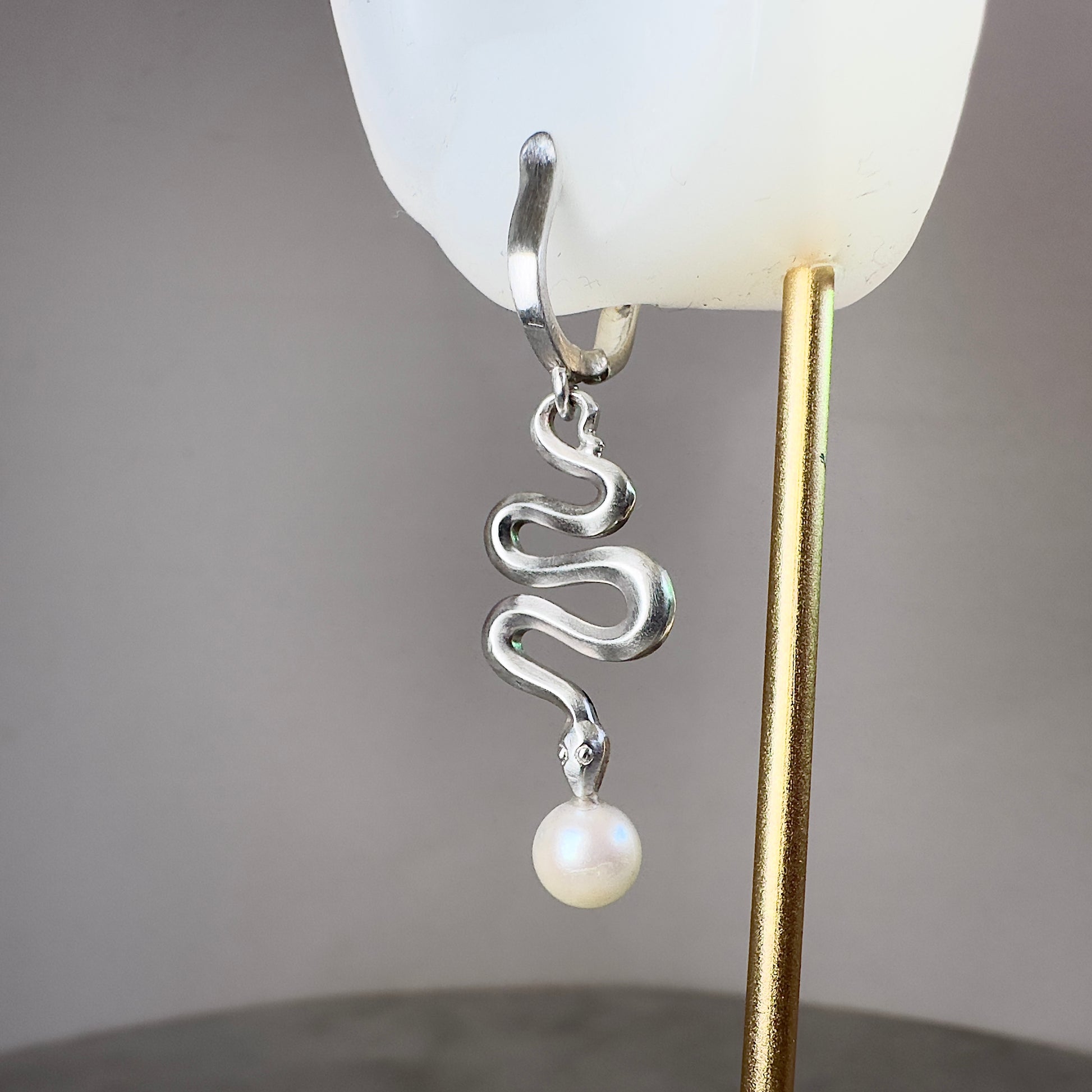This sleek, unisex earring marries organic elegance with edgy design. A lustrous white freshwater pearl dangles from a sinuous sterling silver snake, creating a bold yet versatile statement piece. Defying gender norms, this earring adapts effortlessly to any style - from minimalist to avant-garde. Wear it solo for subtle intrigue or pair it unexpectedly for a curated look that transcends traditional boundaries.