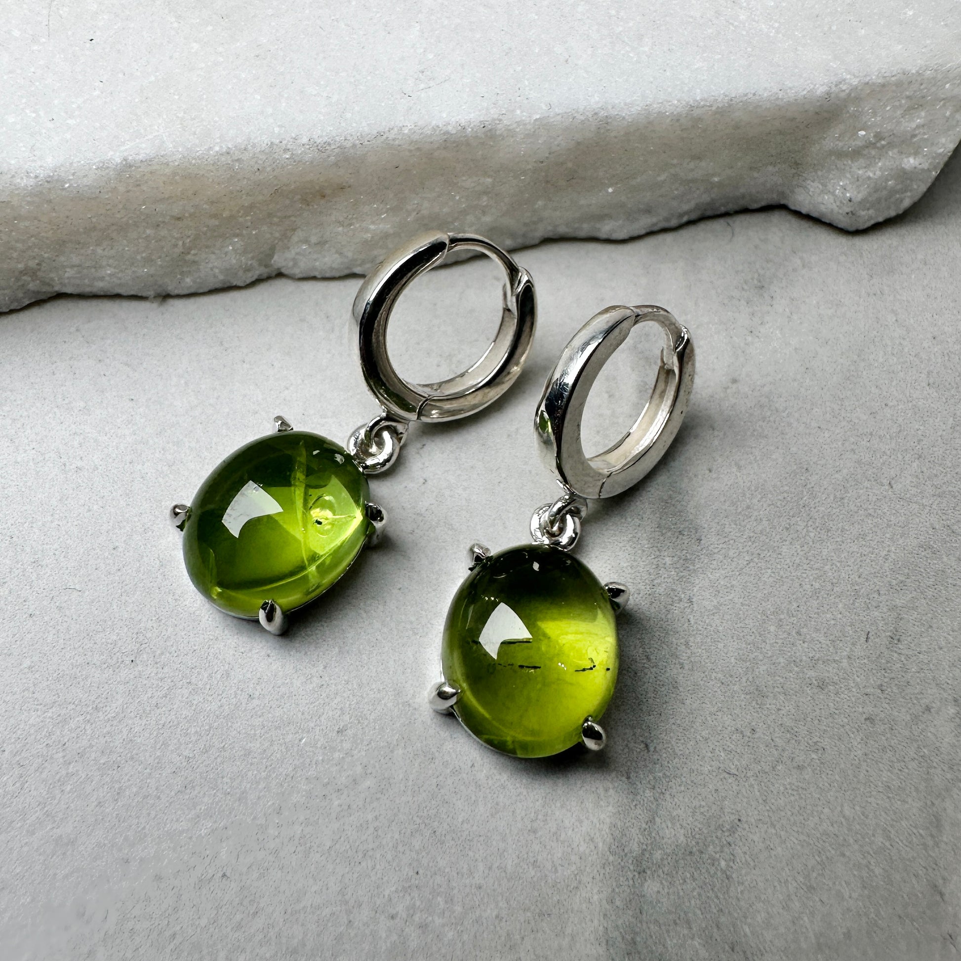 These sophisticated dangle earrings highlight stunning Pakistani peridot ovals totaling 8.57 carats in a vibrant lime-green hue. Each stone is set in a secure four-prong setting suspended from 12mm long recycled sterling silver hinged hoops, creating an understated yet striking silhouette. The prominent stone placement delivers maximum visual impact while maintaining refined elegance. Crafted from responsibly sourced recycled silver, these earrings pair effortlessly with complementary peridot jewelry and work beautifully as a standalone statement piece.