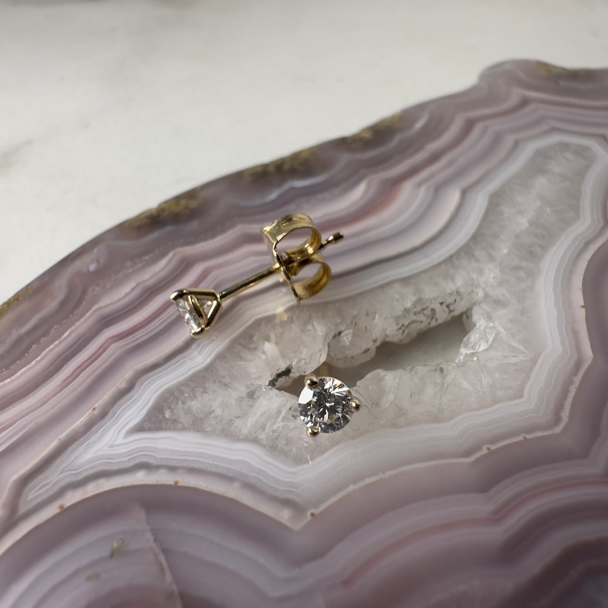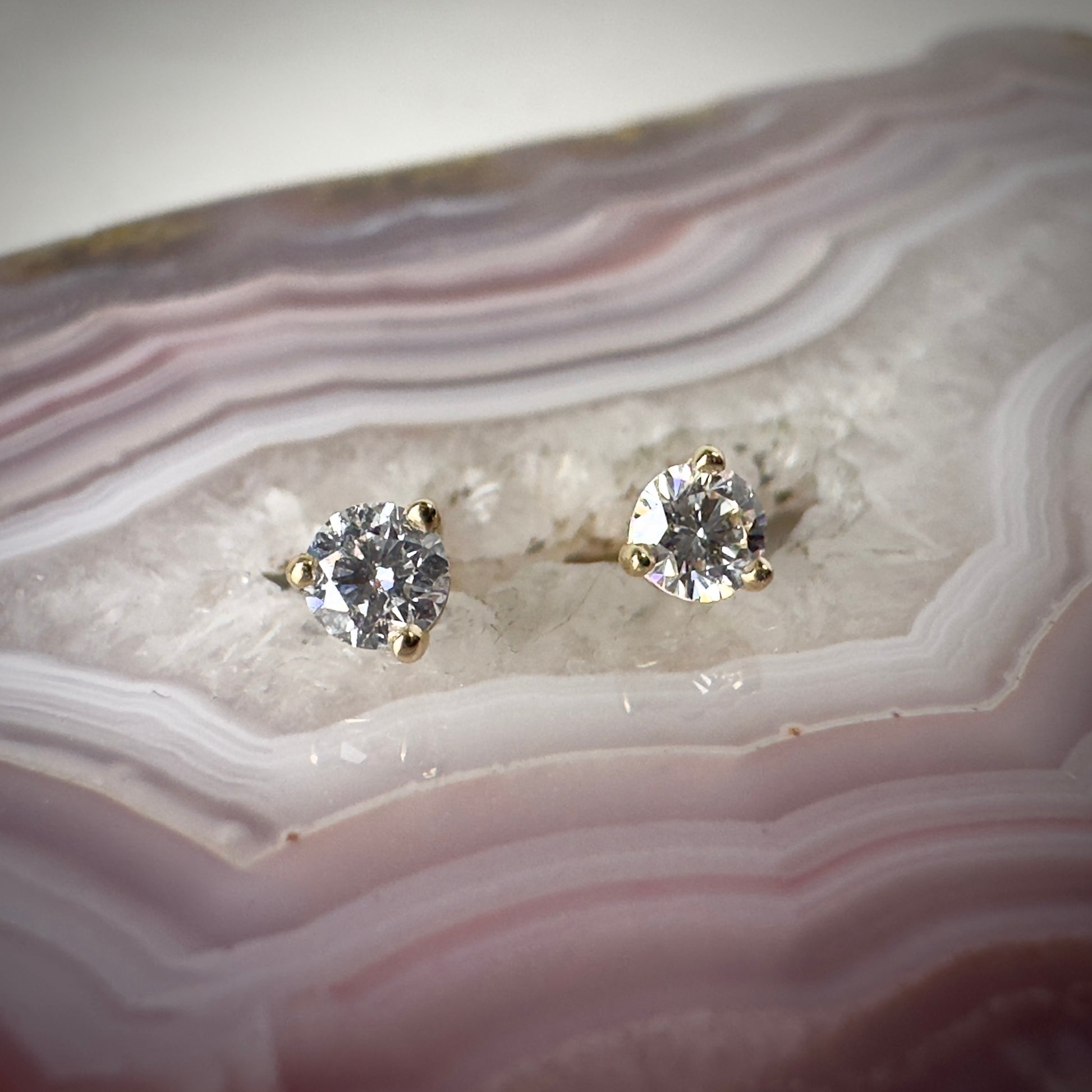 Featuring a total of .20 carat of lab grown diamonds, these studs showcase a refined 3-prong cocktail-style setting crafted from 100% recycled 14k yellow gold. They are comfortable to wear due to the standard size post and high quality friction backs.