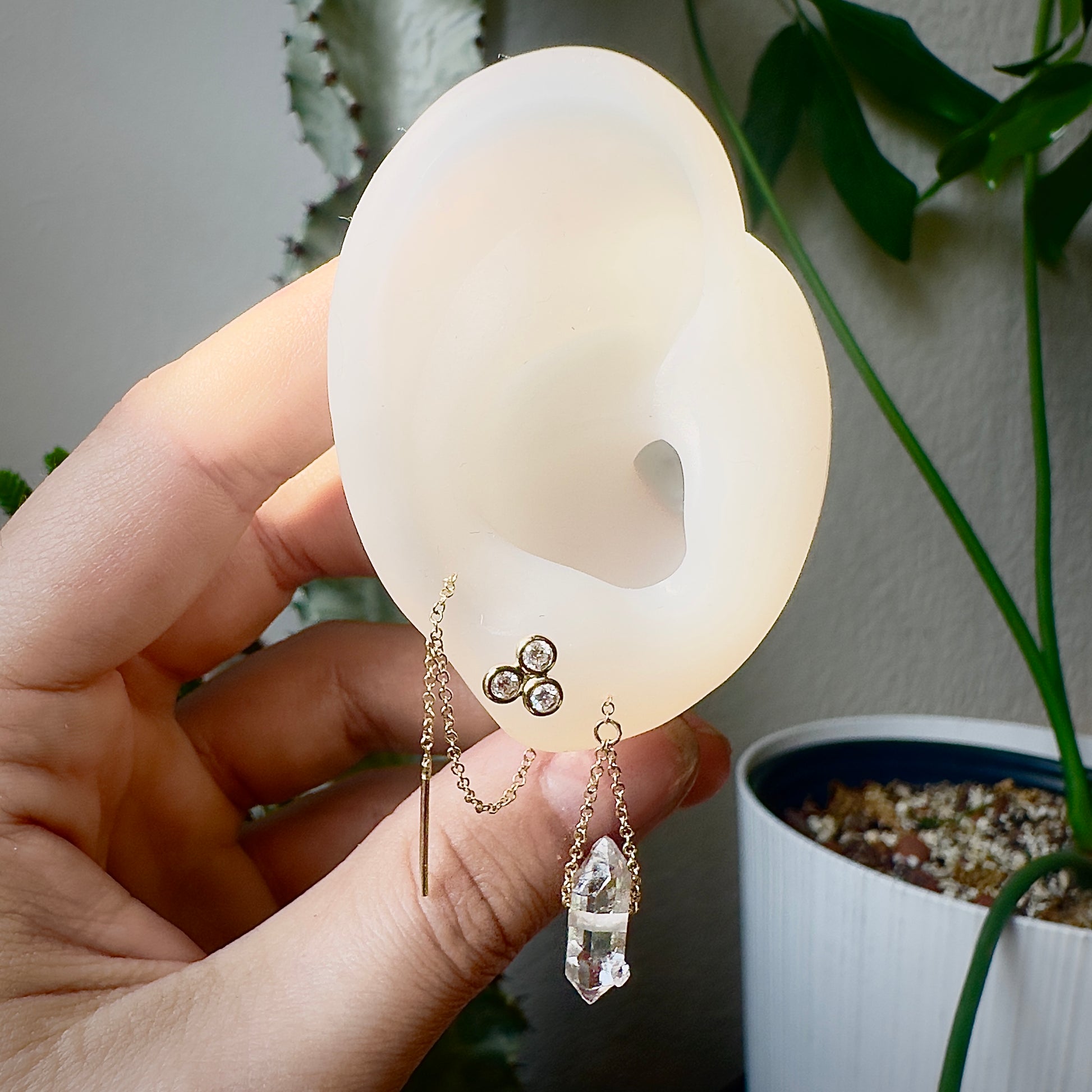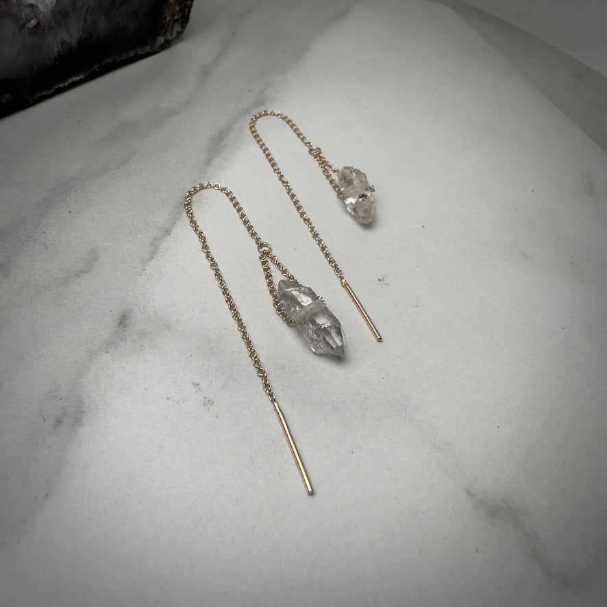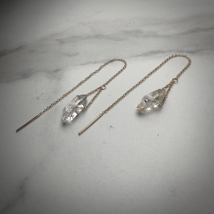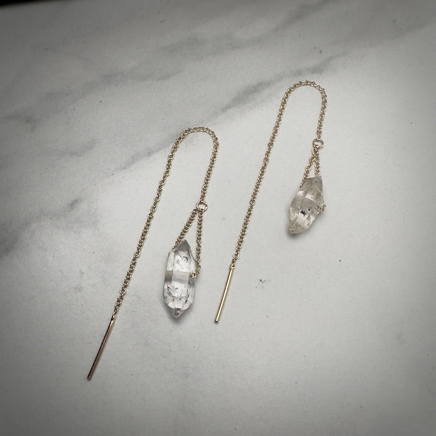 At their heart dangles a 'Diamond' Quartz crystal, nature's own masterpiece—untouched save for a single, rebellious hole allowing a whisper-thin chain to pass through.