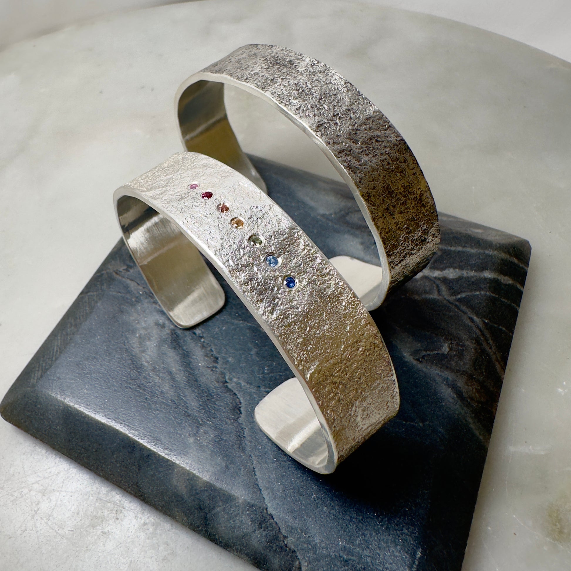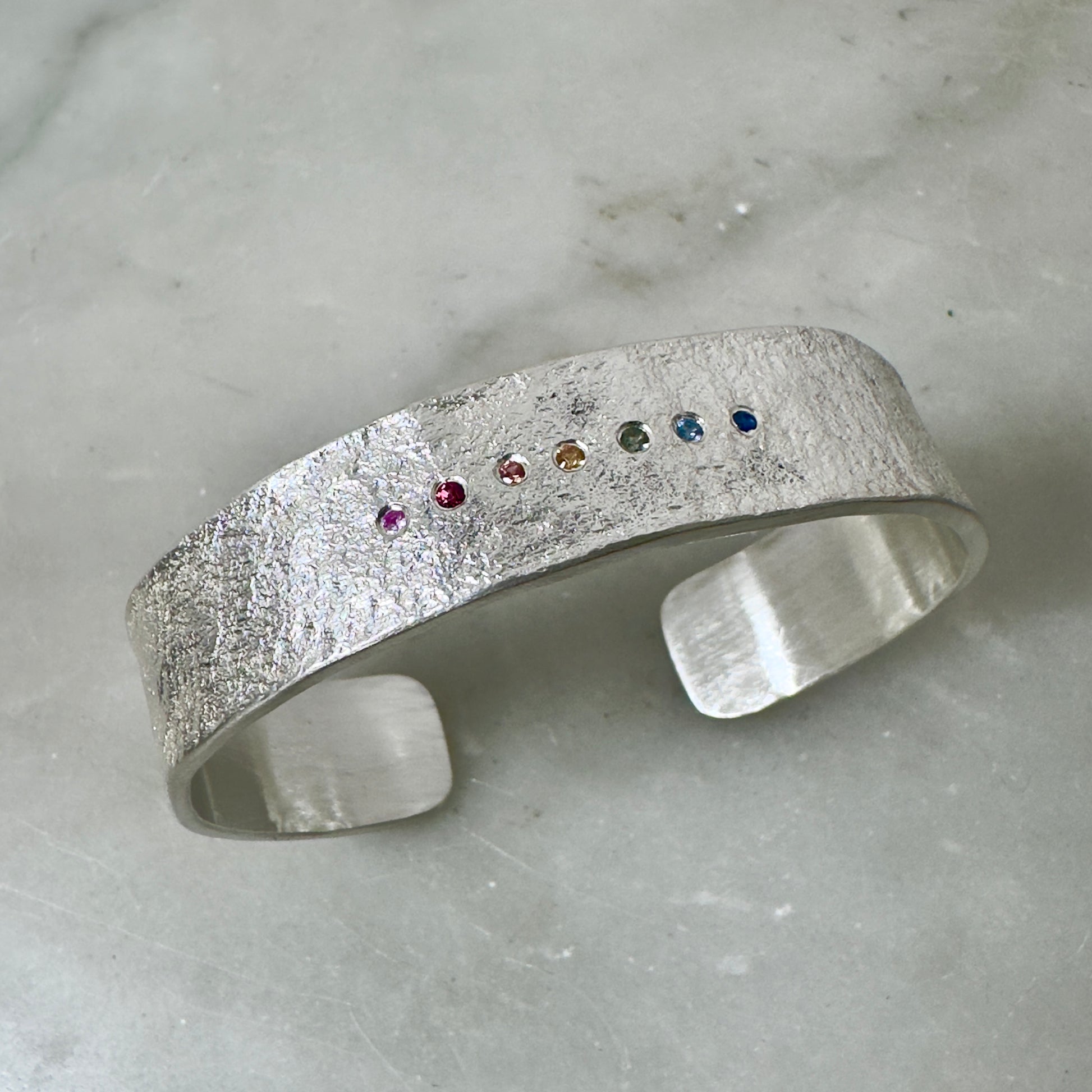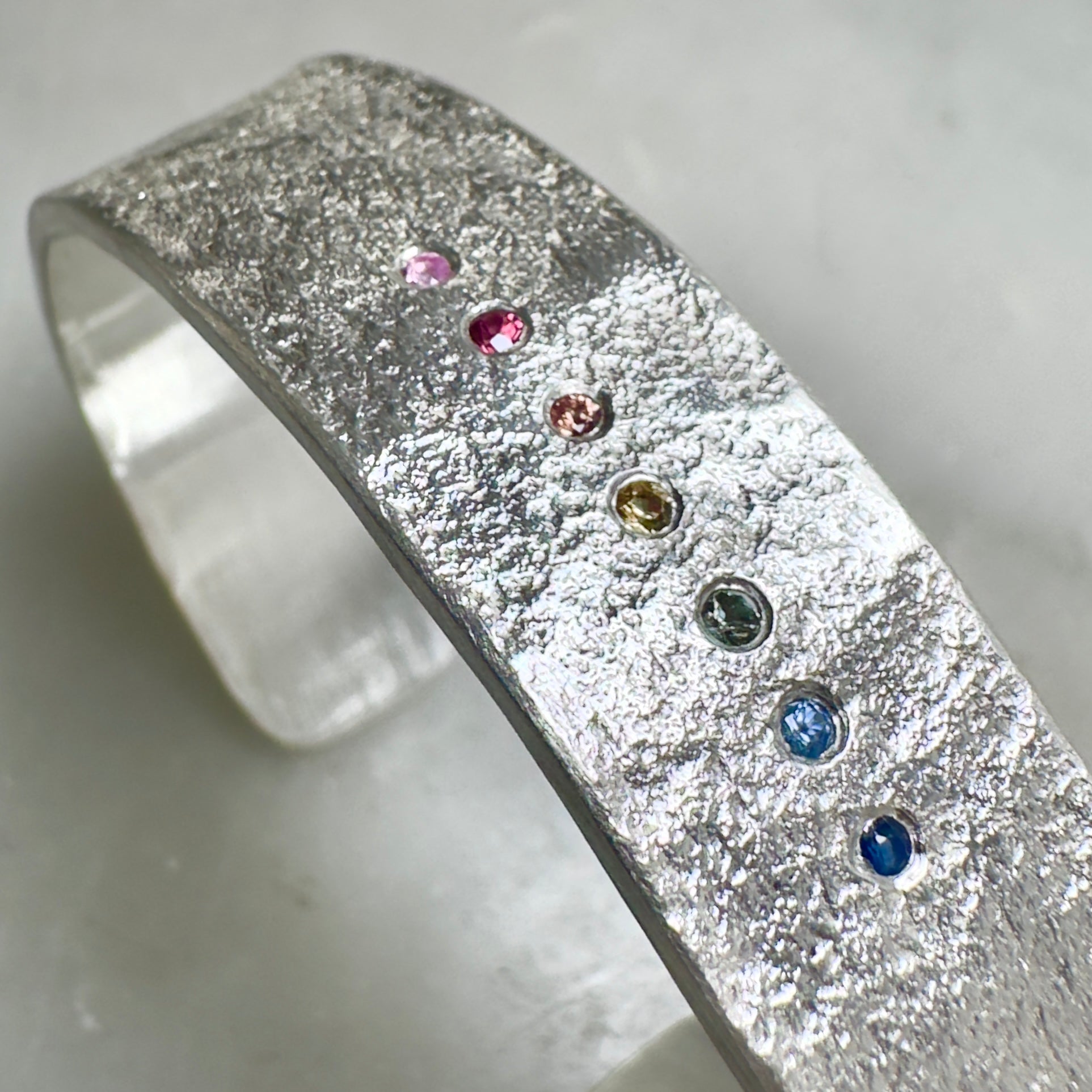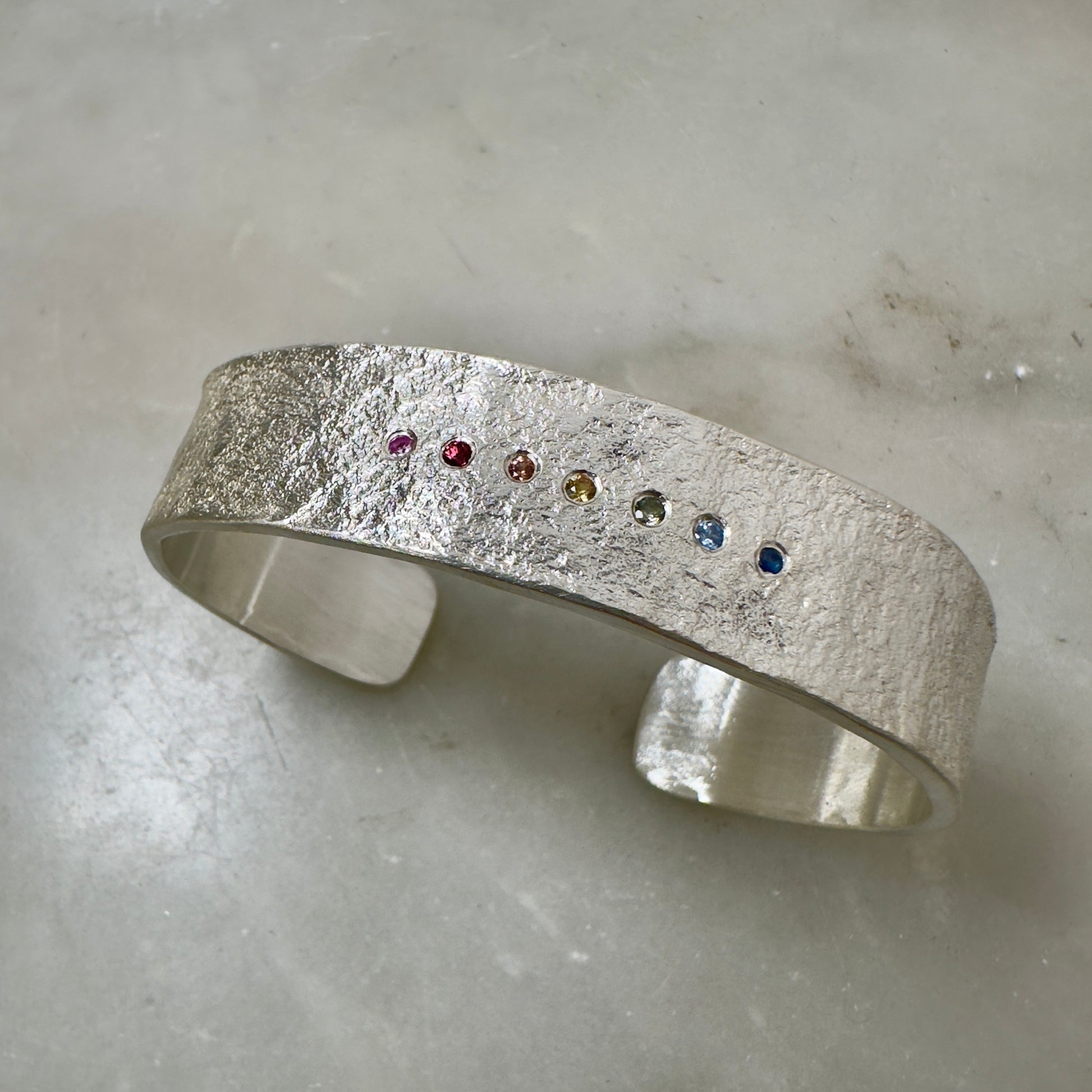 Elevate your jewelry collection with this unique blend of rugged texture and refined brilliance. Our Rainbow Sapphire Granite Cuff is not just an accessory, but a wearable work of art that celebrates the colorful spectrum of natural beauty.