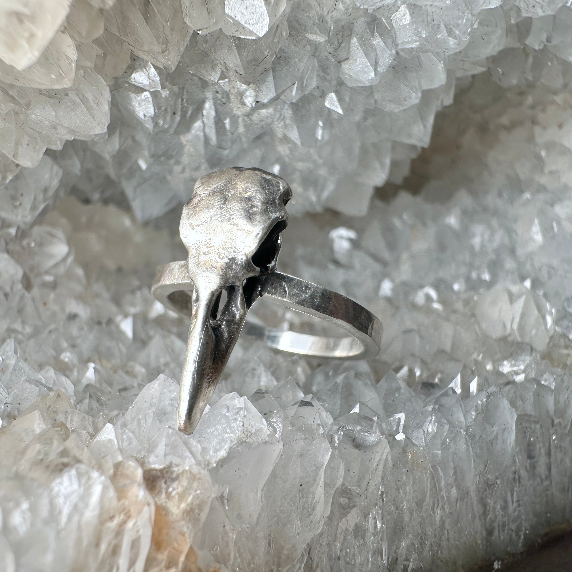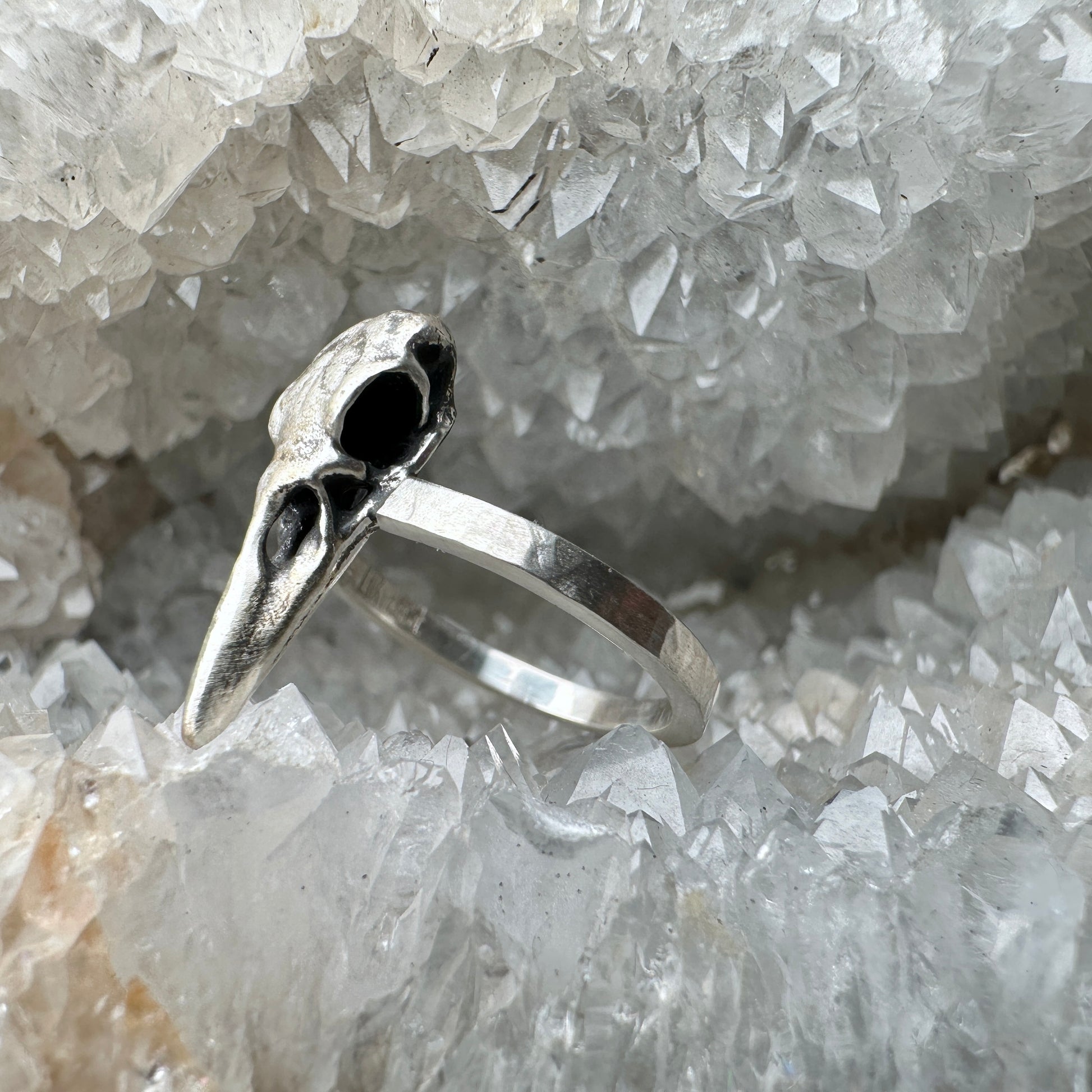 This ring features wonderfully macabre raven skull design as its focal point. The recessed areas are highlighted with a deep black patina, accentuating the natural shapes of the skulls. A 2mm wide band wraps around the finger, making this piece an excellent option to wear and stack with other rings. a This intriguing Raven Skull ring is crafted in solid sterling silver, and has a brushed-matte finish.