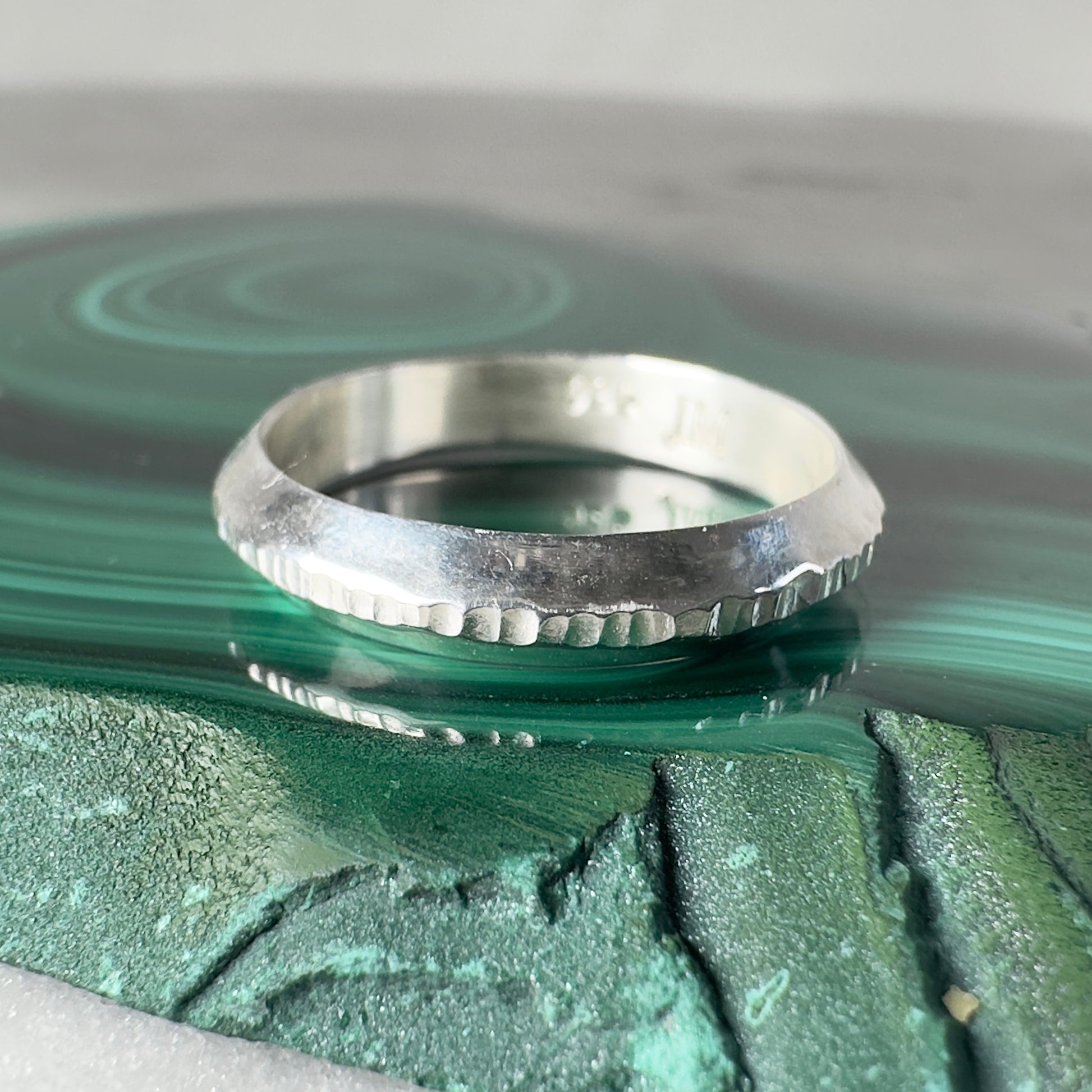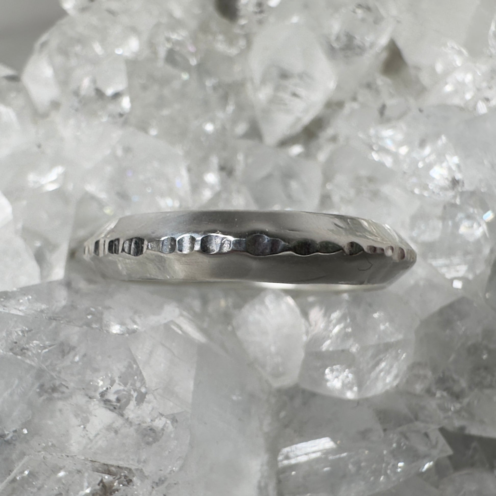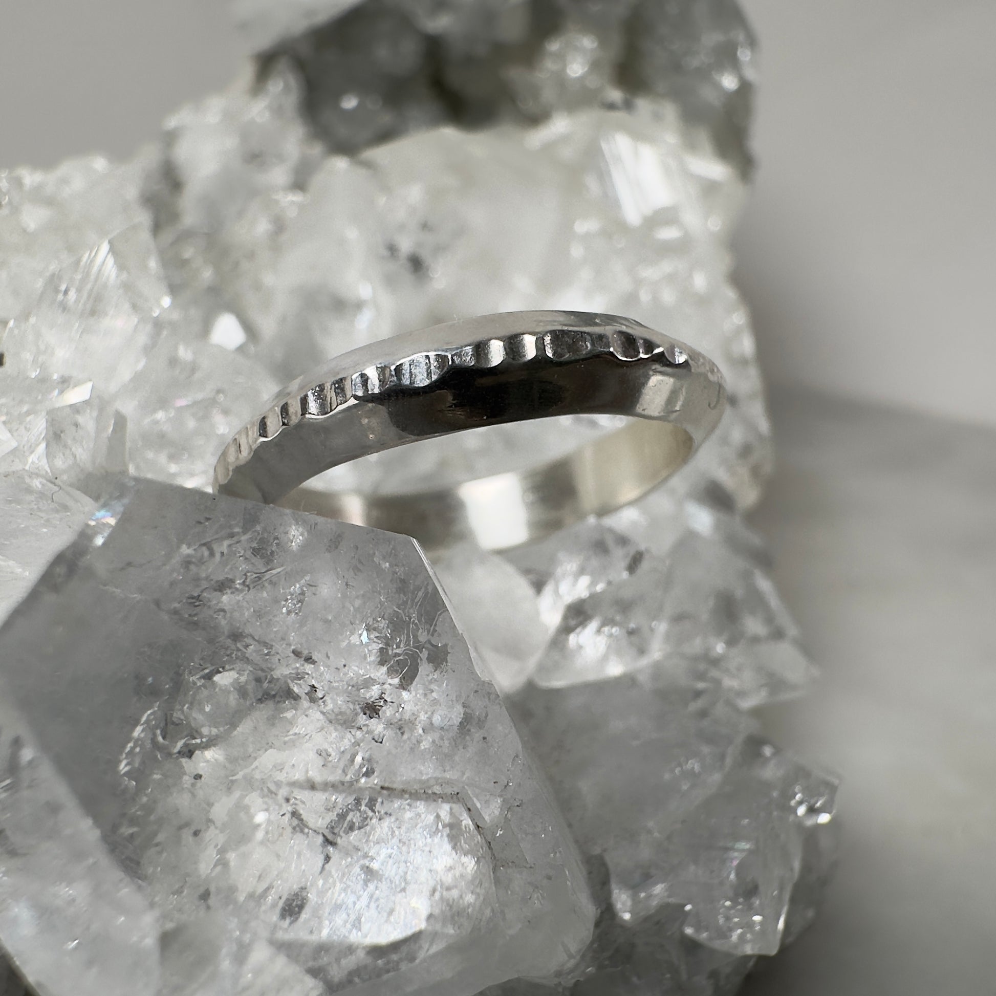 Introducing the Ripple Band Ring - a stunning fusion of organic textures and natural brilliance. This eye-catching piece features a hand-hammered band, its surface dancing with linear impressions that evoke the gentle ripples of water. The bright, polished silver creates a mesmerizing contrast against the textured background, ensuring this ring catches every glance.
