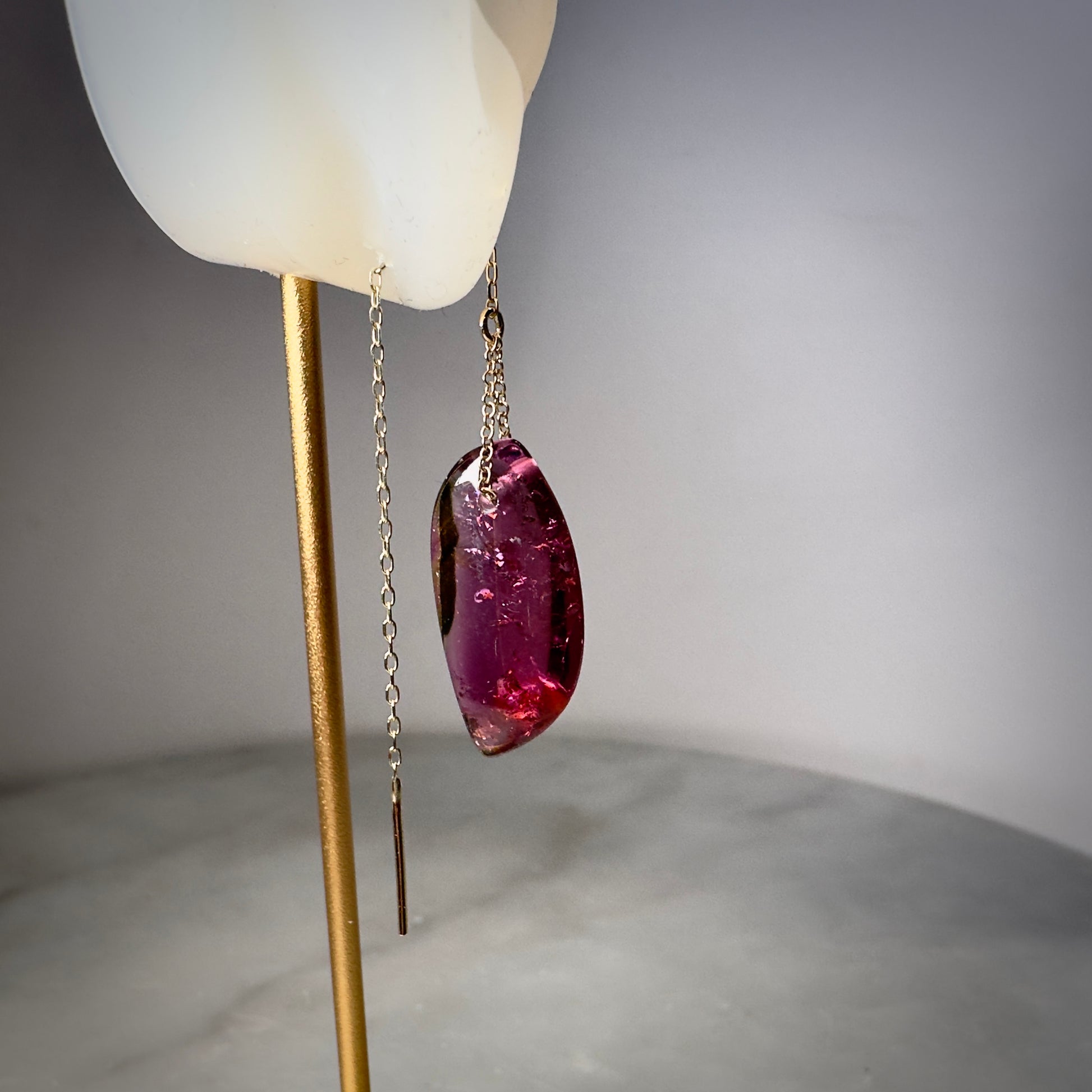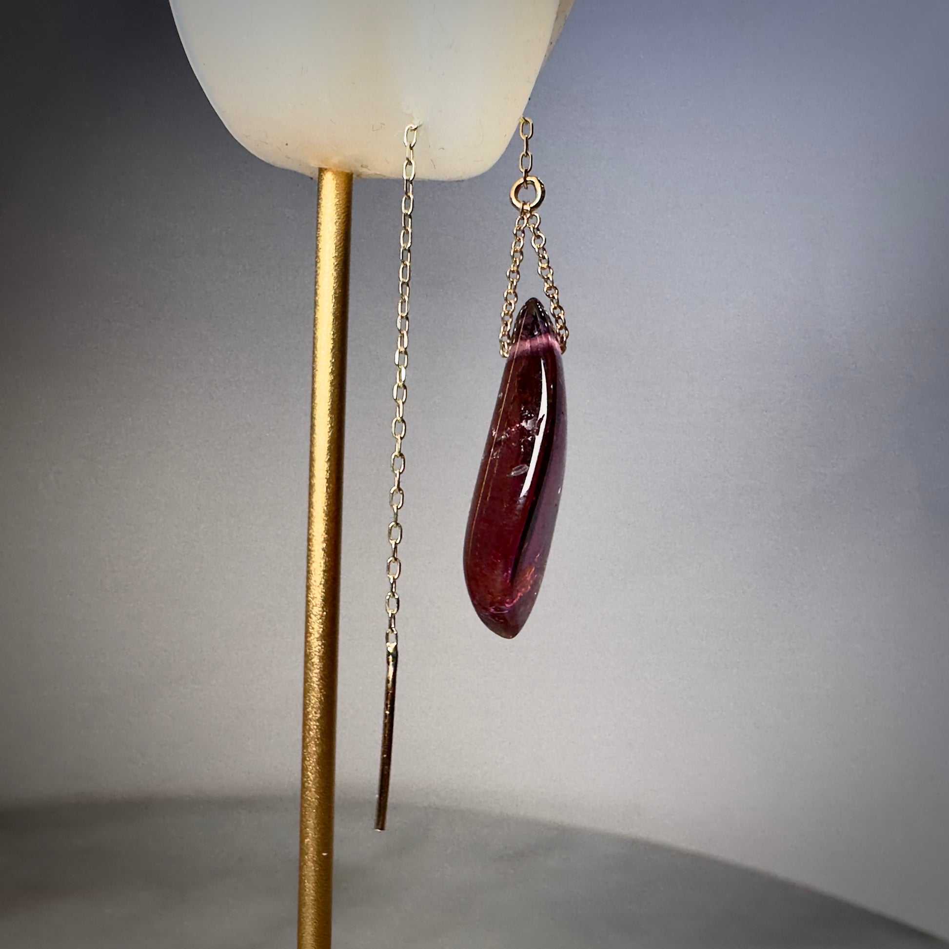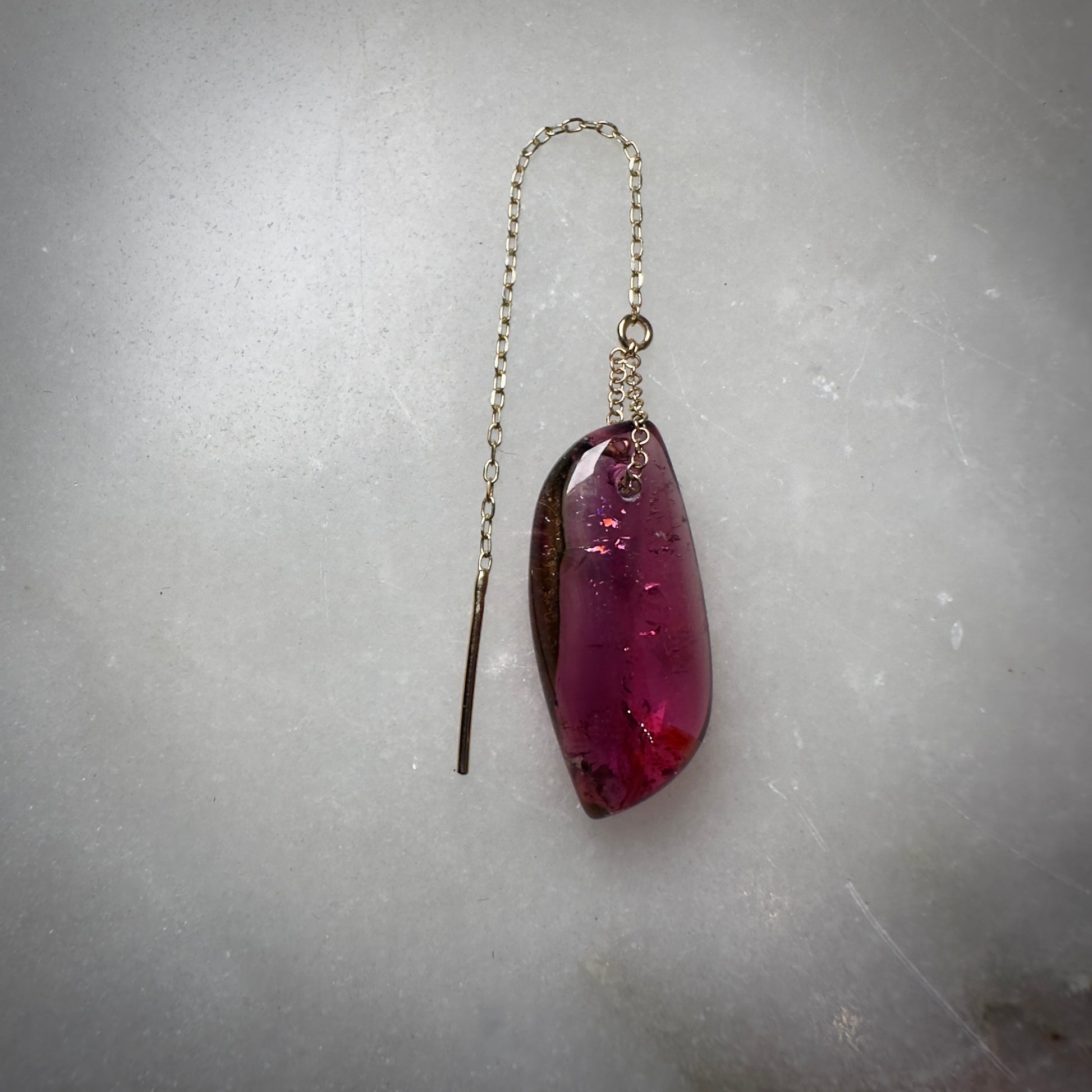 This threader style earring features a totally natural 14.58ct Pink Tourmaline gemstone. This highly saturated, glossy gemstone is from Brazil, which is known around the world for its amazing tourmaline and a plethora of other gorgeous minerals. The chain threads through a hand-drilled hole in the stone, and through your ear to secure it to you. It would pair beautifully with a pair of 14k yellow gold stud earrings, with or without another gemstone. This earring is truly one of a kind!