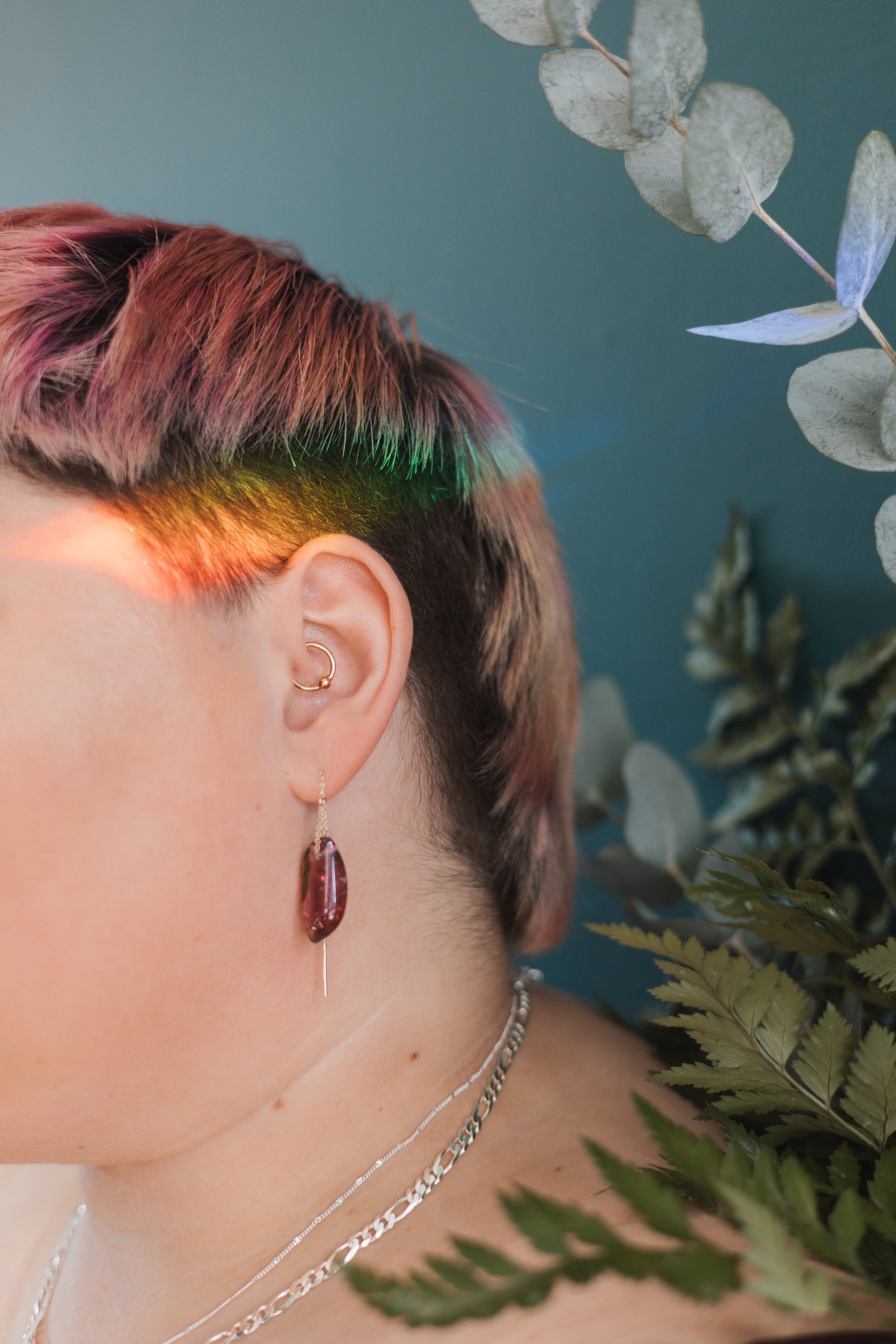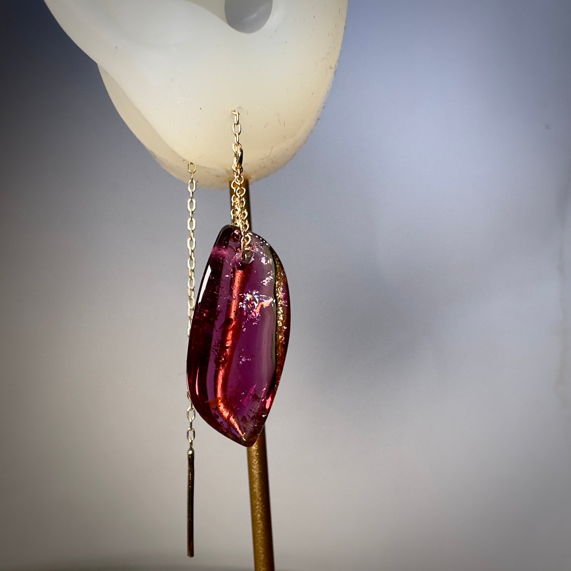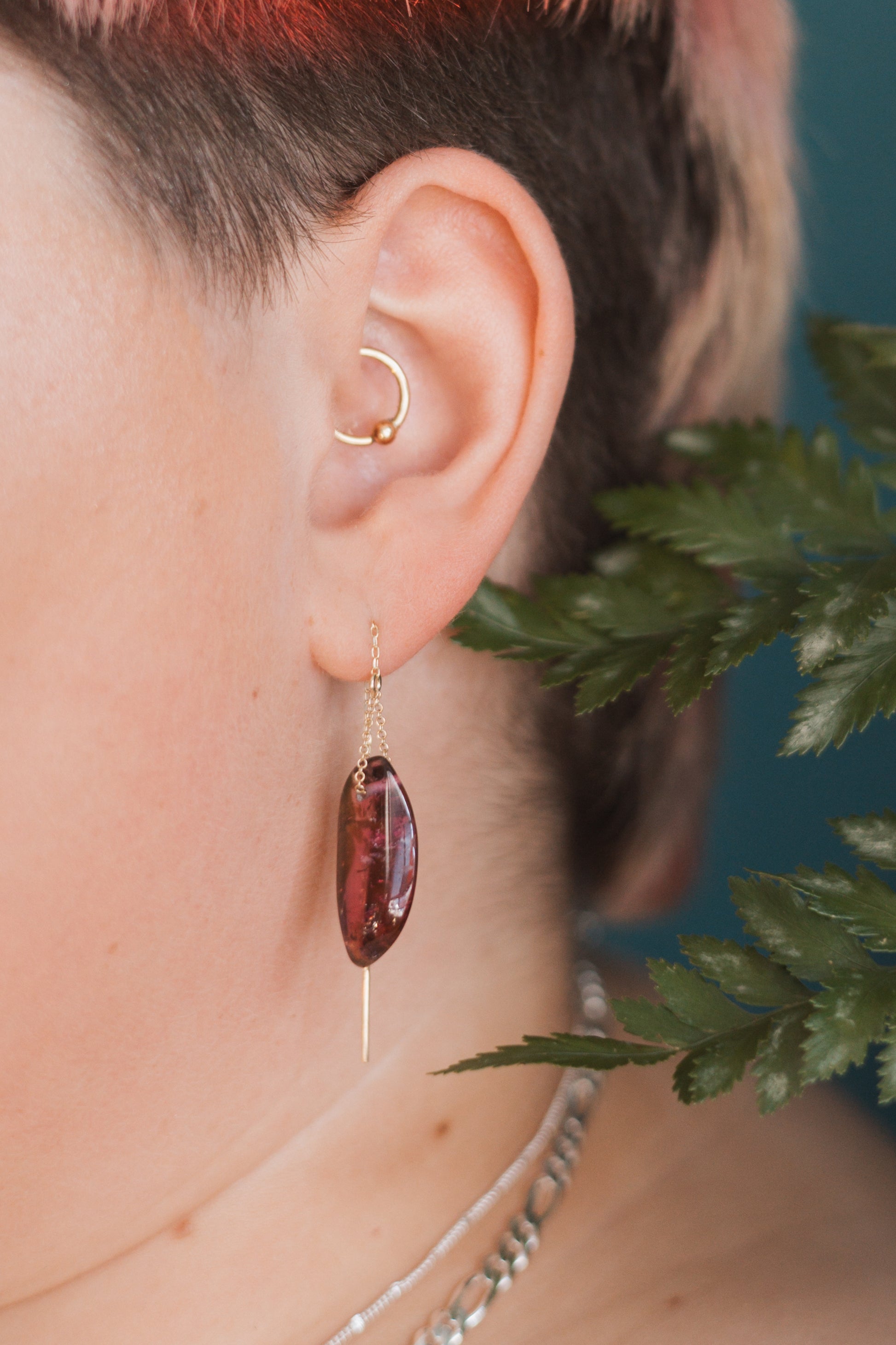 This threader style earring features a totally natural 14.58ct Pink Tourmaline gemstone. This highly saturated, glossy gemstone is from Brazil, which is known around the world for its amazing tourmaline and a plethora of other gorgeous minerals. The chain threads through a hand-drilled hole in the stone, and through your ear to secure it to you. It would pair beautifully with a pair of 14k yellow gold stud earrings, with or without another gemstone. This earring is truly one of a kind!