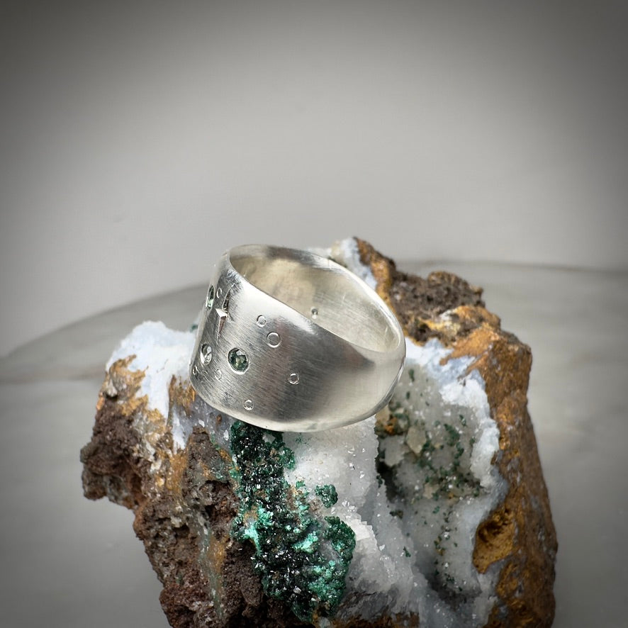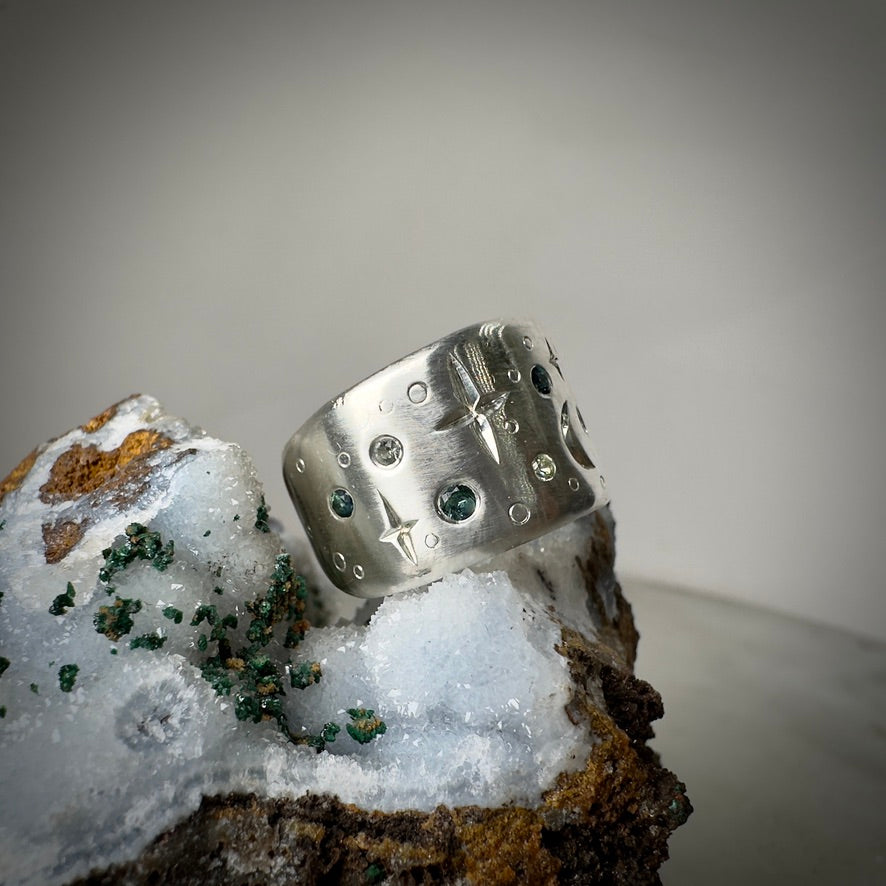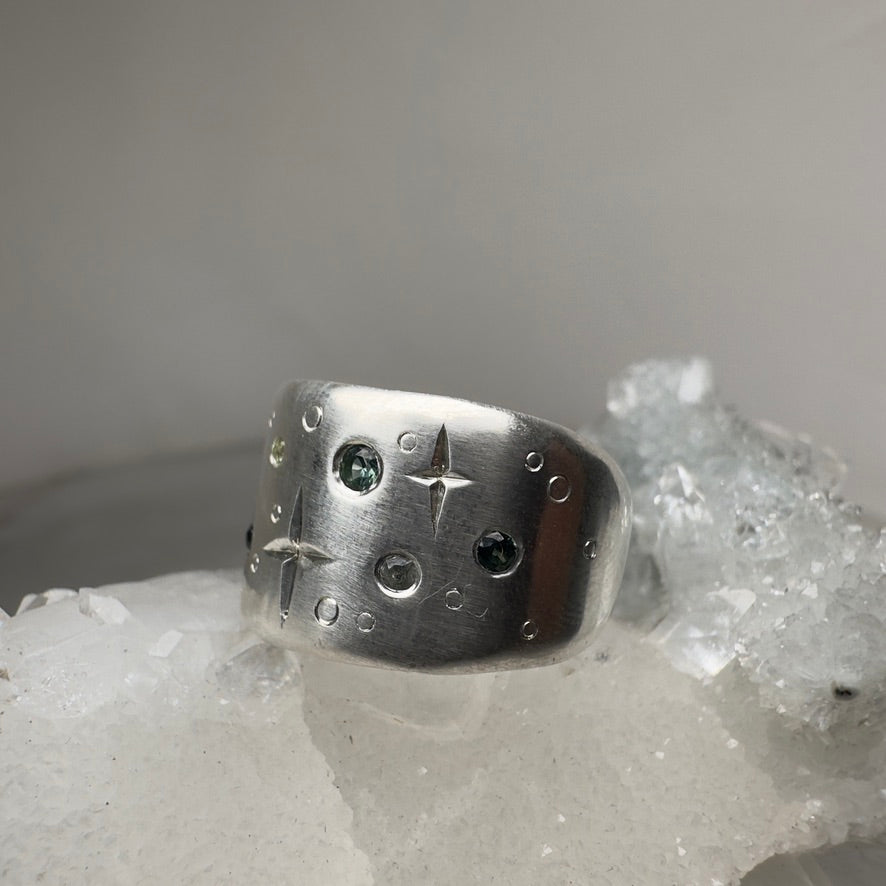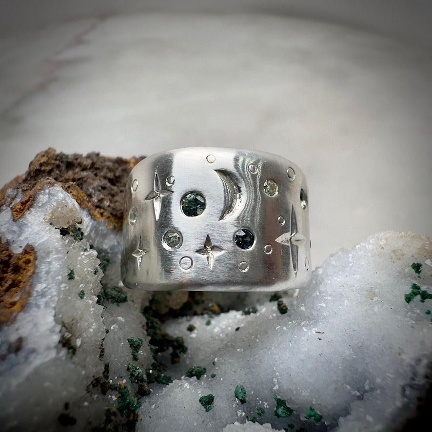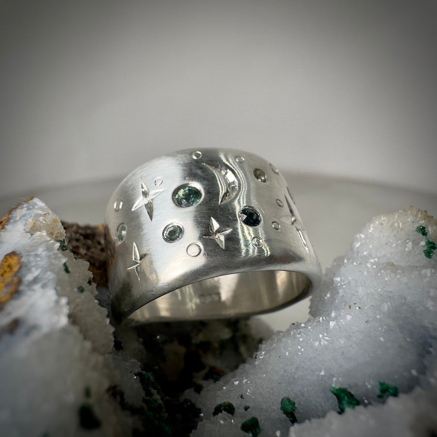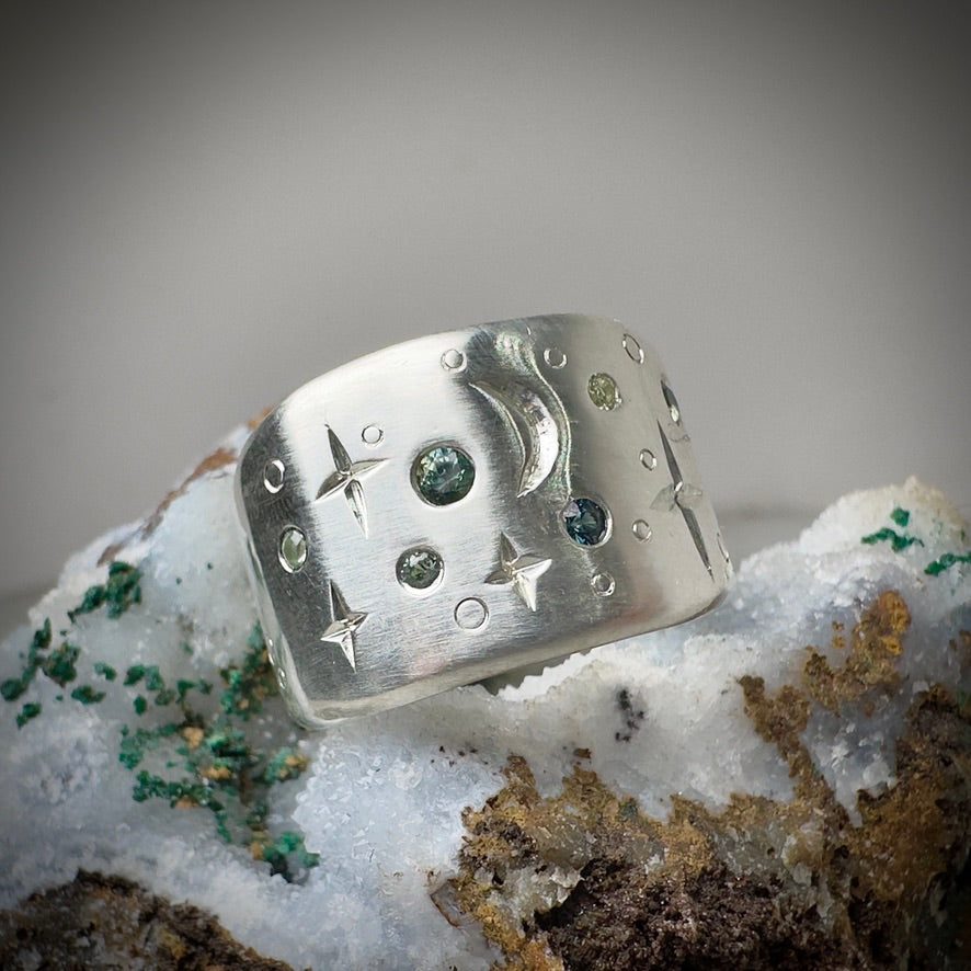 This celestial inspired ring features a constellation of natural Montana Sapphires which were flush set in a brush finished sterling silver band. Surrounding the teal, blue and green gemstones are several hand-engraved stars and a crescent moon.