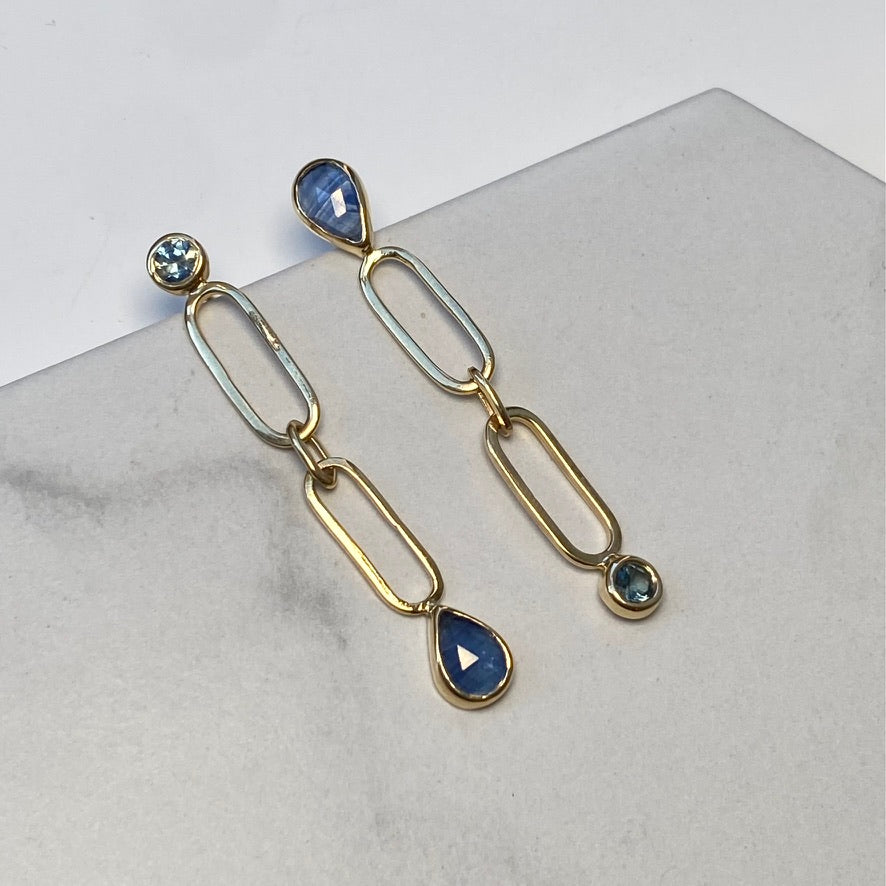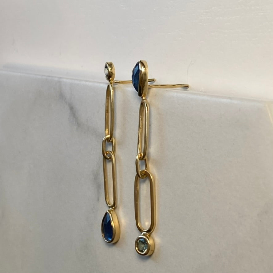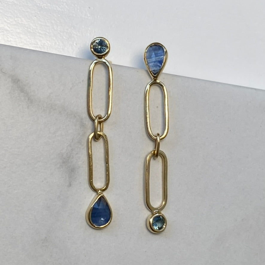 Sapphires are found in so many places around the world, and the sapphires in this pair of earrings come from two of our favorite locales for this beautiful gemstone. The small round sapphires are from Montana, USA, and the pear shaped rose cut sapphires are from Madagascar.