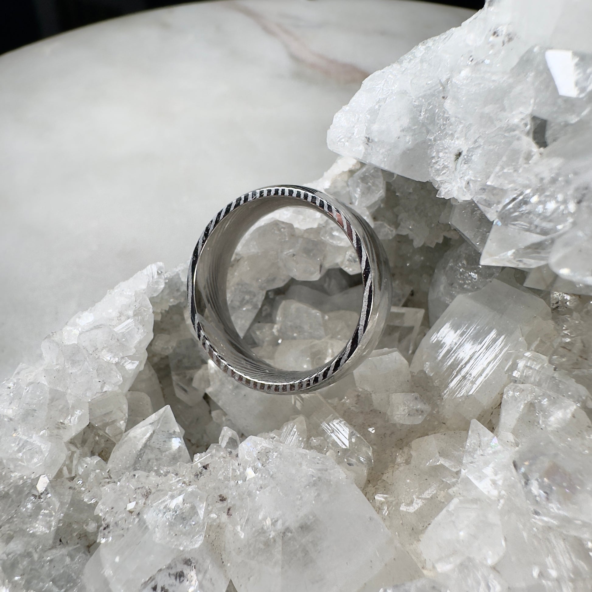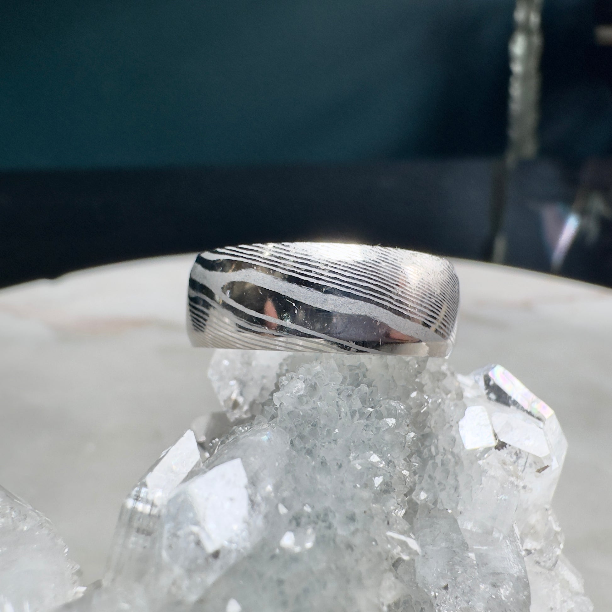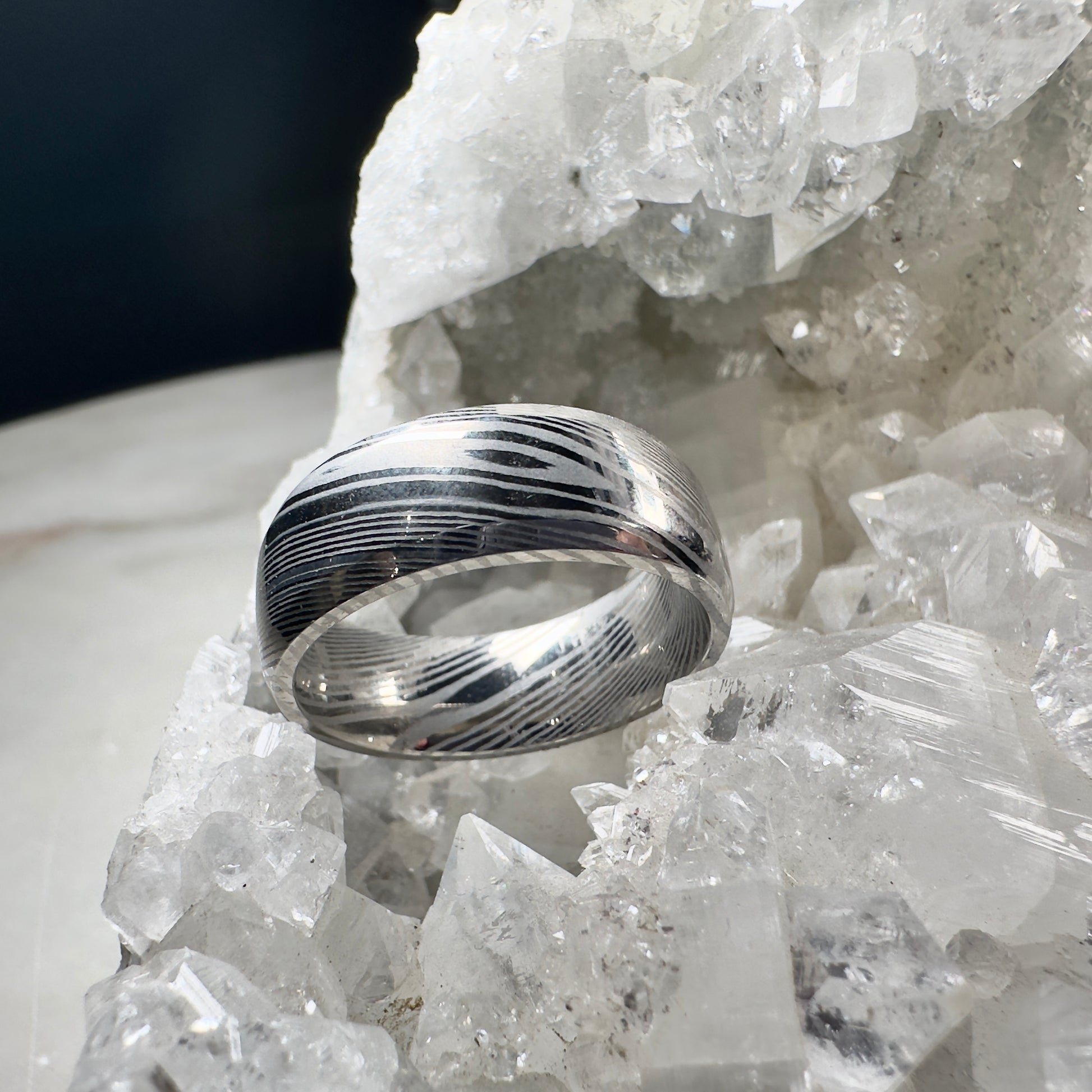 Upgrade your style with our elegant Silver Damascus Steel Ring, featuring a beveled profile and measuring 8mm in width. Its rounded interior, known as 'comfort fit', ensures a comfortable wearing experience. This versatile ring is suitable for all genders and can be used to represent commitments or as a daily fashion statement. Customize your order to your desired size, as resizing is unavailable for this and all of our damascus steel rings.