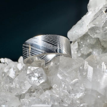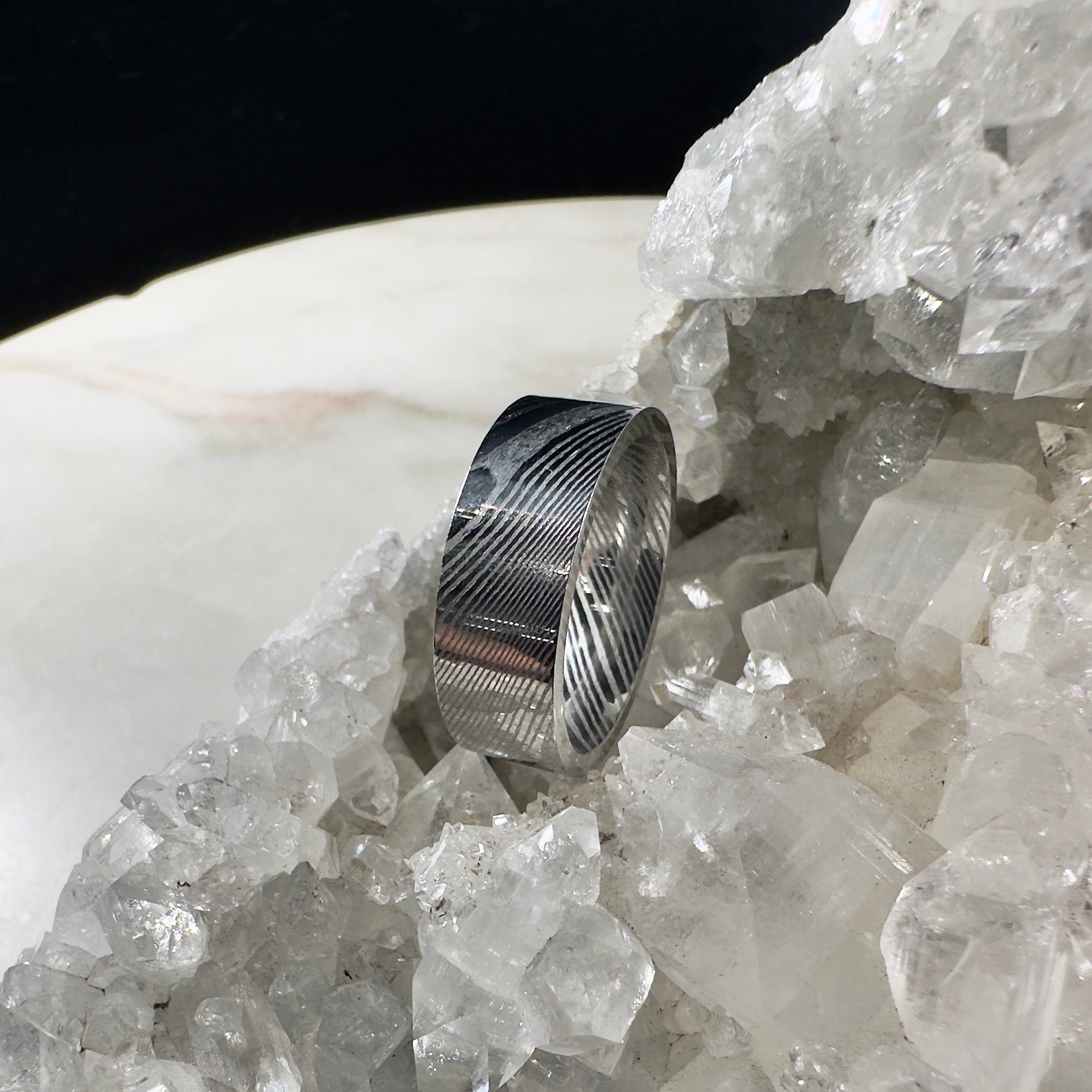 Enhance your fashion with our sleek Silver Damascus Steel Ring, showcasing a Flat Profile and measuring 8mm in width. It has a squared off edge and a rounded interior known as 'comfort fit' for its comfortable wear. Suitable for all genders, this ring is perfect for symbolizing commitments or as an everyday statement piece. Personalize your order to your preferred size, as resizing is not possible for this ring, as well as all of our damascus steel rings.