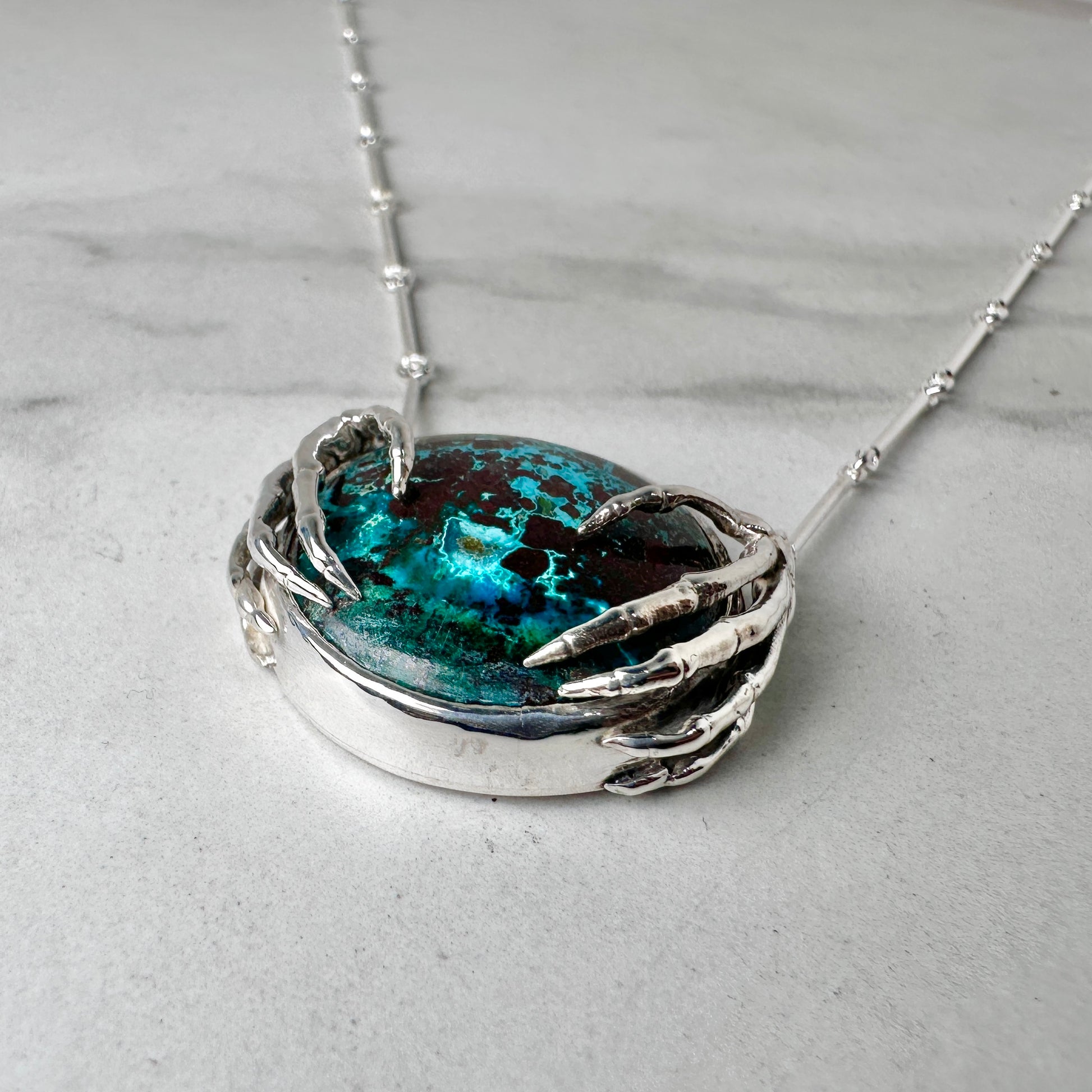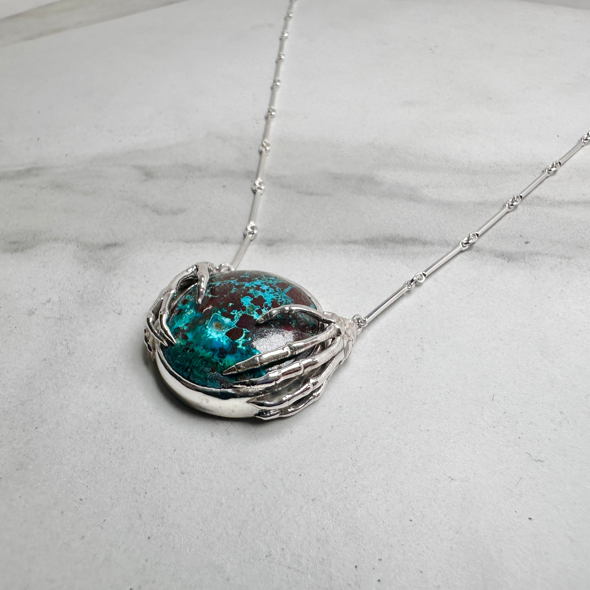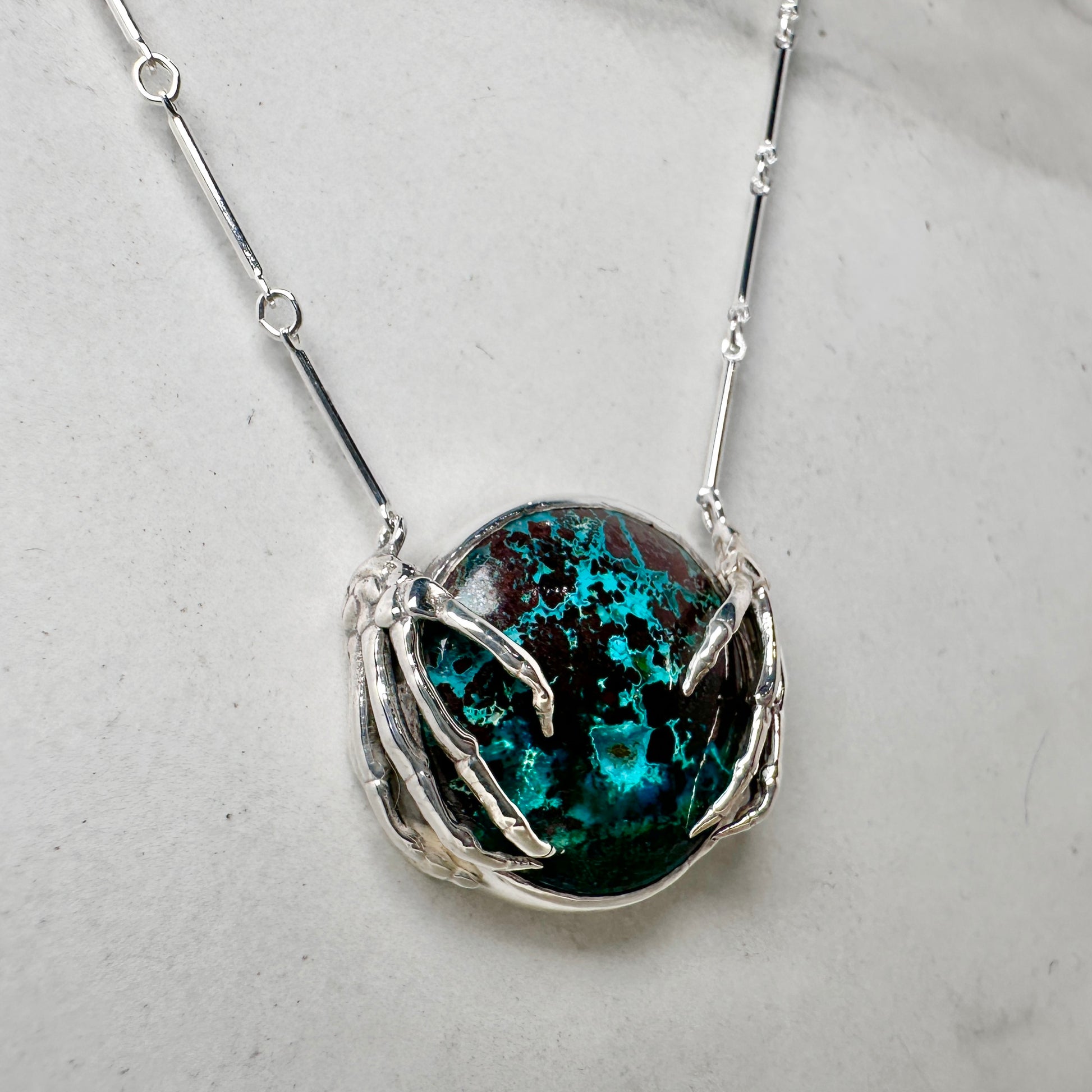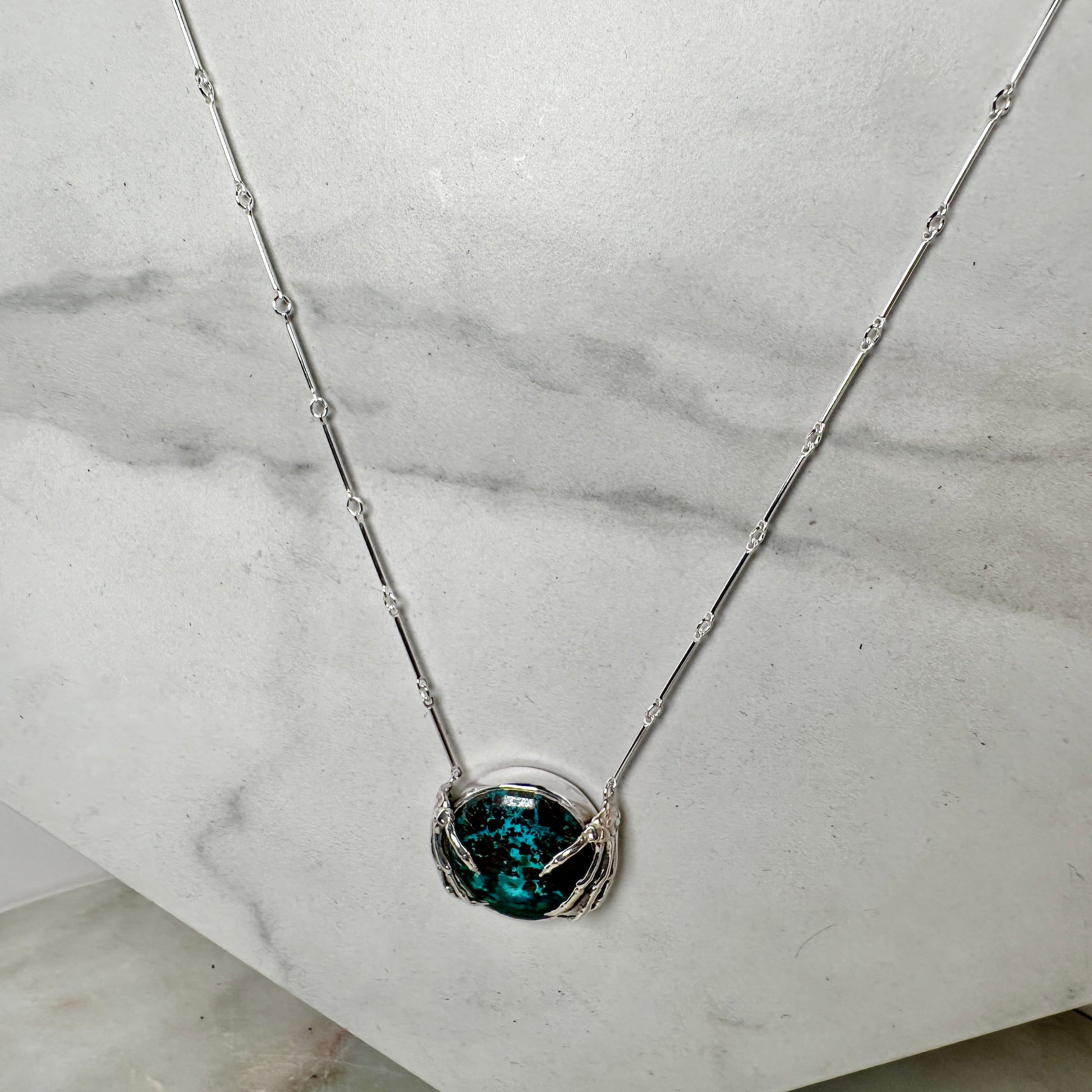 Brightly polished sterling silver skeleton hands cradle a striking Chrysocolla gemstone sourced from Arizona, creating a unique blend of edgy design and natural beauty. Handcrafted with meticulous attention to detail, this necklace hangs on an 18” bar and link chain, secured with a reliable lobster clasp for everyday wear. The piece offers free length adjustments to ensure a perfect fit, making it both a bold statement and a versatile accessory. Whether layering or wearing alone, this necklace adds an artful touch to any outfit while celebrating craftsmanship and distinctive style.