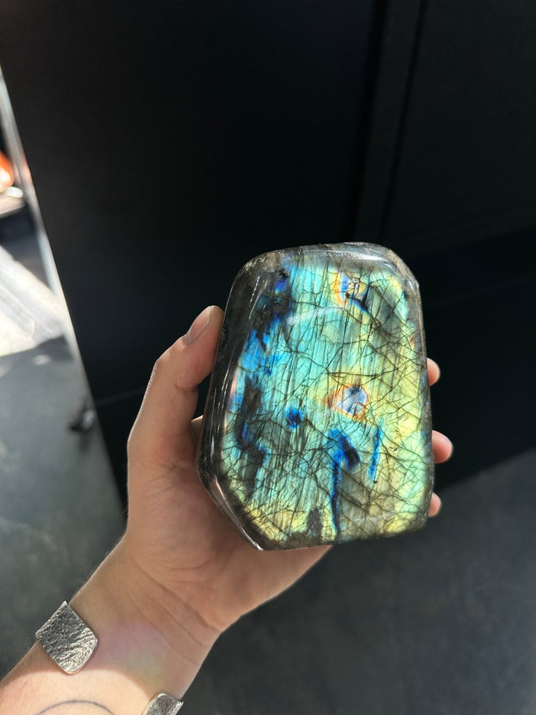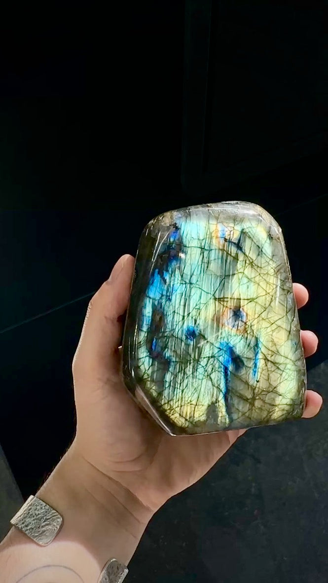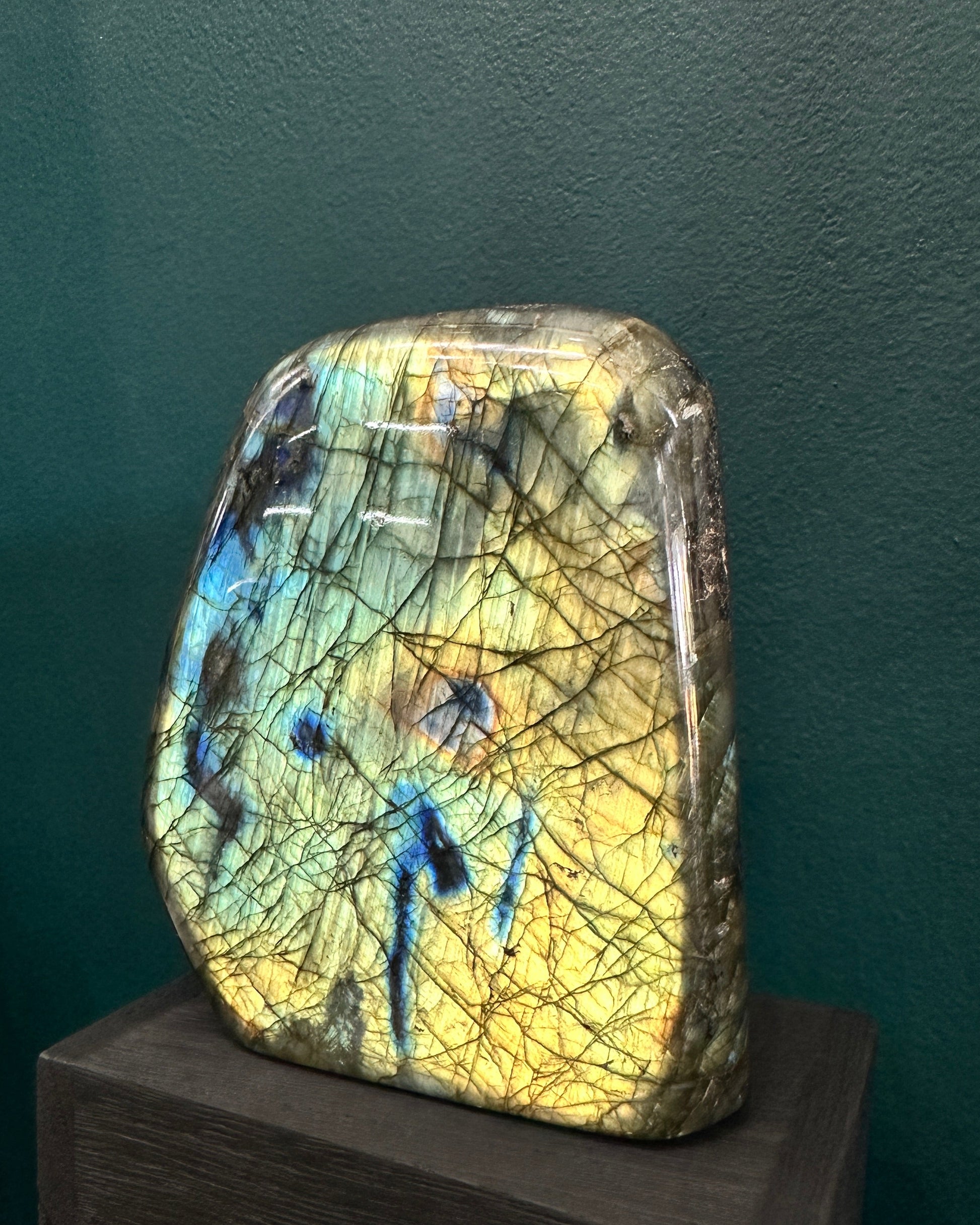 This small polished labradorite piece displays beautiful yellow highlights with scattered flecks of green, blue, and orange throughout. It was mined in Madagascar. It is 3.25" wide x 4.25" tall x 1.75" thick, which is perfect for a small display case or on display in your home!