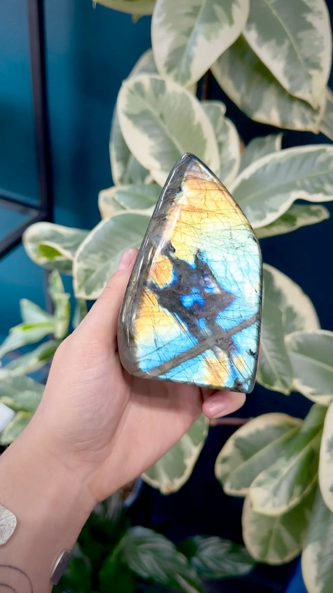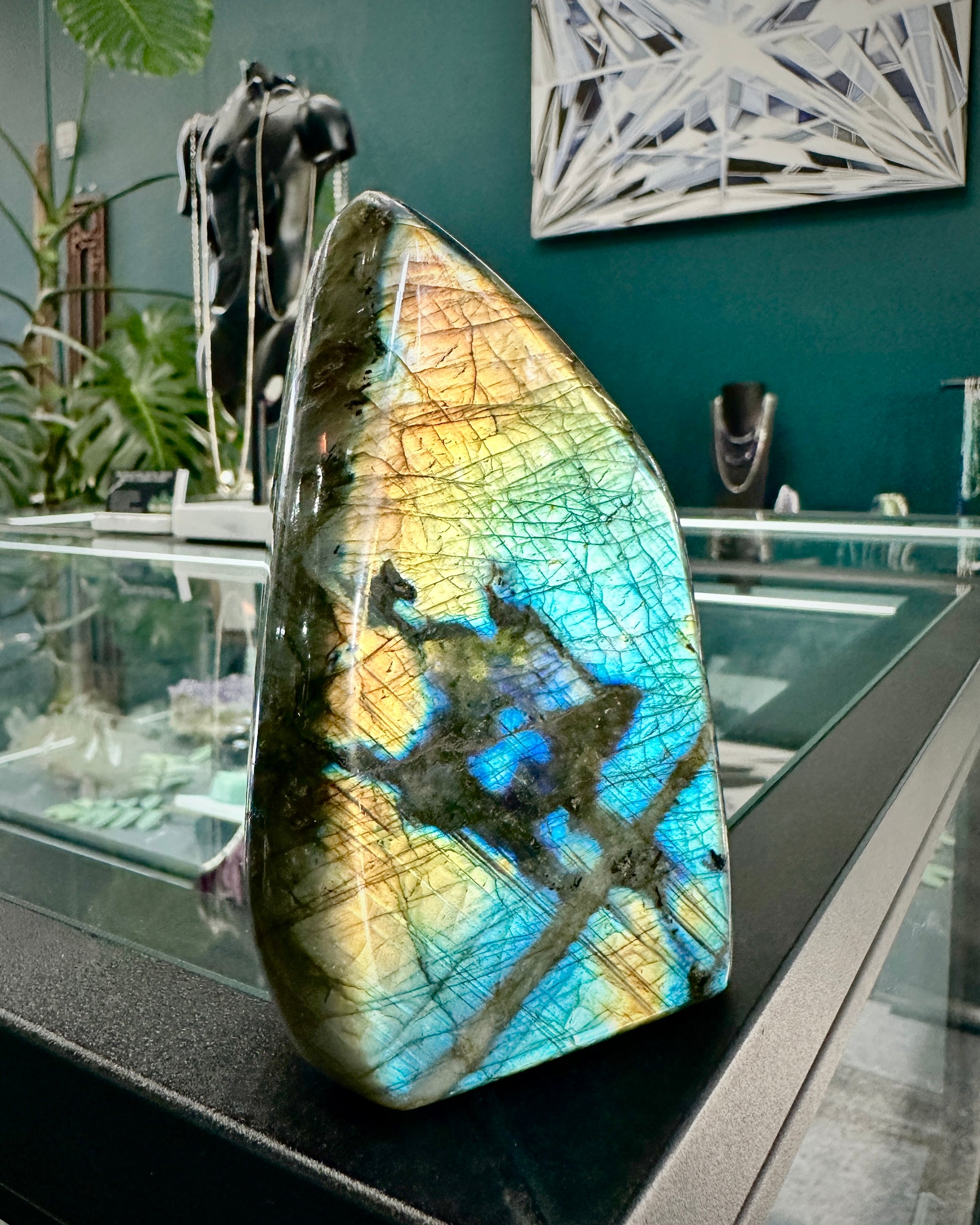 This polished freeform chunk of labradorite from Madagascar features a shimmering rainbow flash, adding a glow of natural beauty and positive energy to any mineral & crystal collection.