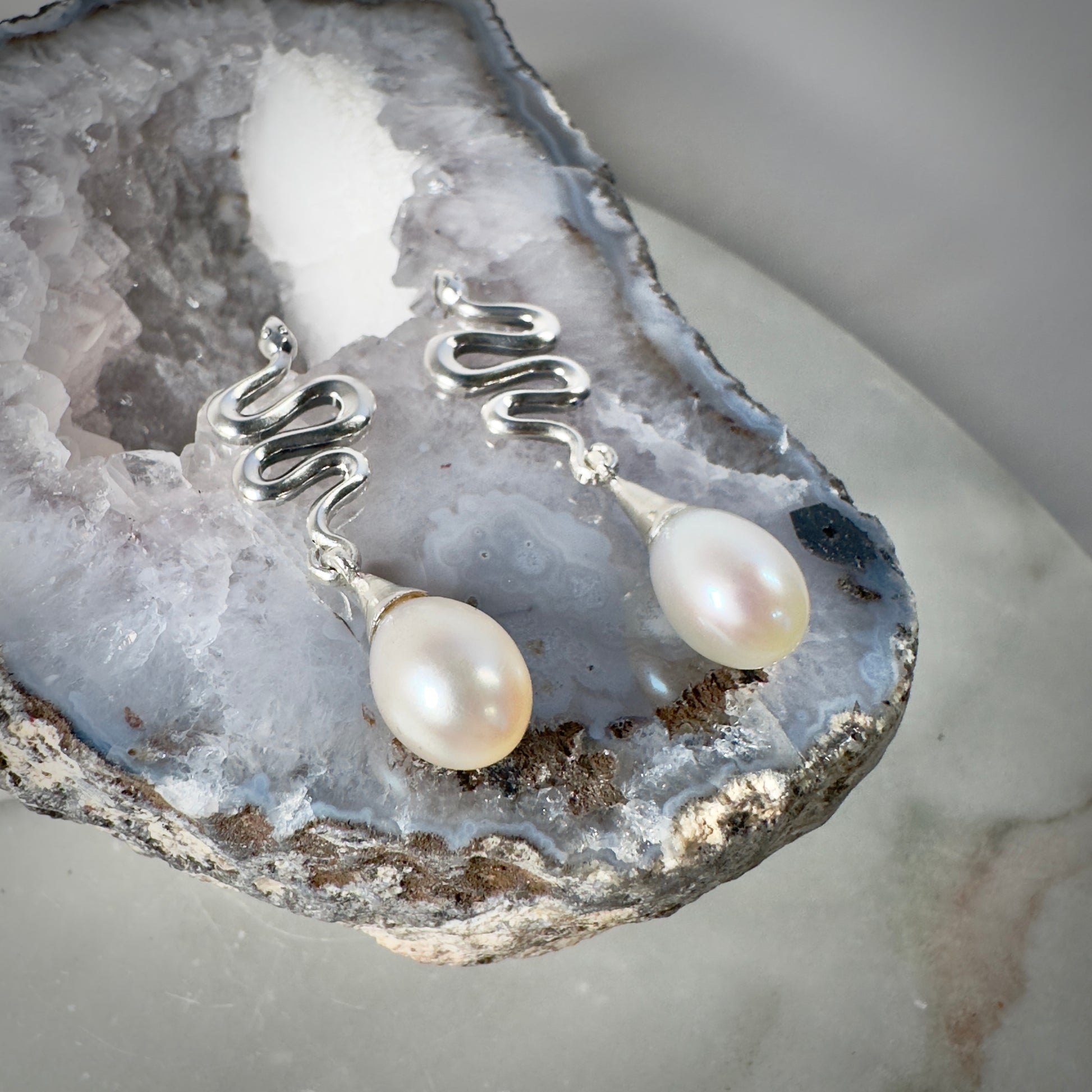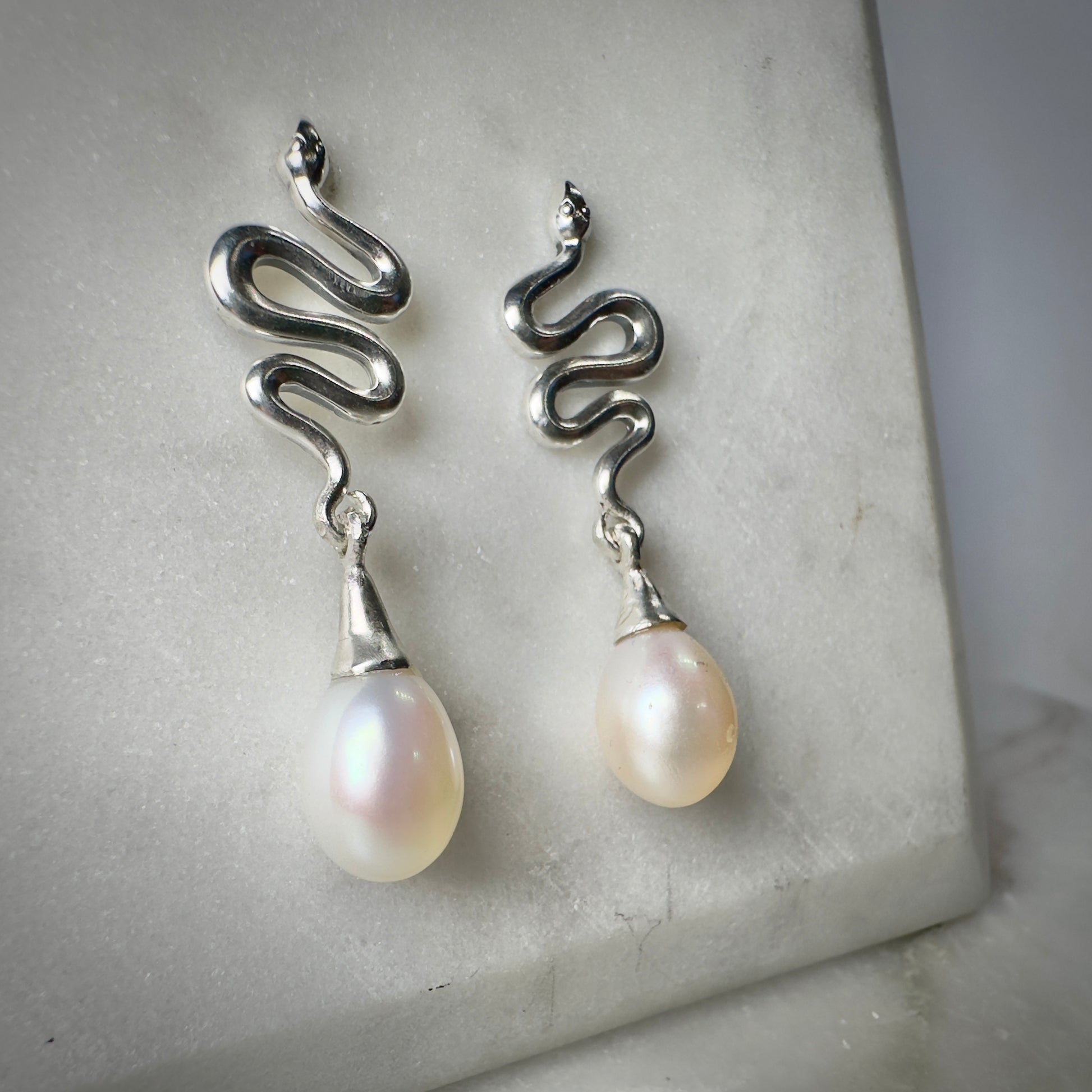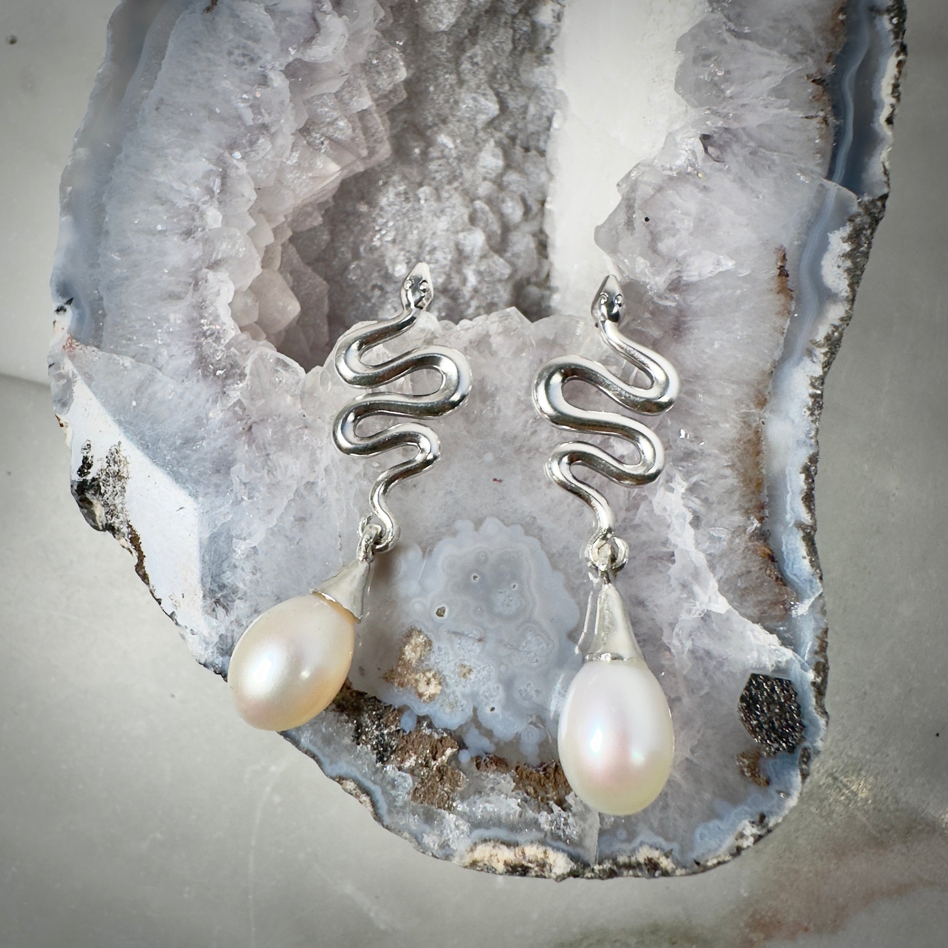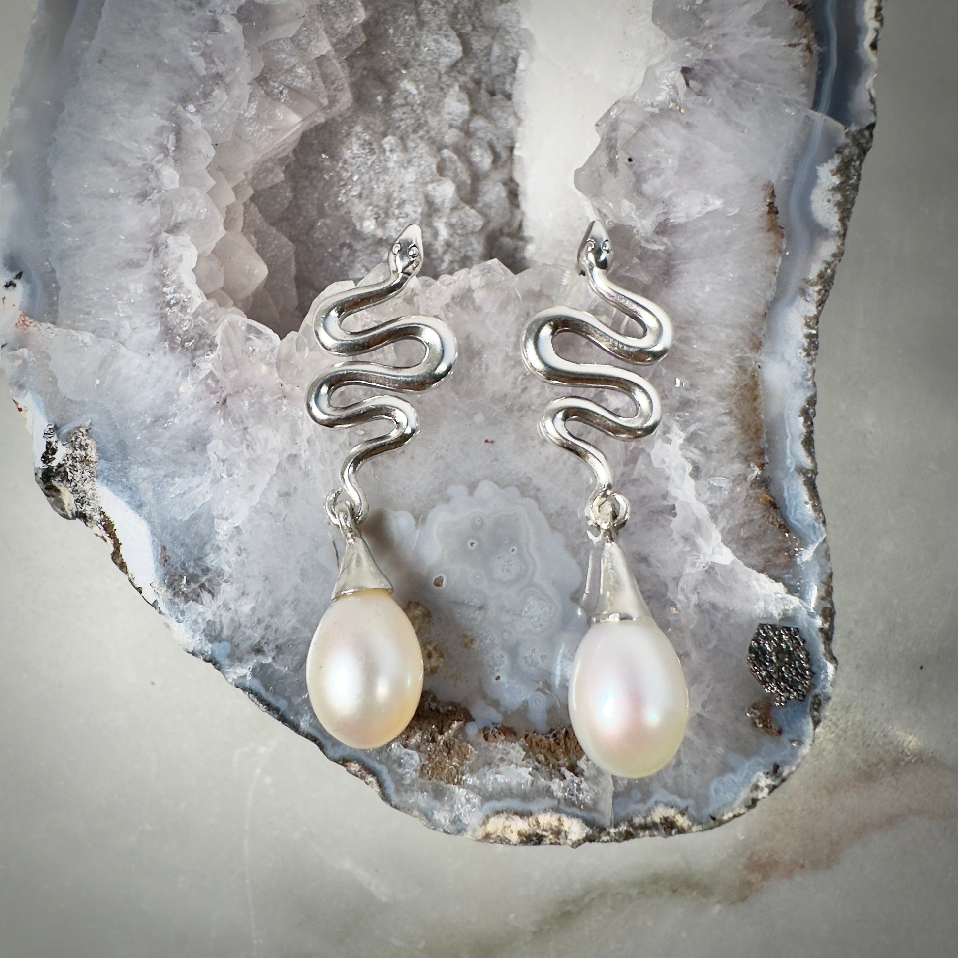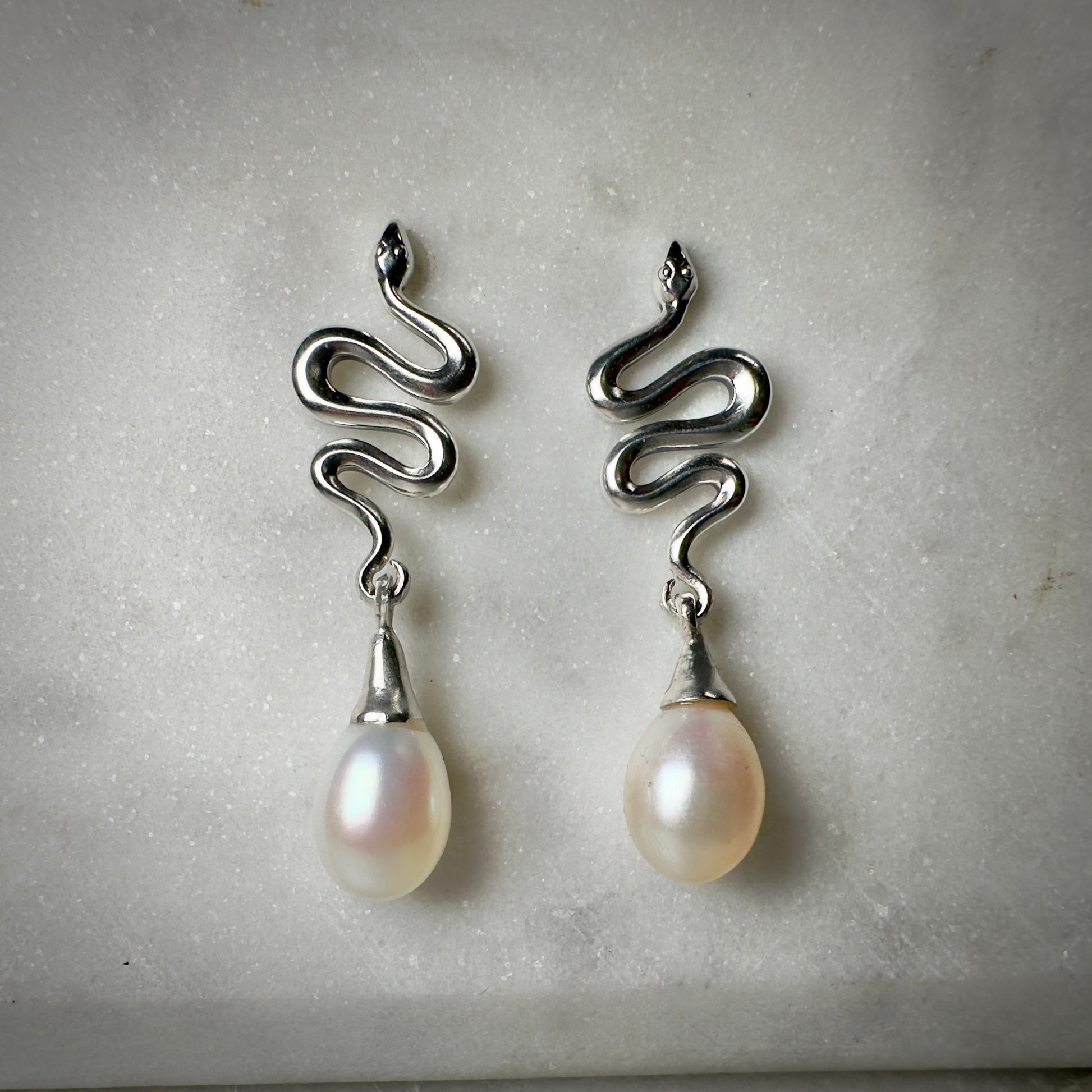 Enhance your elegance with these stunning Snake Pearl Drop Earrings. The serpents, crafted from sterling silver, hold a single freshwater pearl that radiates an irresistible iridescent glow. These earrings easily secure to your ear with a standard size post and friction back.