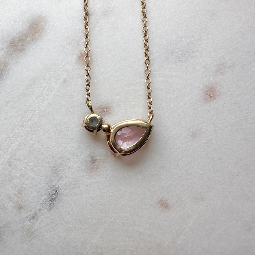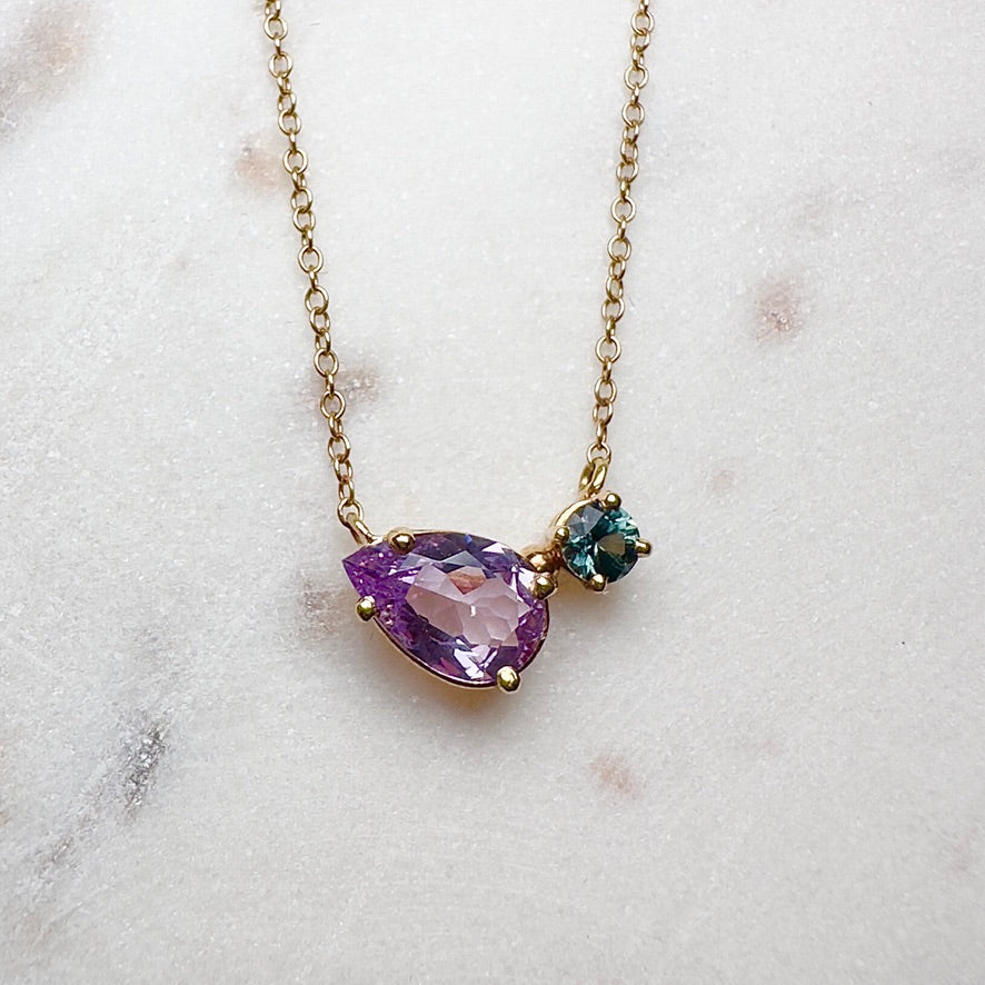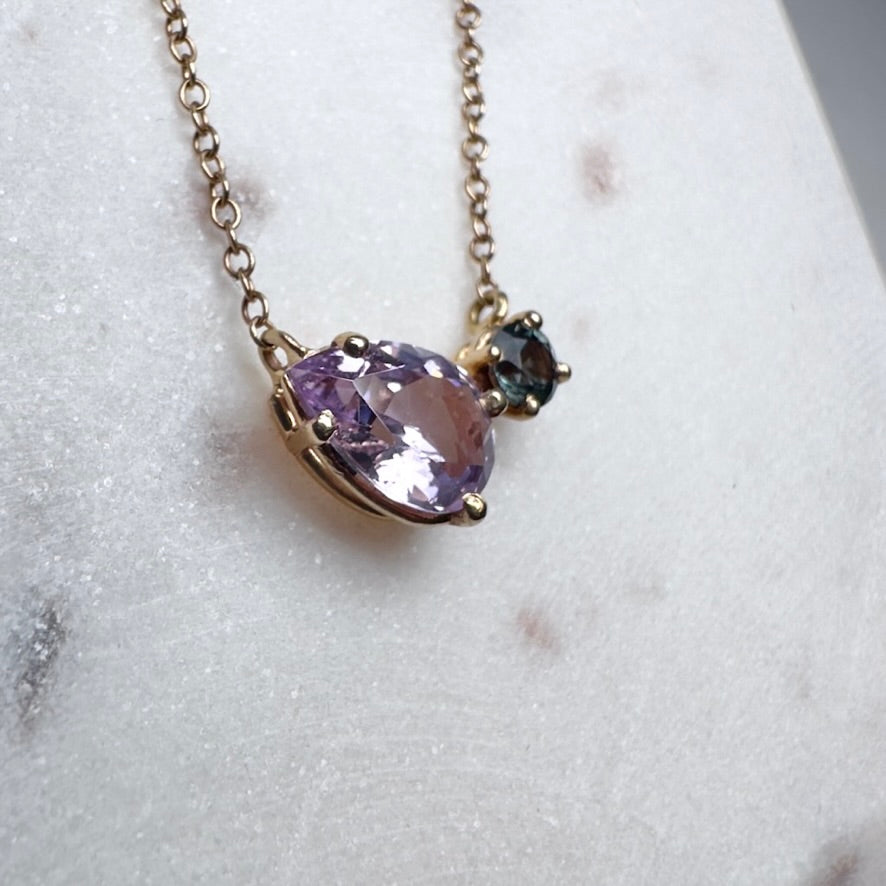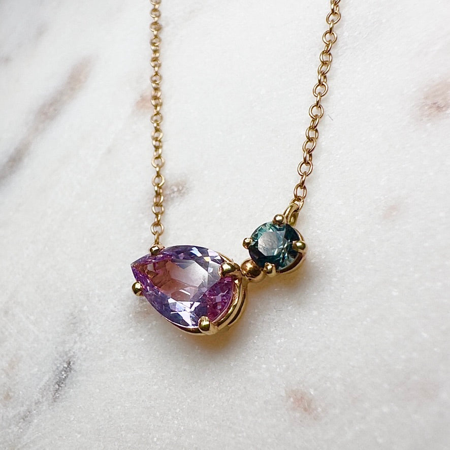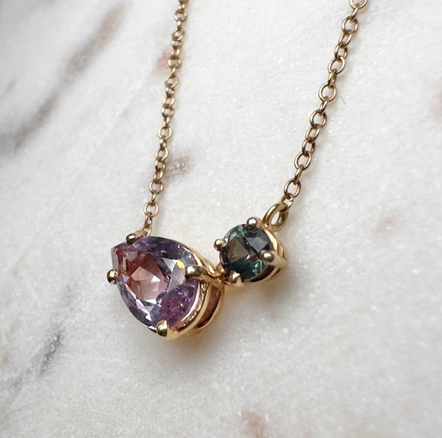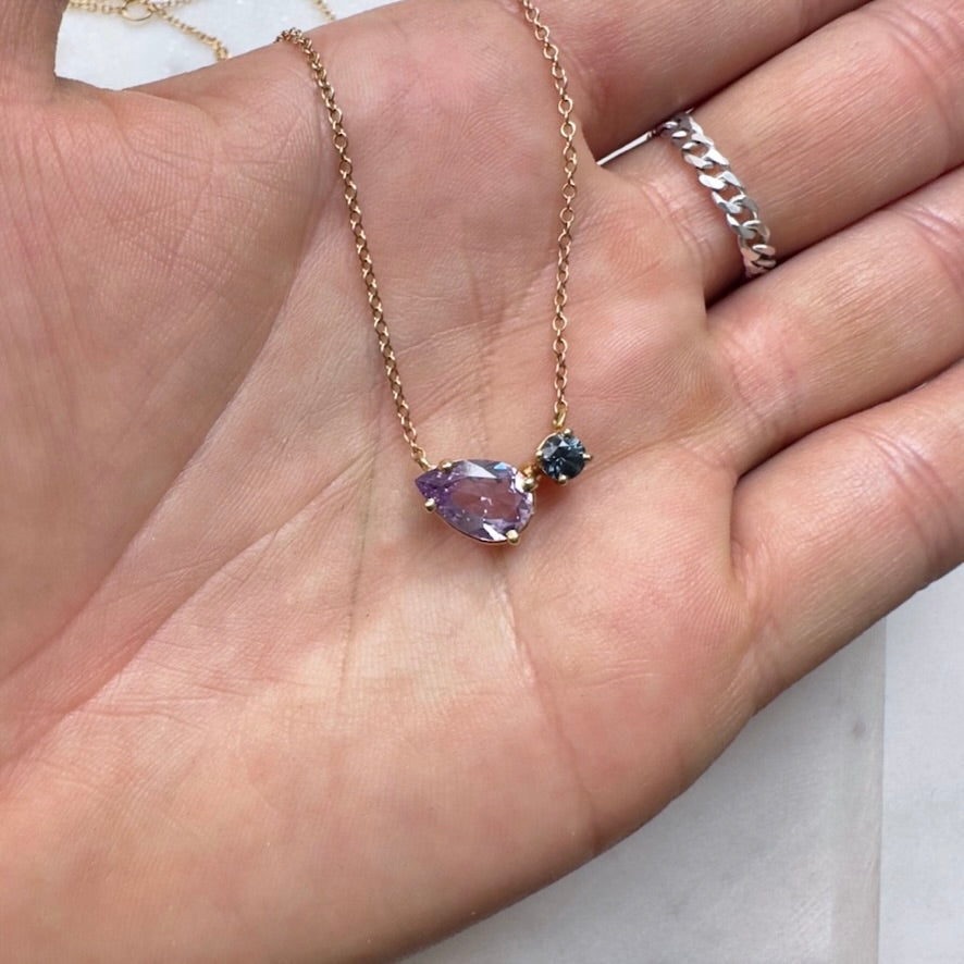 This necklace features a stunning pastel purple Spinel, weighing 1.38 carats. Next to it sits a teal Montana sapphire that is .32 carats. They are both set in four-prong settings, which allows for lots of light to enter the stones and show their beautiful sparkle. The pendant is fixed to a 16-18” cable chain with a standard size lobster clasp.