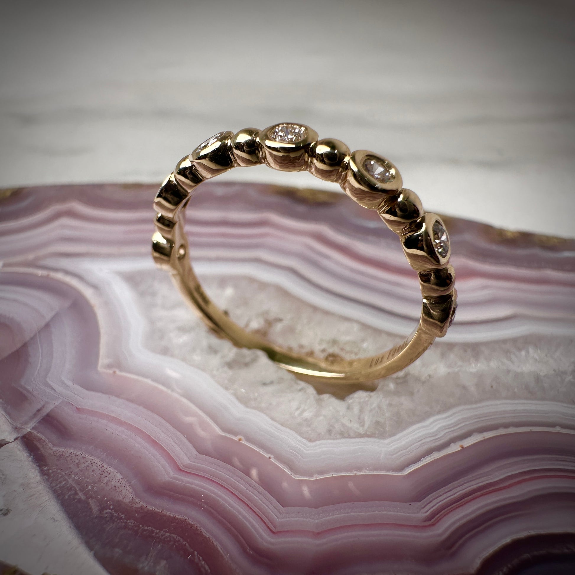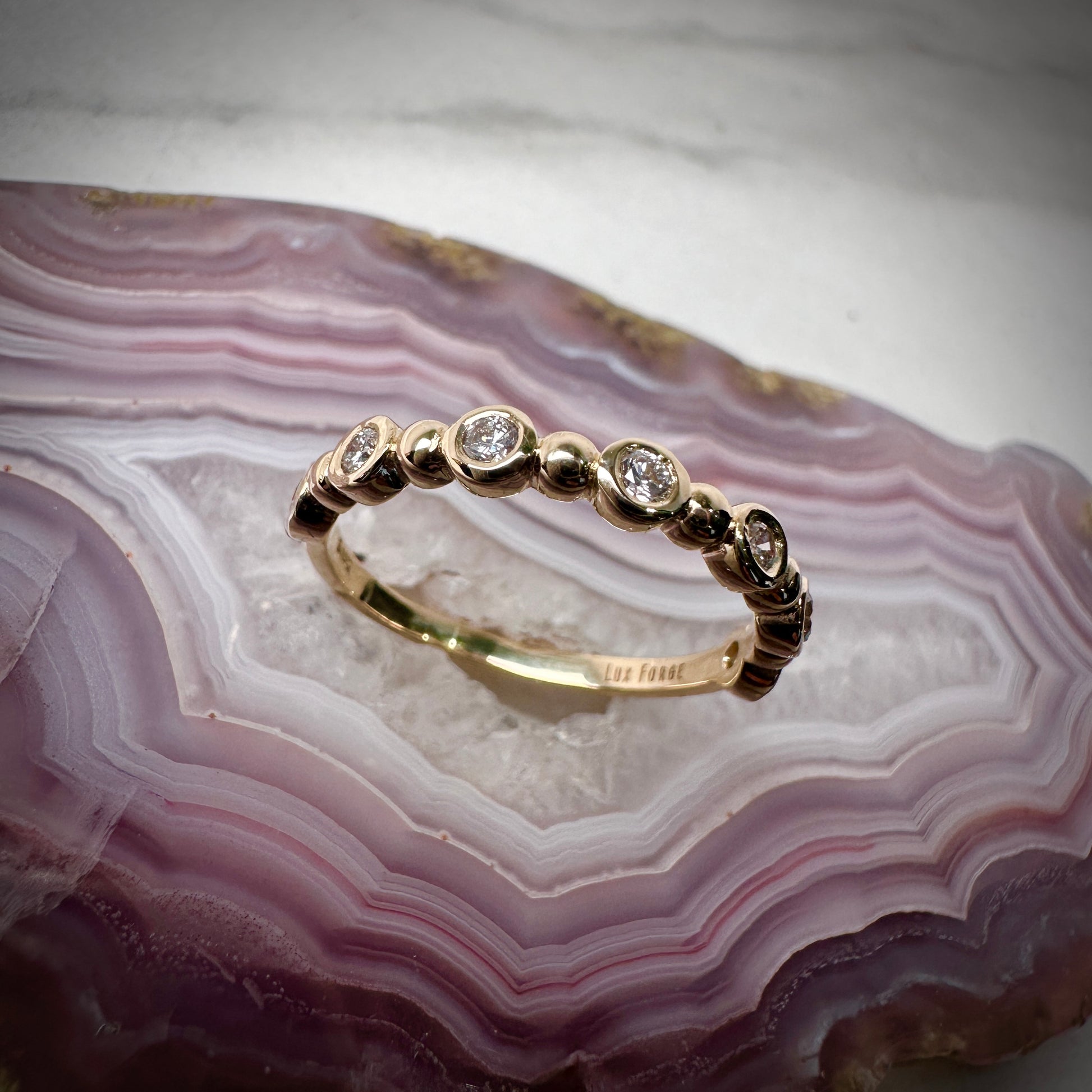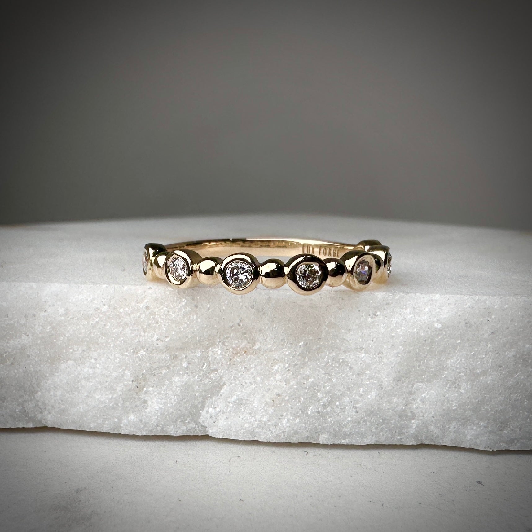 This elegant, contemporary ring features 7 F+ Color, VS1+ Clarity Lab Grown Diamonds, which weigh .21 carats in total. They are all bezel set in a 14k yellow gold setting, and are interspaced with highly polished spheres. This ring would be a fantastic option for an anniversary band, wedding band or other stacking ring!