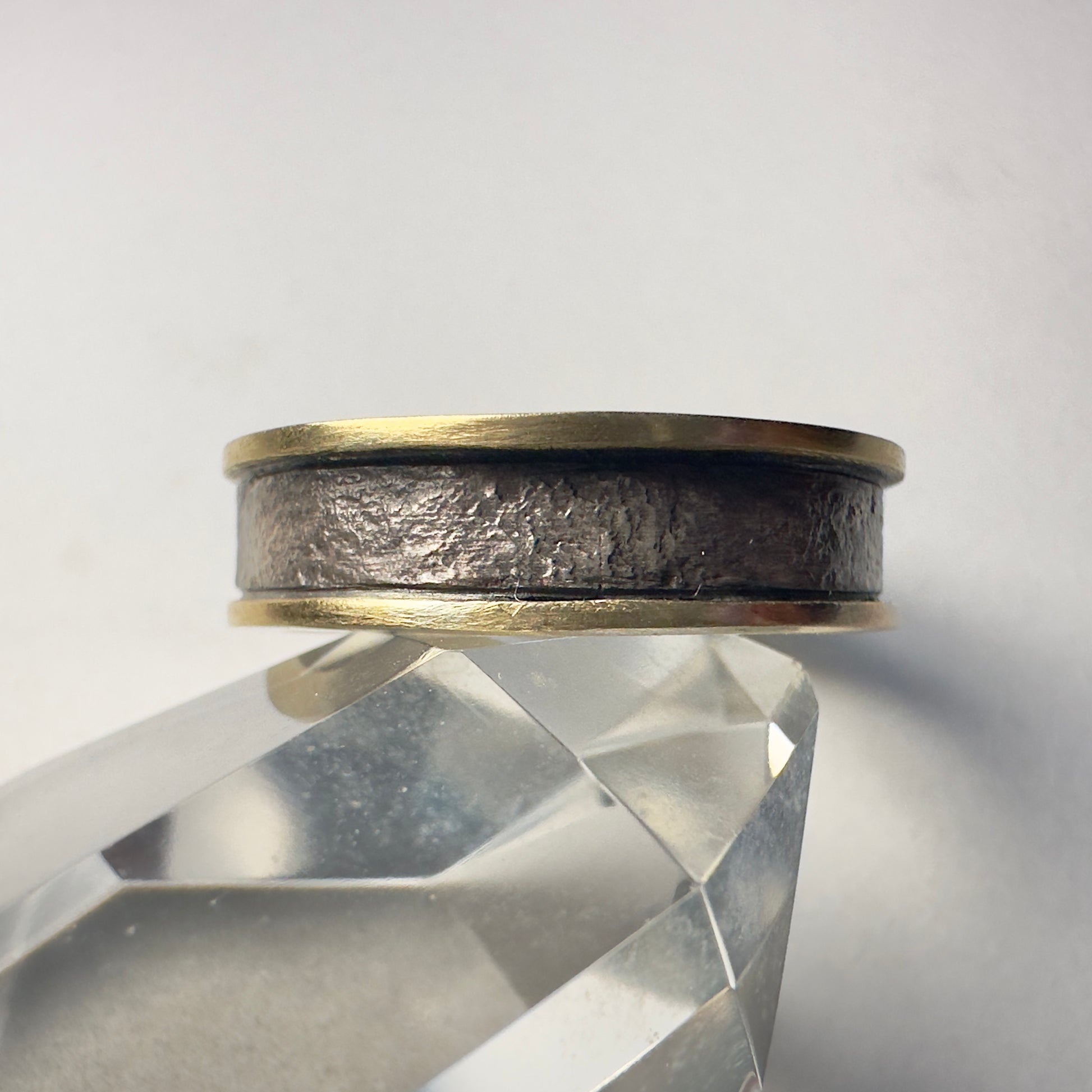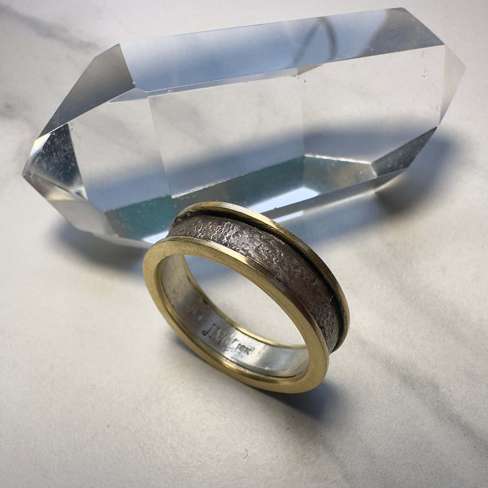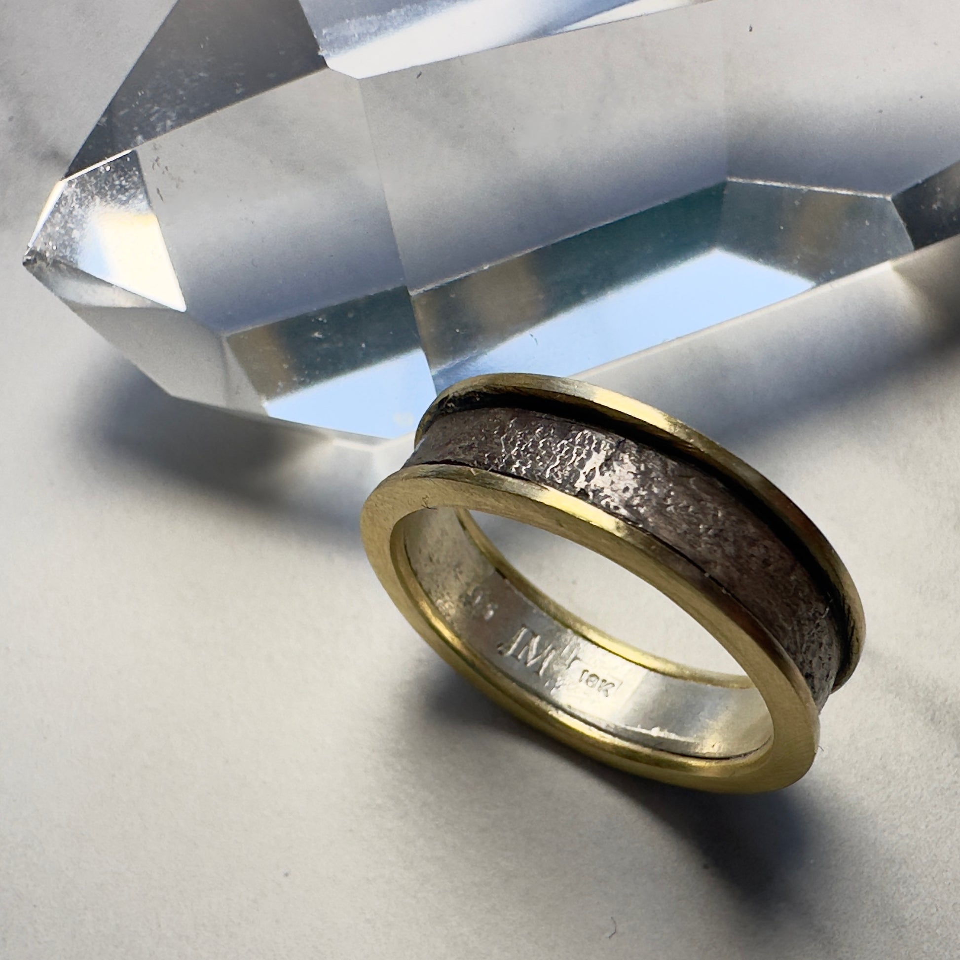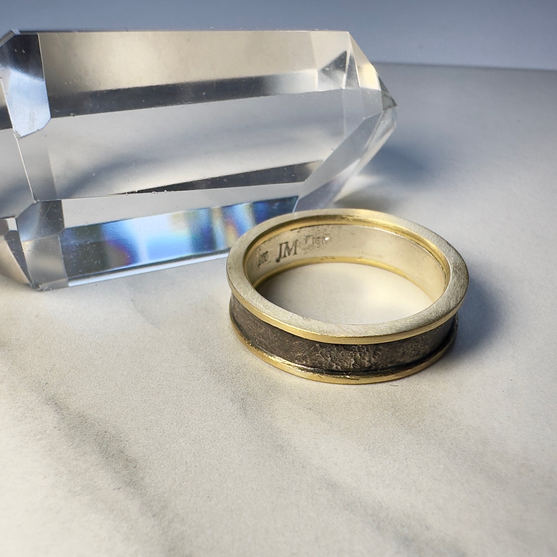 This genderless band ring features our signature granite texture in the center sterling silver layer, which has been blackened to enhance the organic texture. The outer two bands are made from 18k yellow gold, which has been matte-finished to align with the natural aesthetics of this ring.
