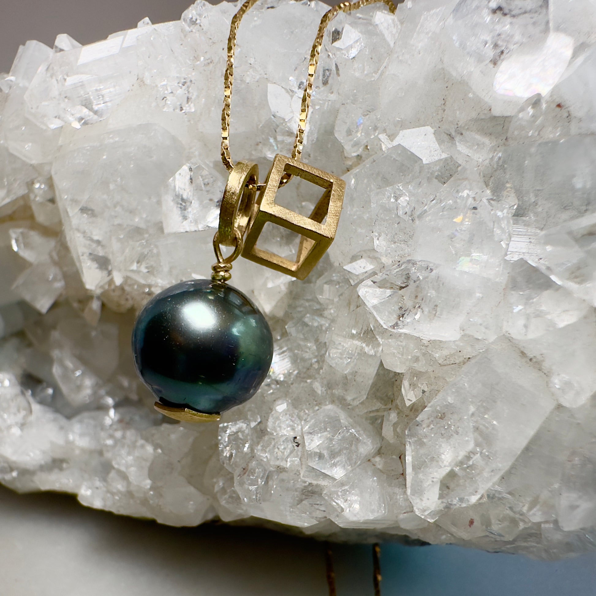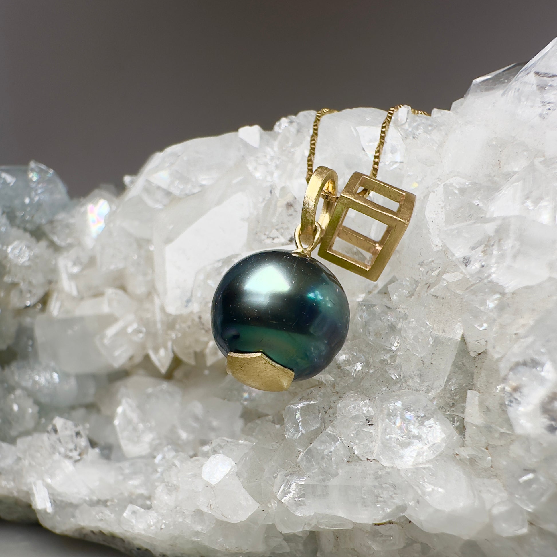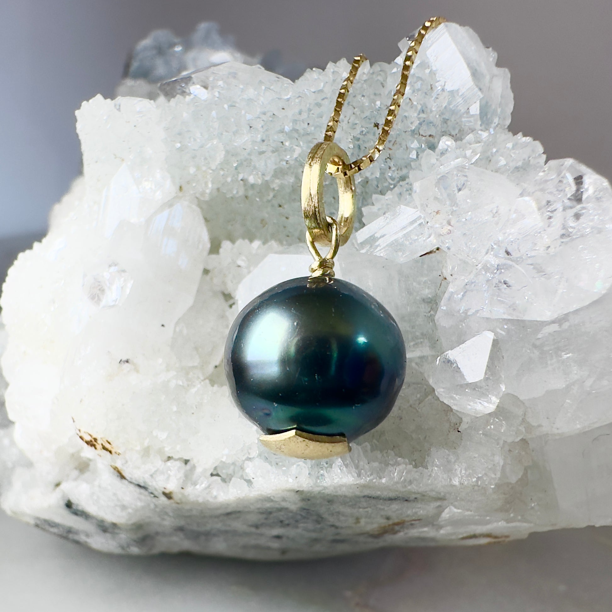 Embrace versatility and elegance with this unique Tahitian pearl charm. Crafted with meticulous attention to detail, this exquisite piece showcases a natural Tahitian pearl, which are known for their iridescent peacock hues and lustre. A handmade 18k yellow gold setting provides a warm, luxurious contrast to the pearl's deep tones