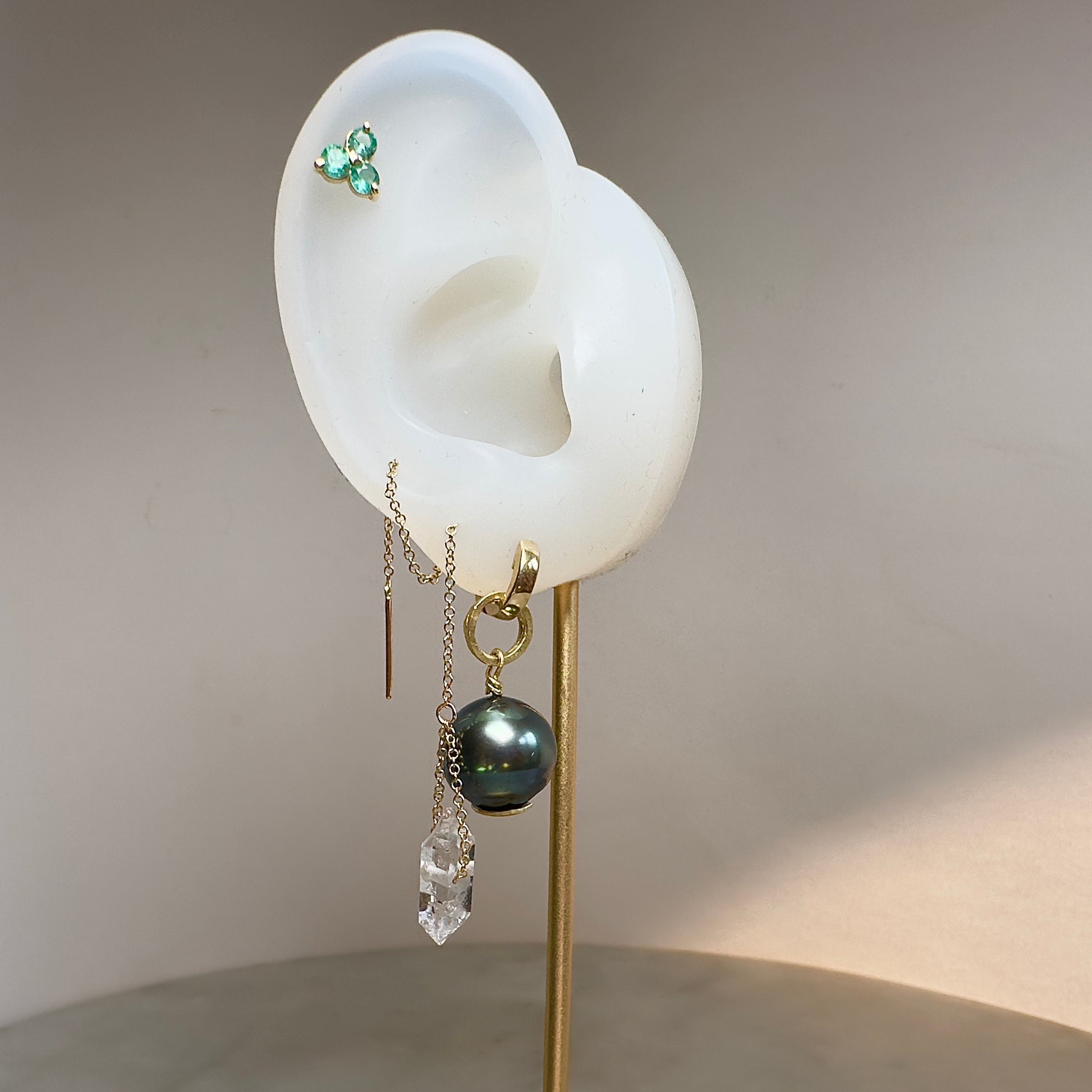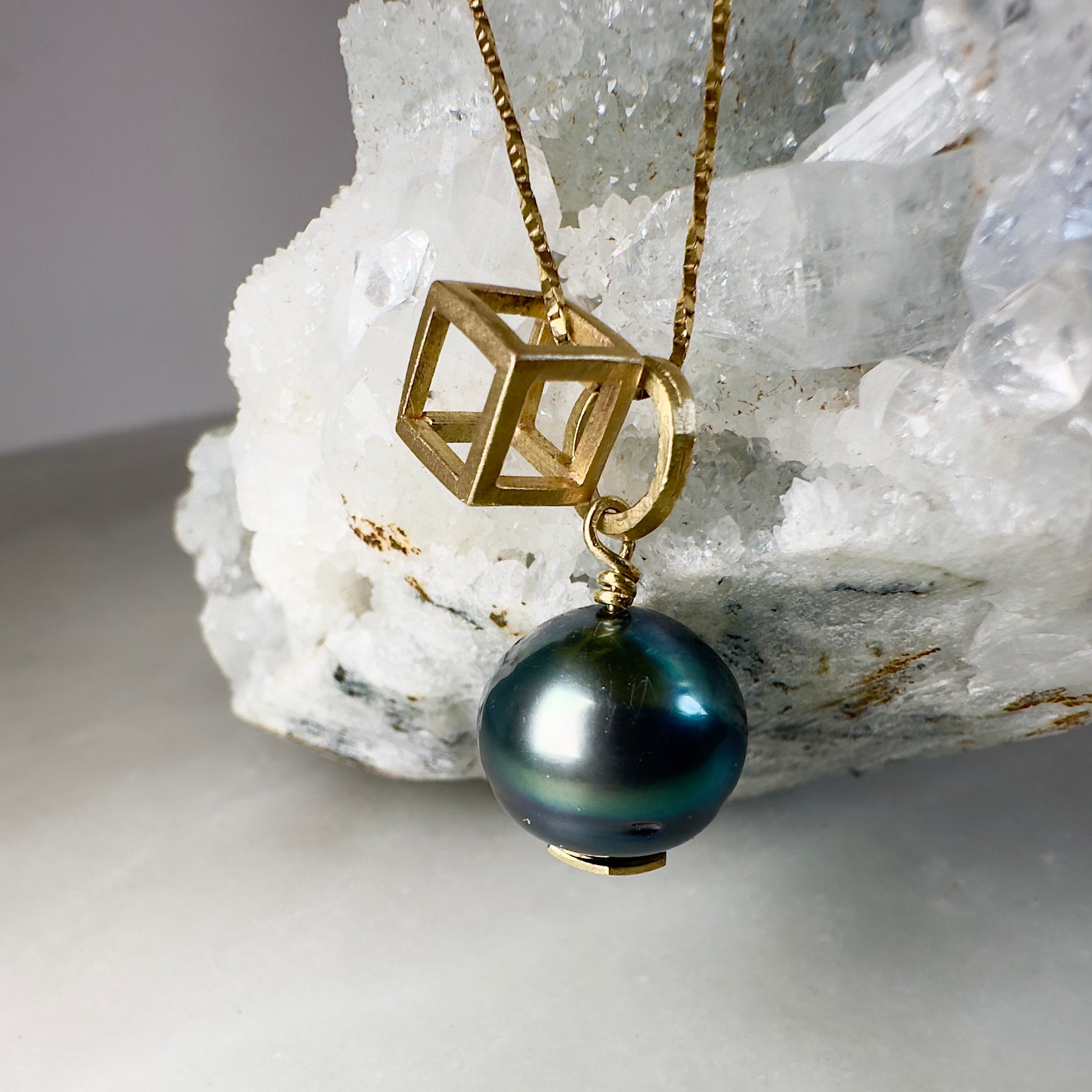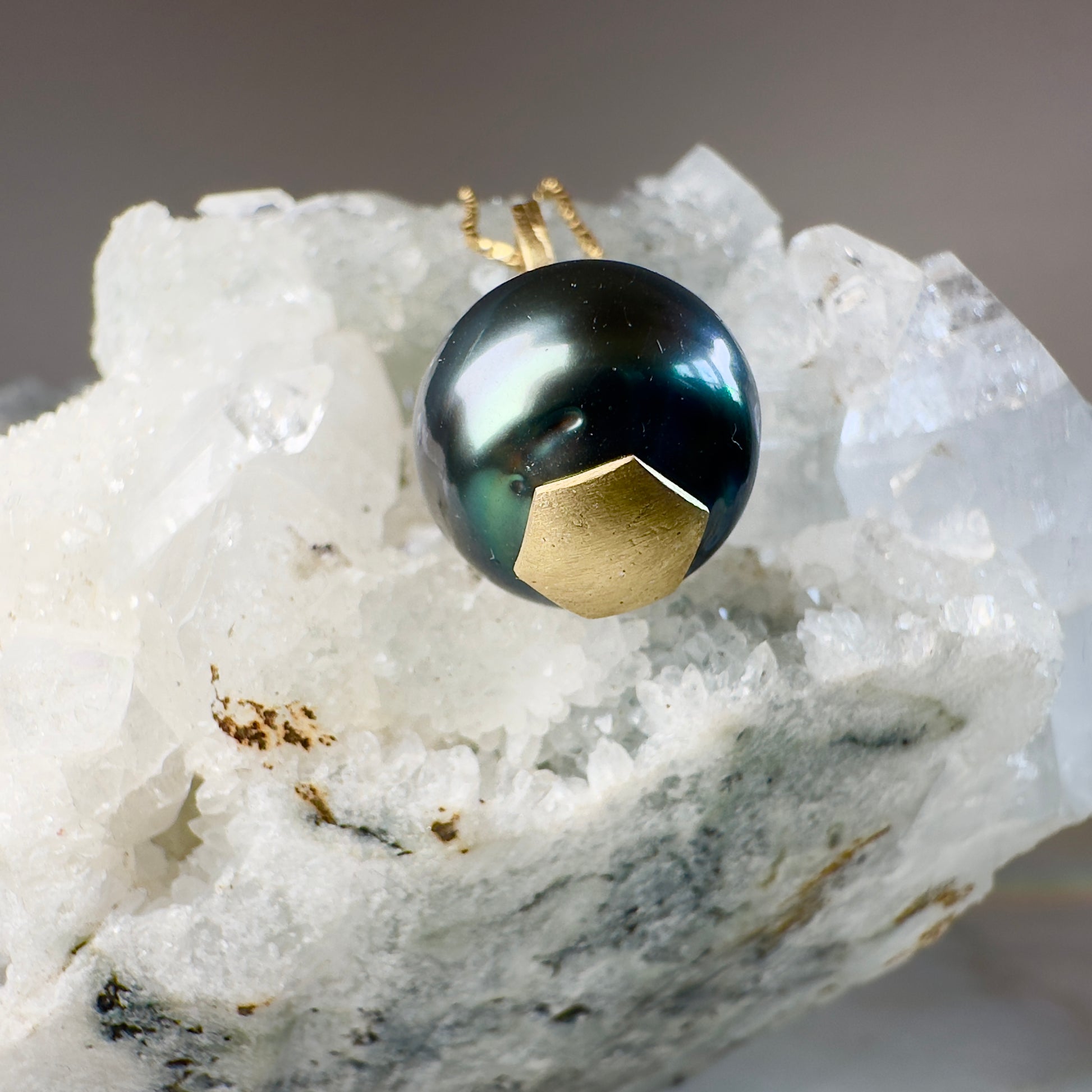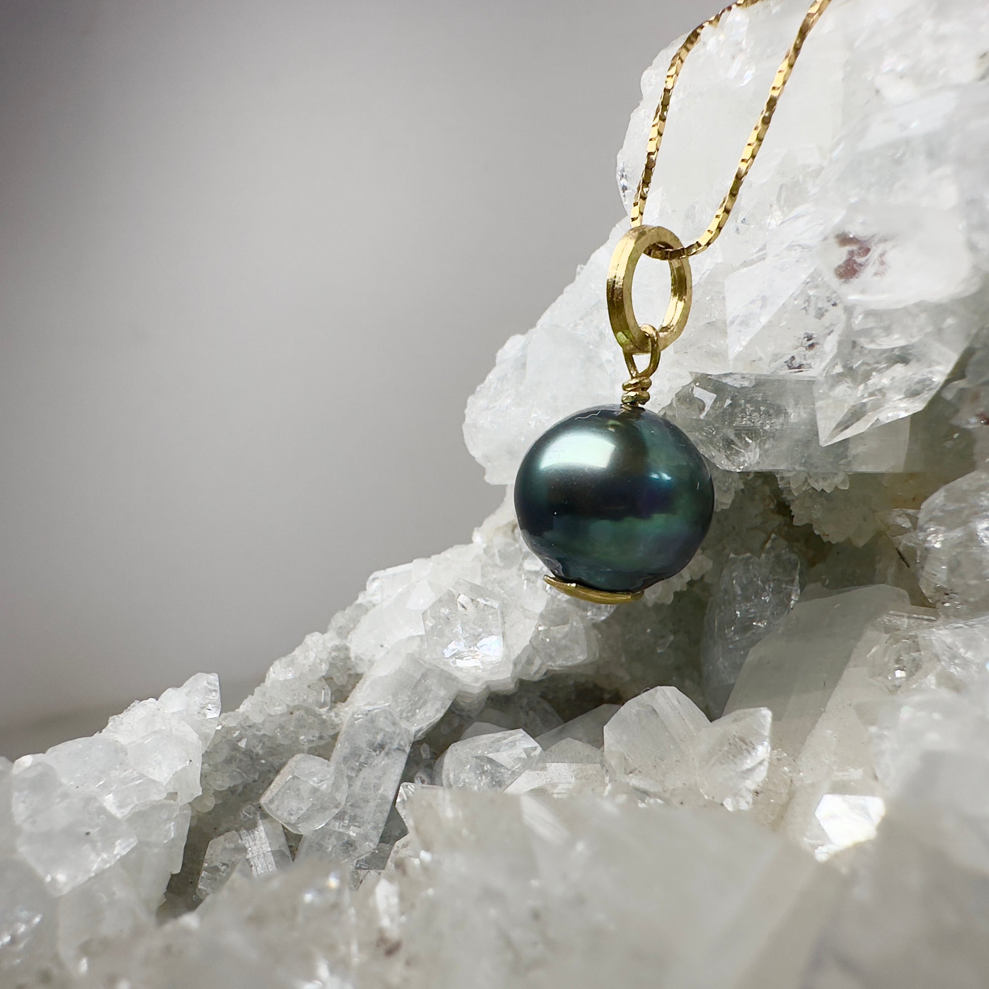 Embrace versatility and elegance with this unique Tahitian pearl charm. Crafted with meticulous attention to detail, this exquisite piece showcases a natural Tahitian pearl, which are known for their iridescent peacock hues and lustre. A handmade 18k yellow gold setting provides a warm, luxurious contrast to the pearl's deep tones
