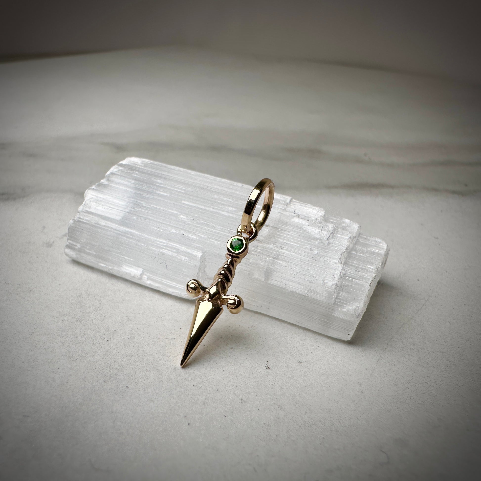 This solid gold dagger is the cherry on top for any charm stack, or stands by itself perfectly. It is made in 100% recycled 14k yellow gold, and is set with a 2.5mm natural green Tsavorite garnet. It has a minimalist style circular bail that is large enough to accomodate for a variety of chain styles and sizes.