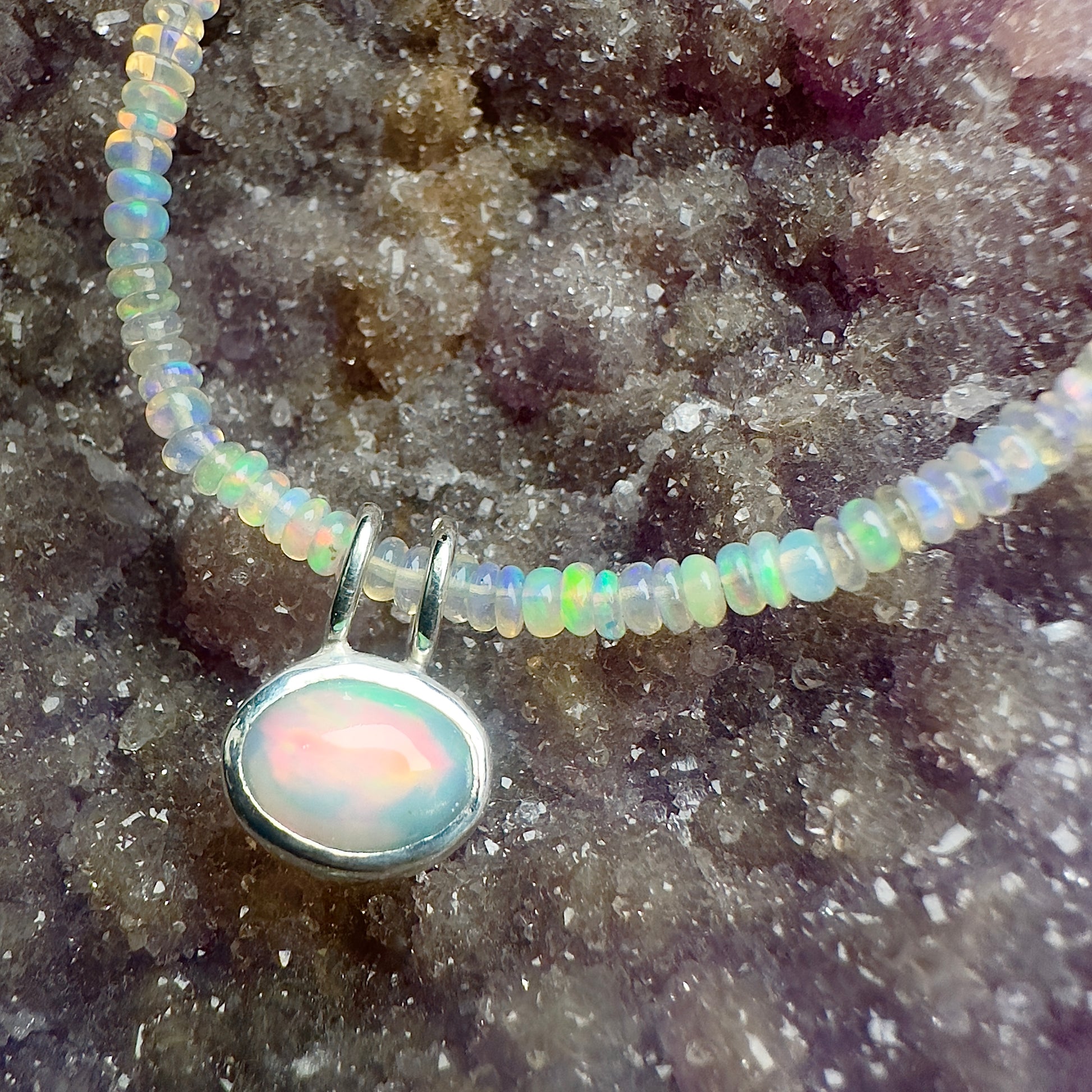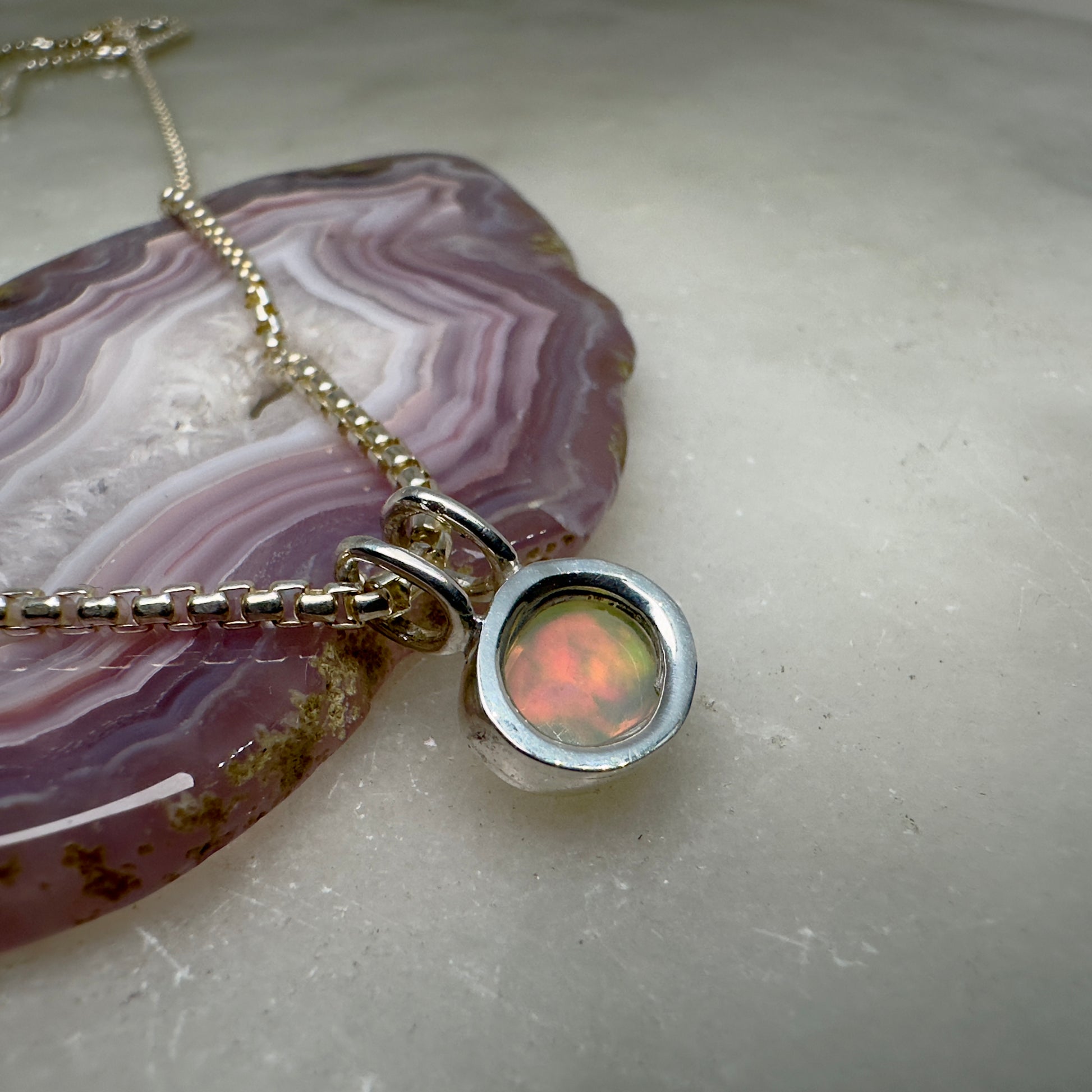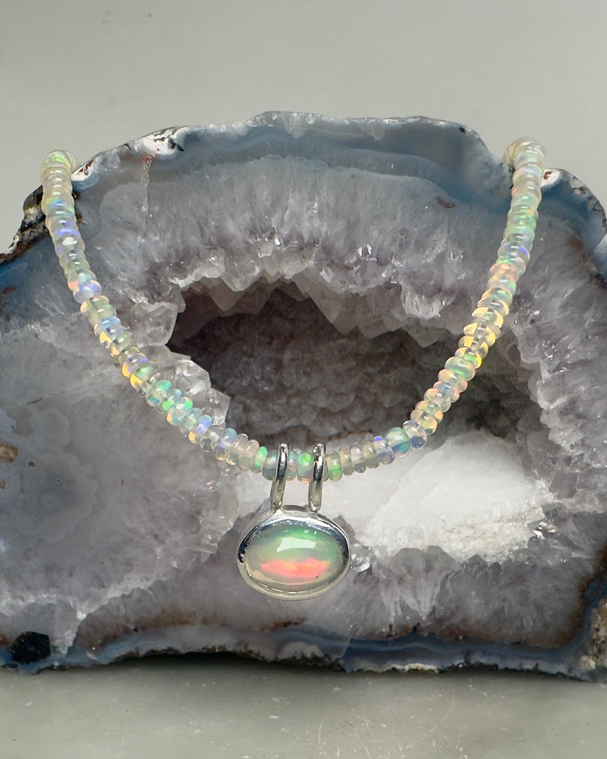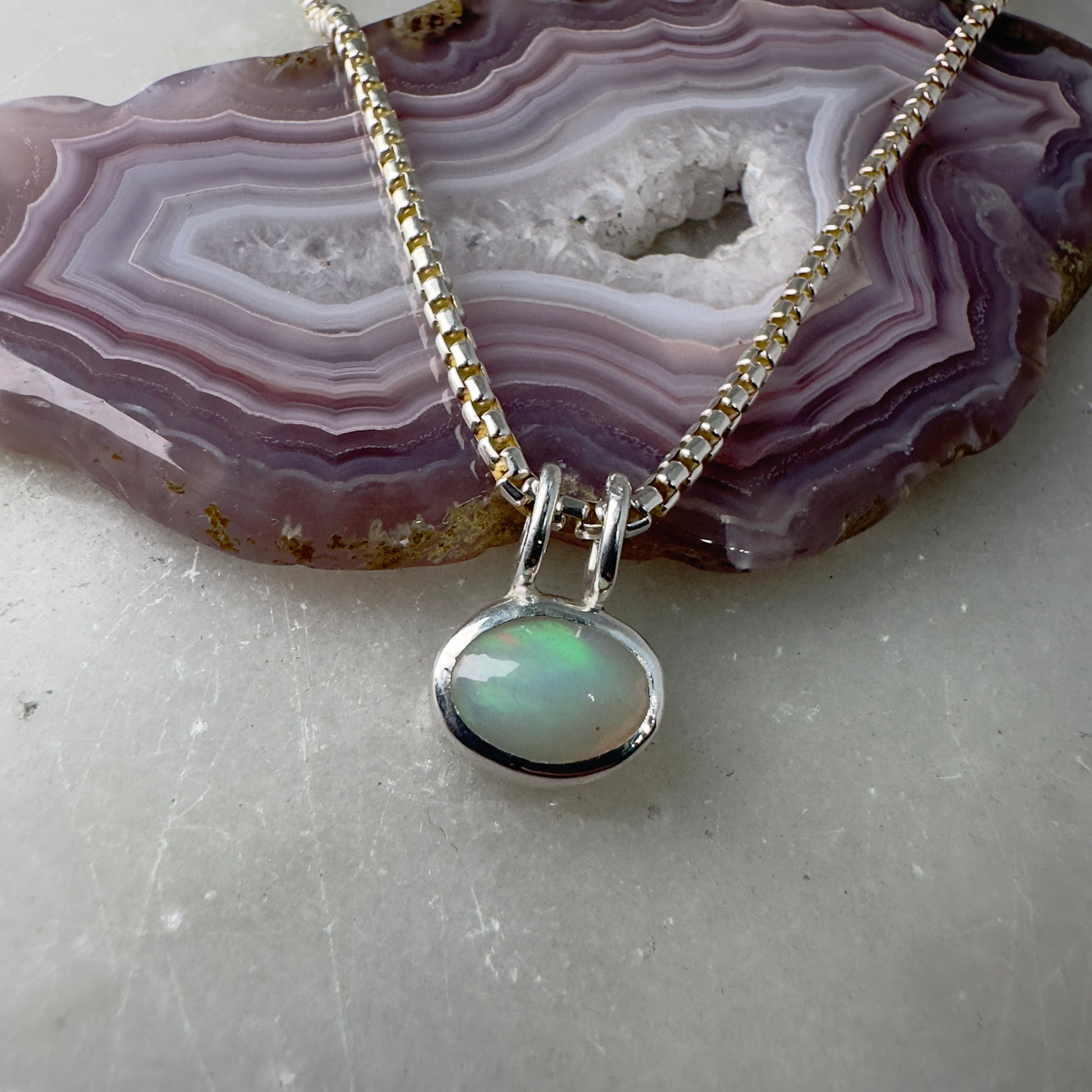 Featuring a prominent bail inspired by paperclip chain aesthetics, this pendant suits a variety of chain styles. Displayed with a polished Ethiopian opal beaded necklace (sold separately), its east-west orientation reinterprets the traditional minimalist pendant with a distinctive angle. Expertly crafted from highly polished sterling silver, this piece is made entirely from recycled silver, ensuring no freshly mined materials were used in its creation.