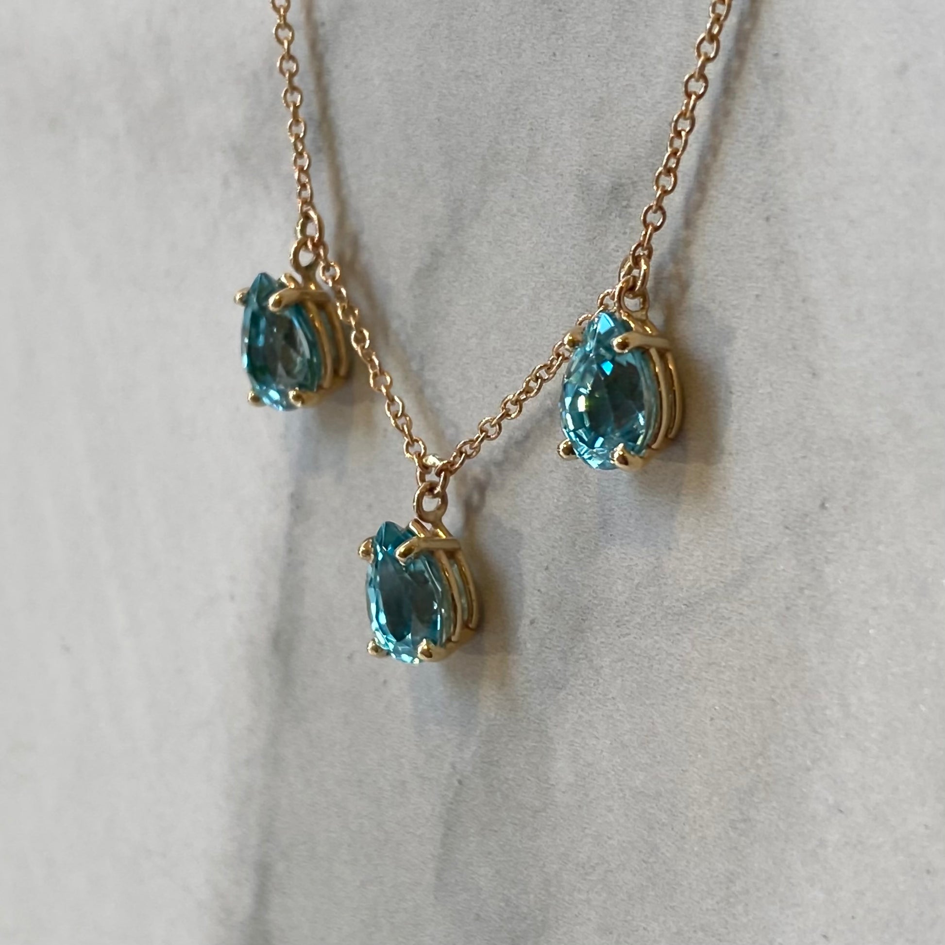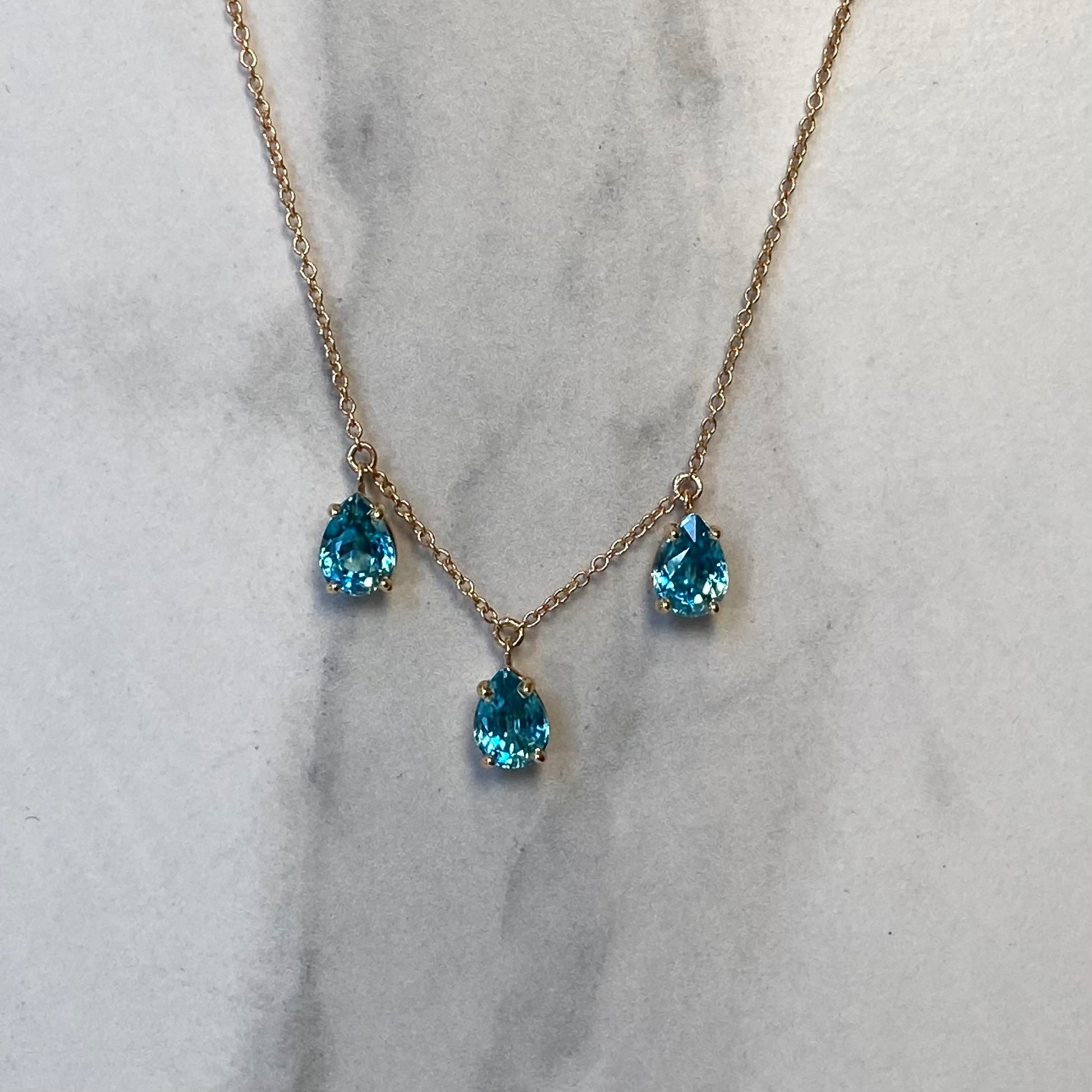 This necklace features a trio of Blue Zircons, which are perfectly matched for cut, color and proportion. This type of natural gemstone is known for its high refraction and dispersion, which makes this stone extremely sparkly! The way these stones were cut emphasizes these characteristics. Zircon is one of three birthstones for the month of December.